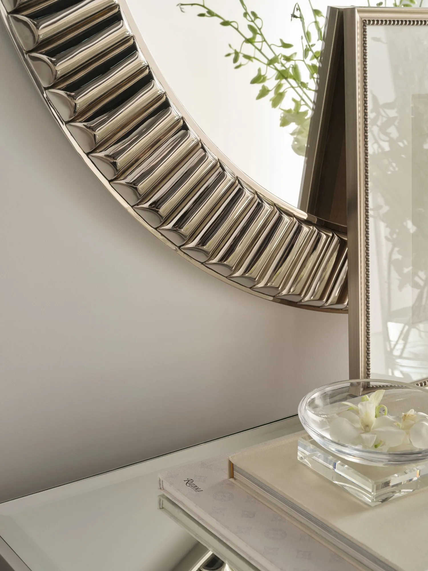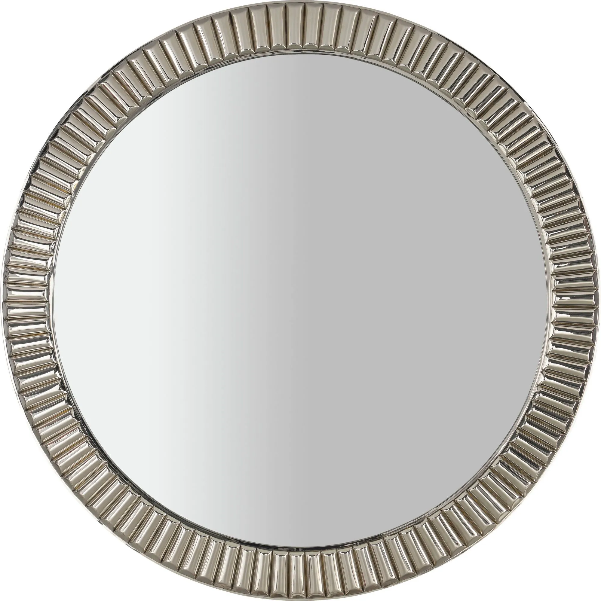 The Winter Solstice Mirror shimmers and shines like the bezel of a classic wristwatch. Its clear mirrored surface is surrounded by a frame made from nickel plated brass.