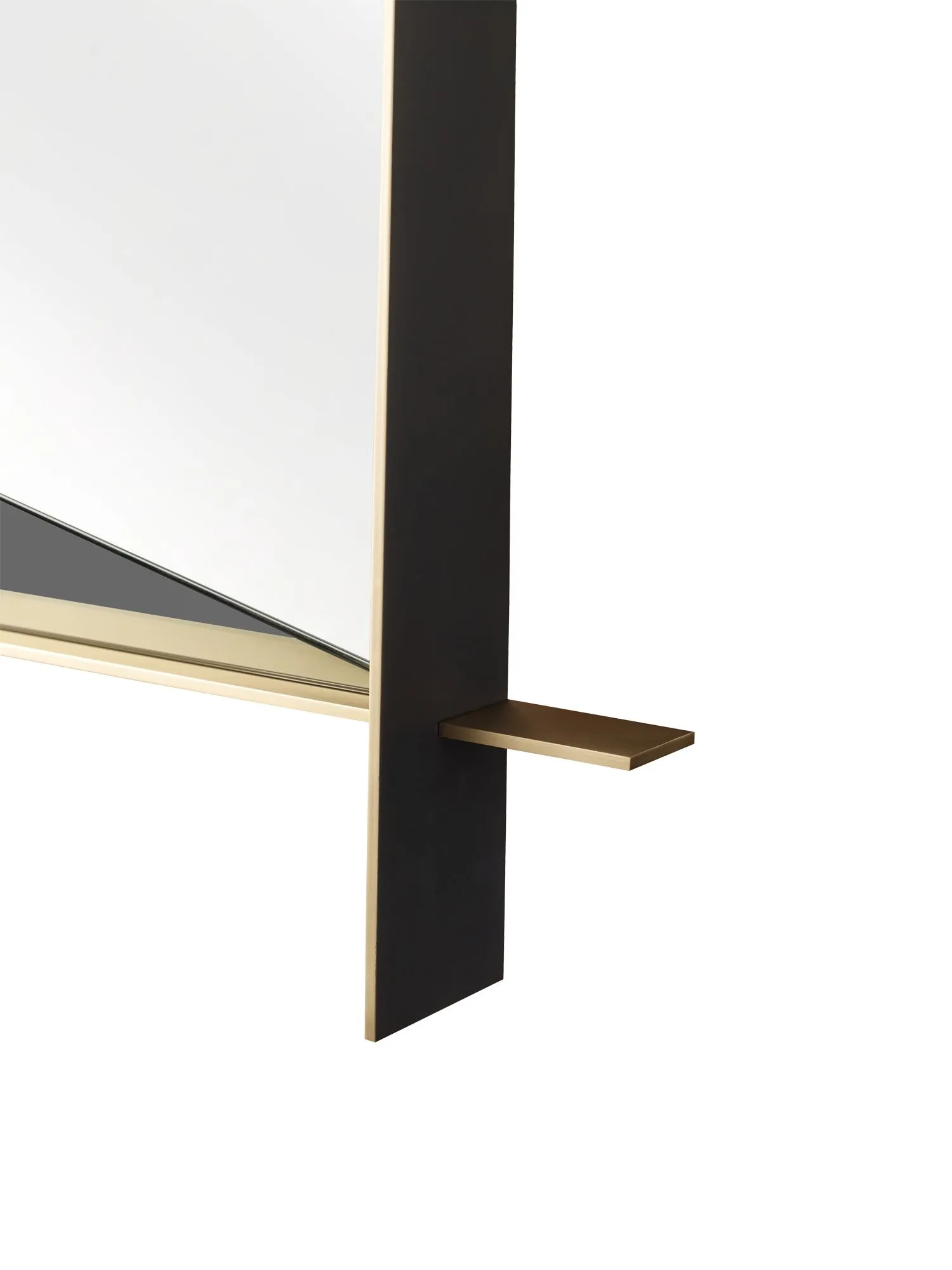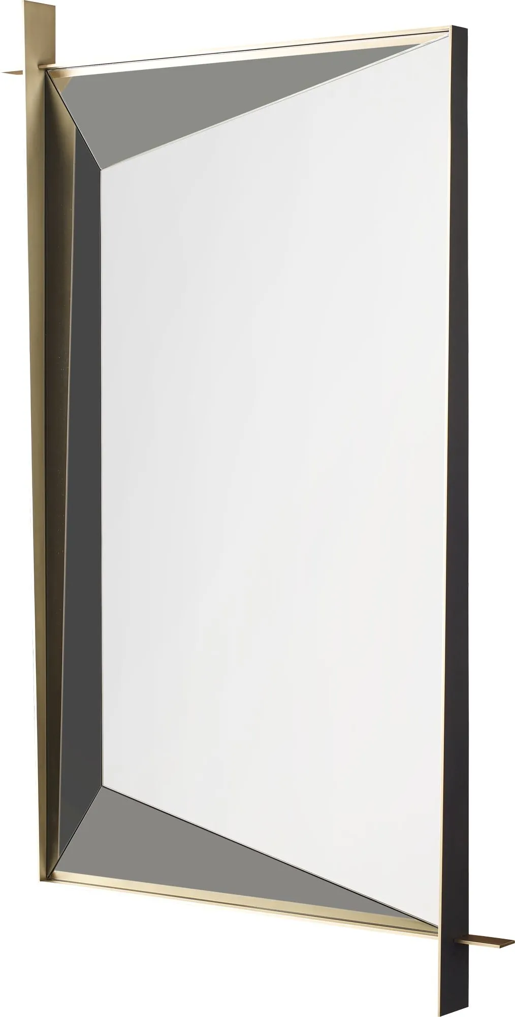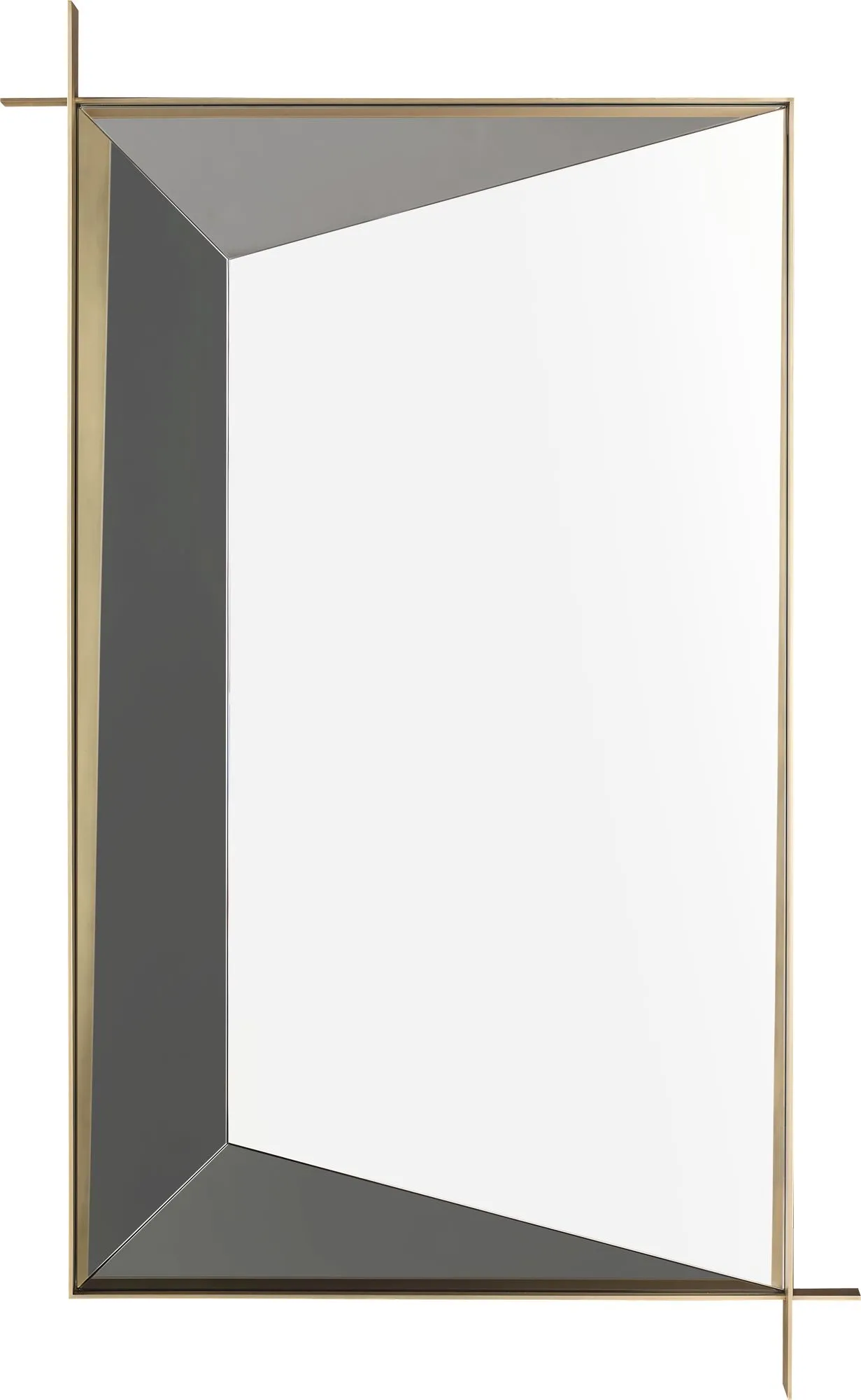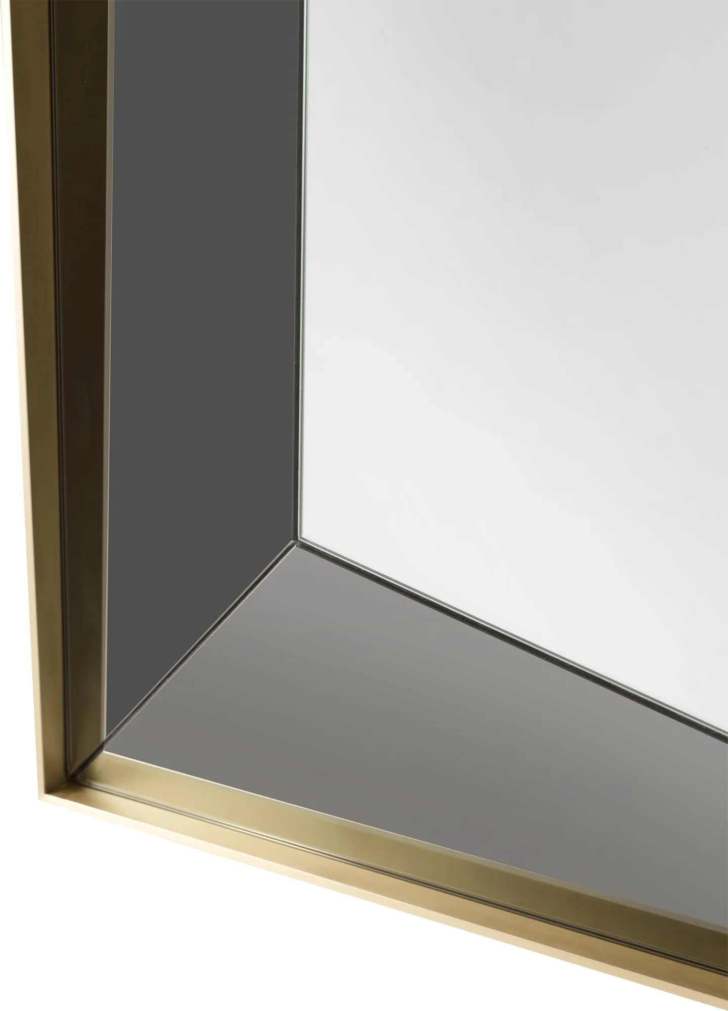Precisely executed brass frames a three-dimensionally faceted mirror. This mirror serves as a functional piece of art accenting any room.