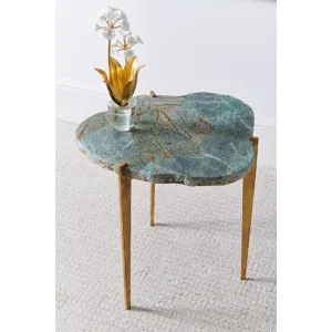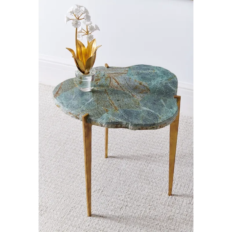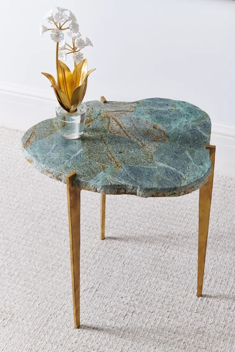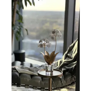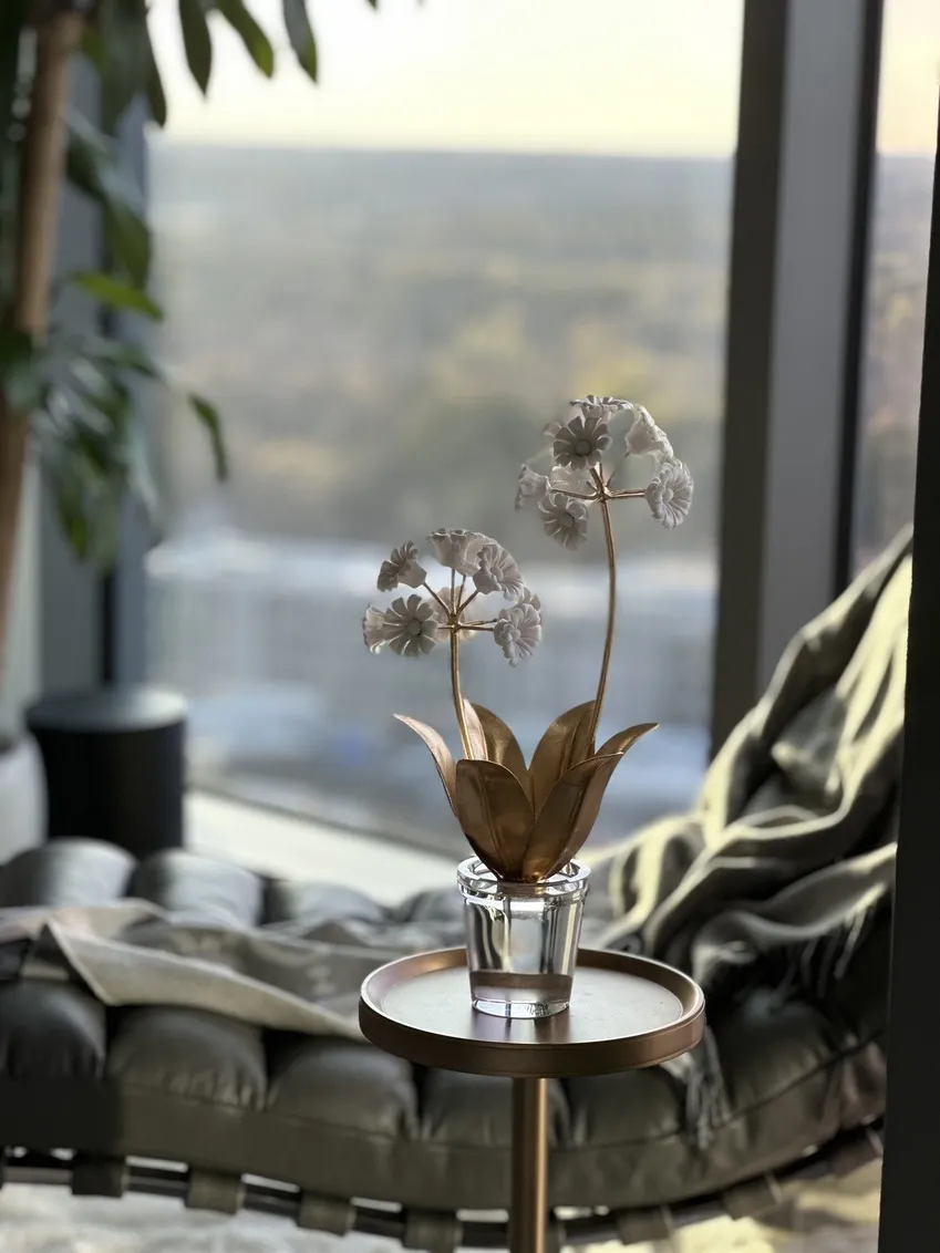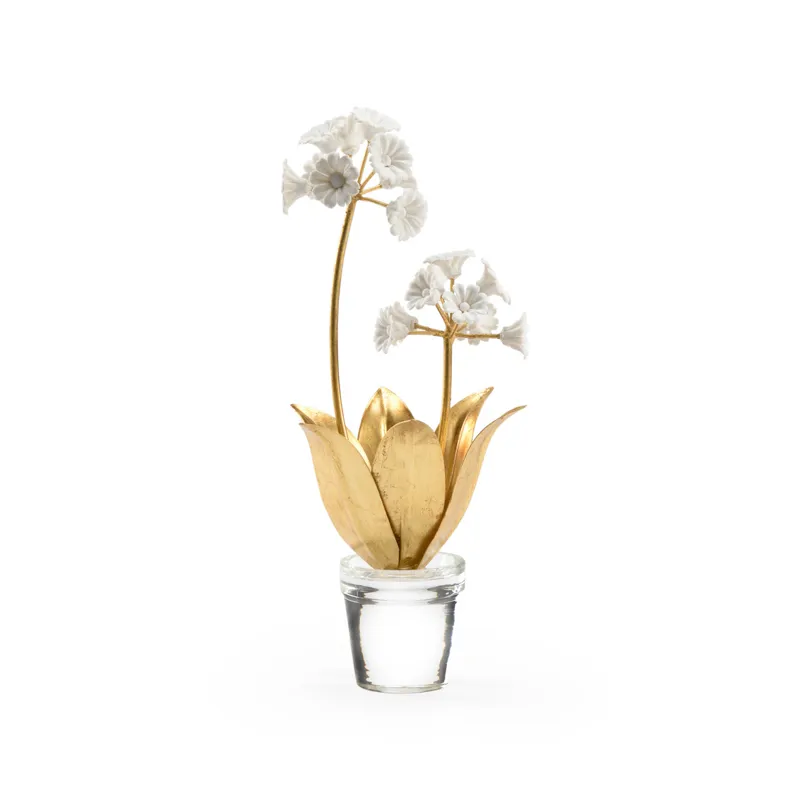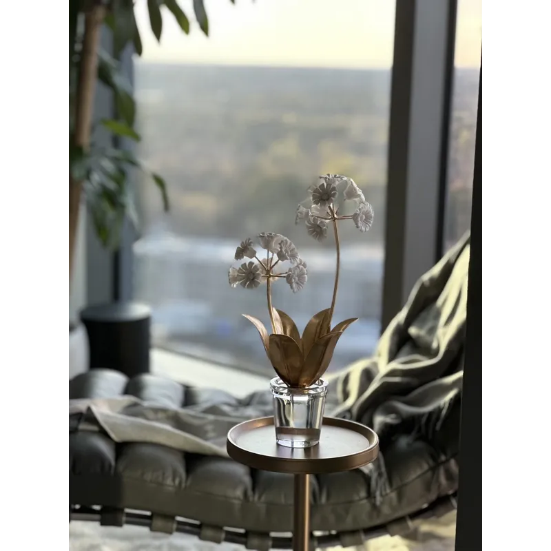 Hand formed porcelain auricula flowers on gold leaf iron stem in a crystal vase.