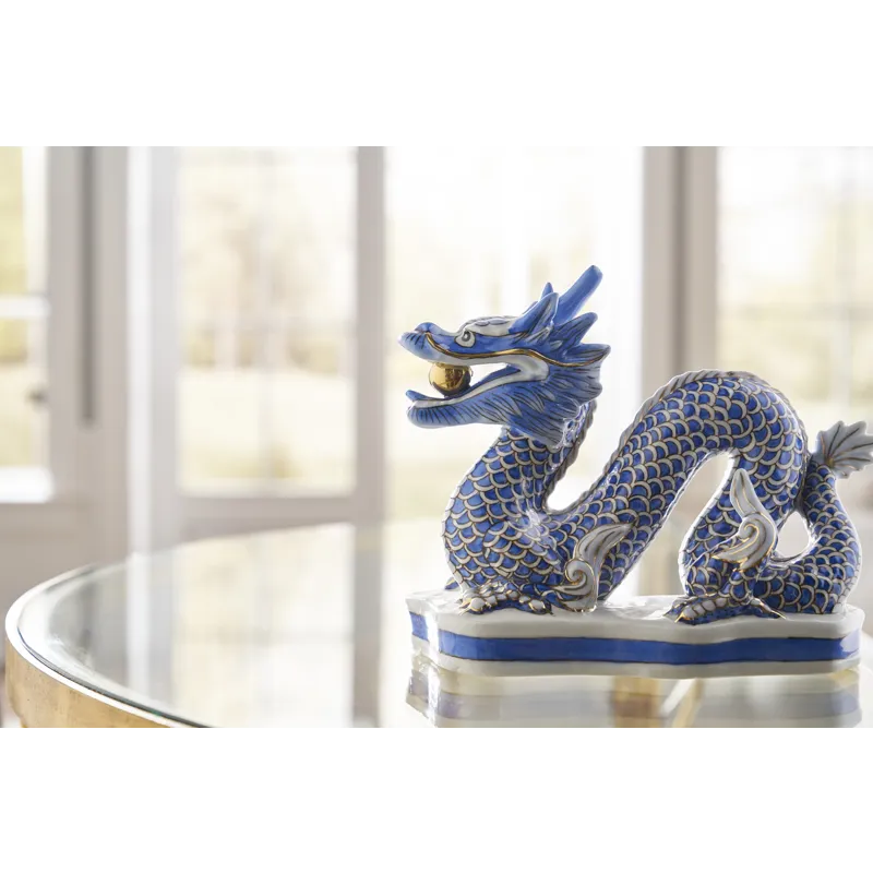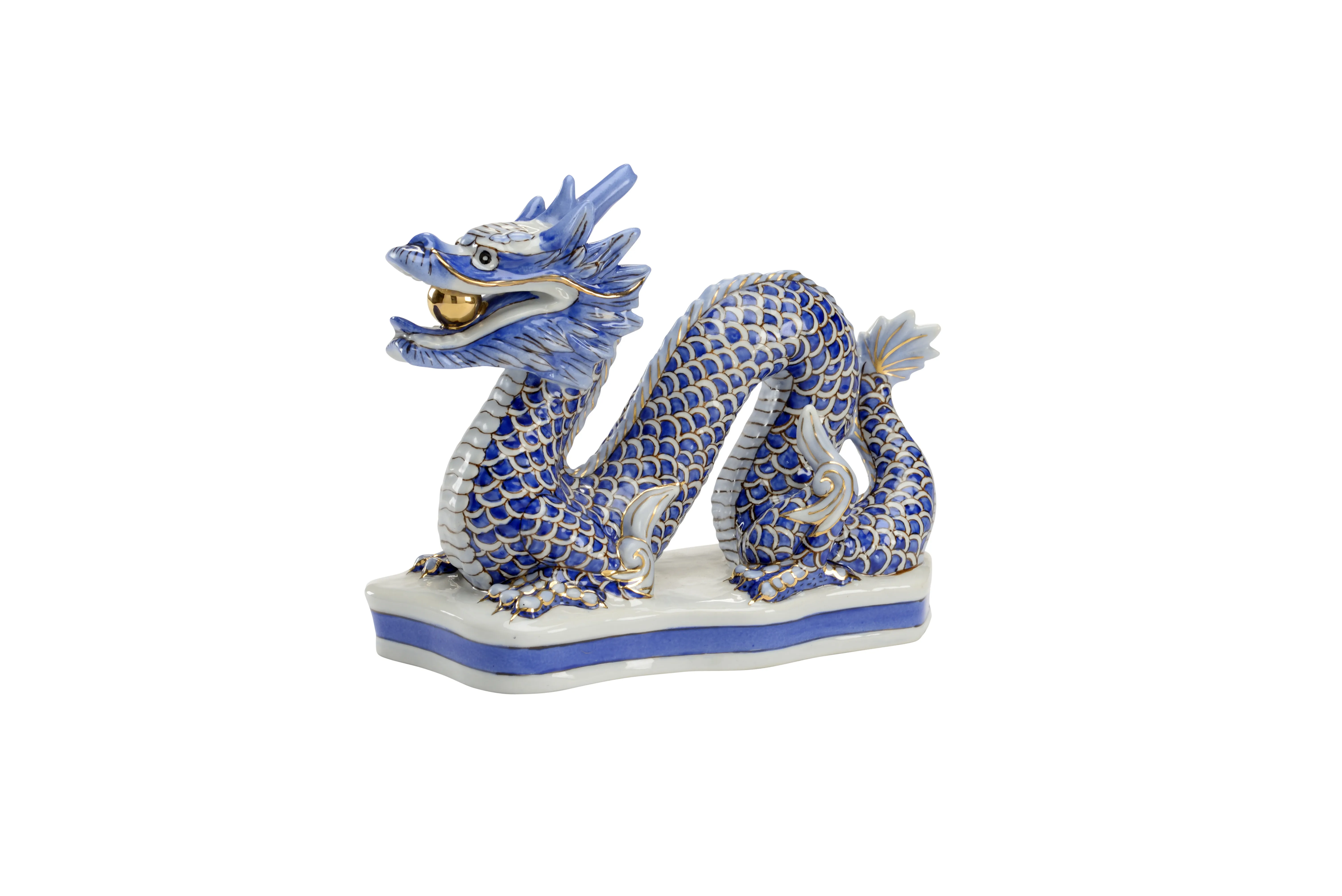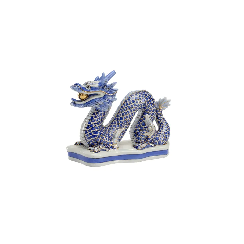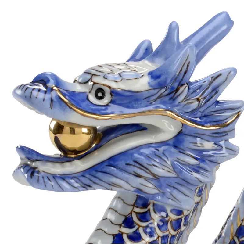 Blue and off white porcelain dragon with metallic gold details, hand painted.