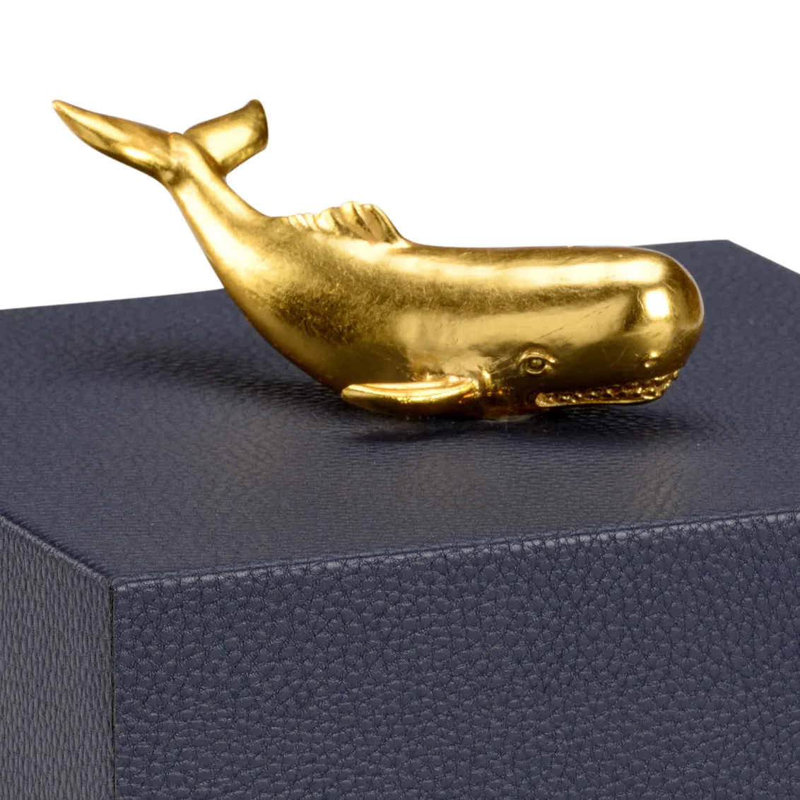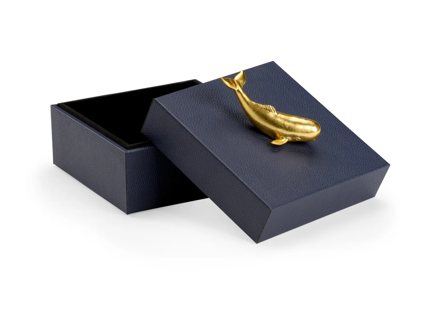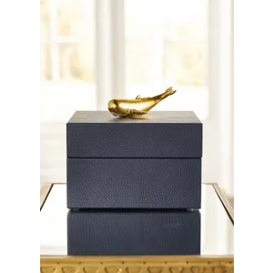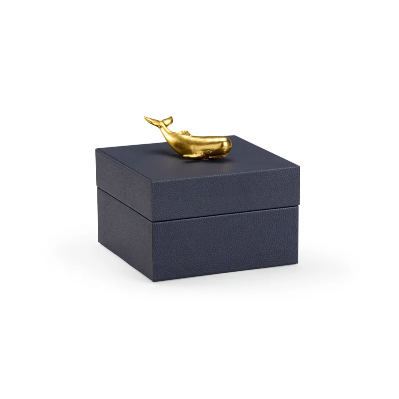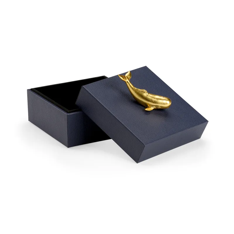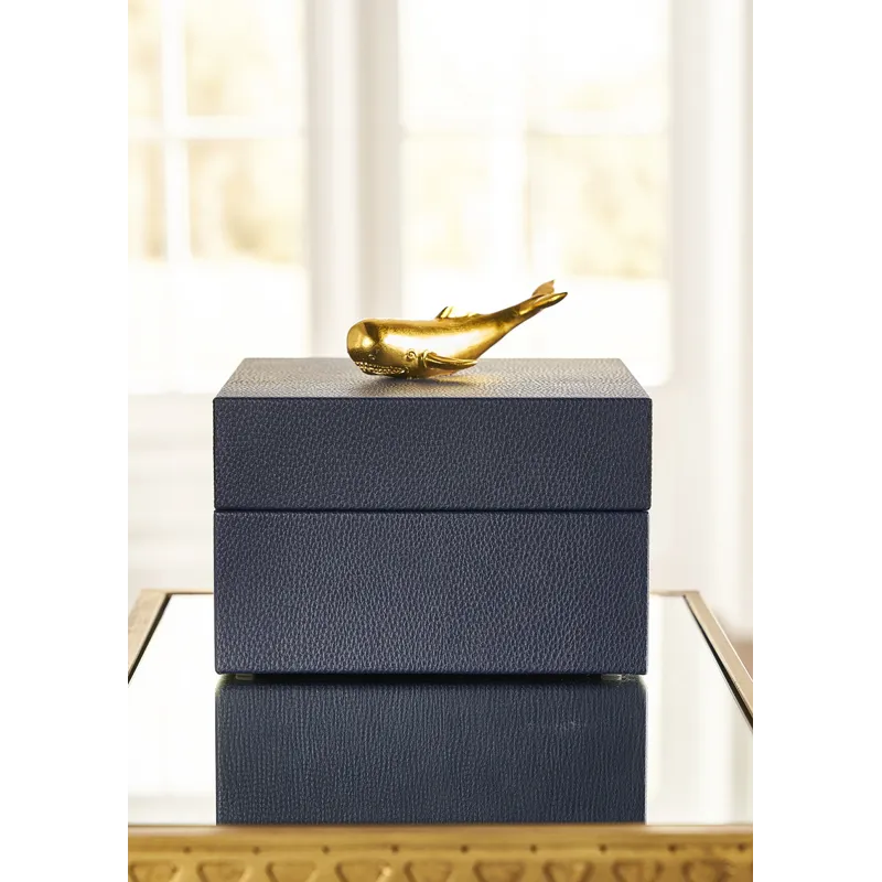 Felt lined wooden box covered in navy faux leather with a metallic gold whale accent.