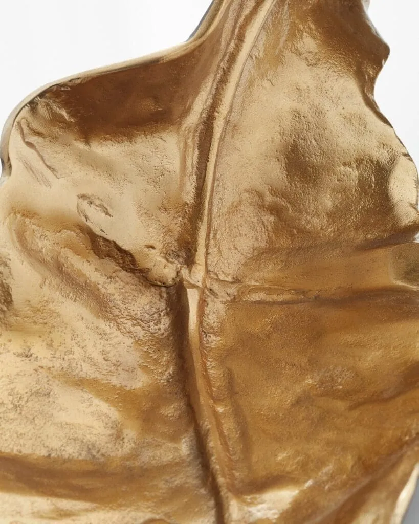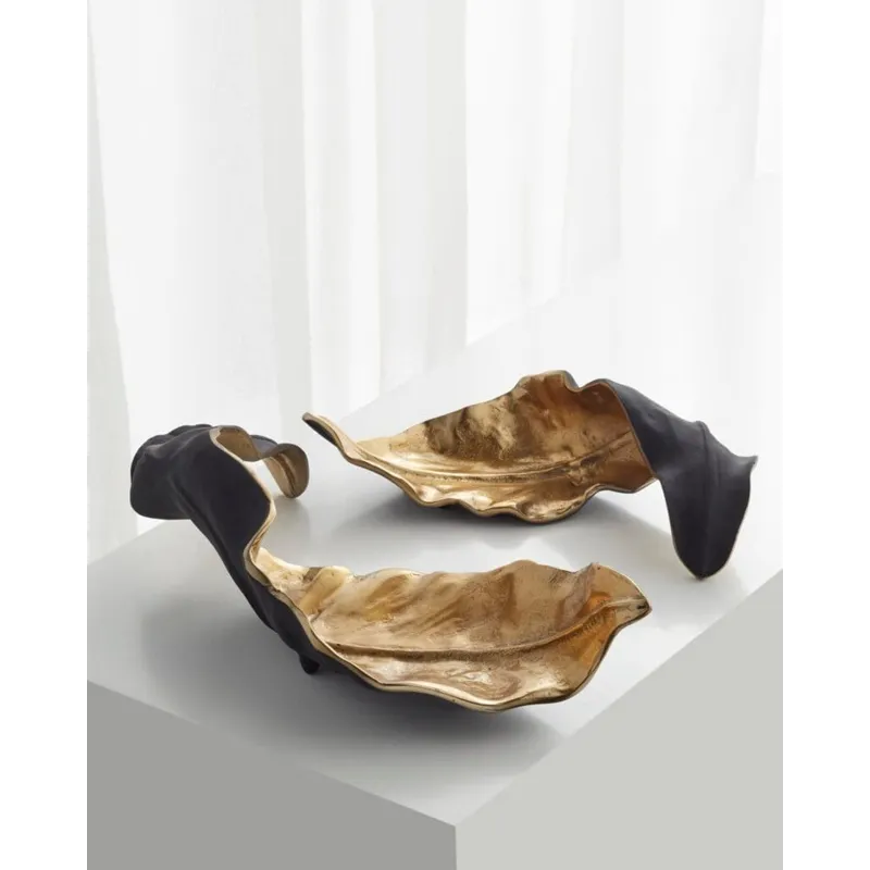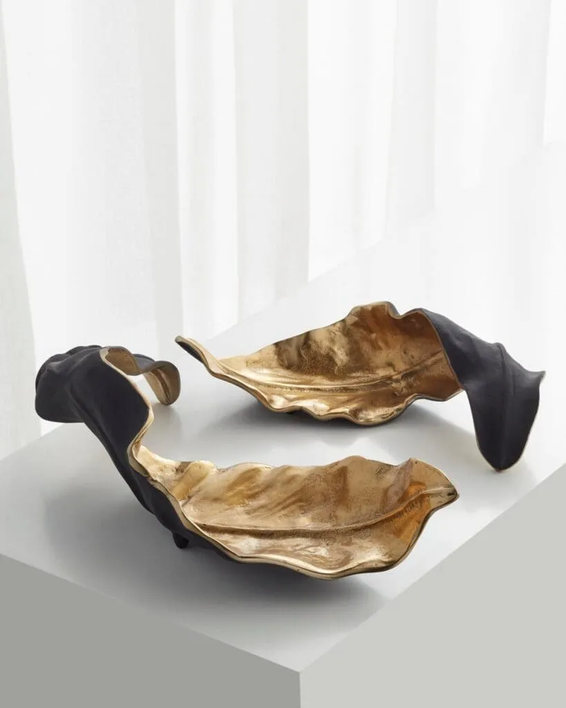 A beautiful way to add texture to a coffee or dining table, the Oak Brush tray is an artful addition to any ensemble. Crafted in lightweight aluminum, this platter features exceptional detail, creating a sense of realism in it’s resembles to a curling fall leaf. Two-toned matte black and gold finishes are a subtle component to transitional or contemporary decor.