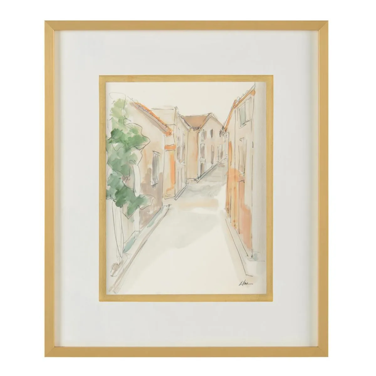 Jackie Ellen’s Street Scene is reproduced on watercolor paper. Mounted on a gold leaf background. A Hand painted top surrounds the overall design. Framed in a narrow gallery molding with a gold finish.