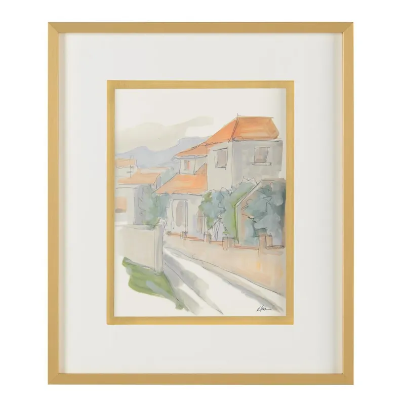 Jackie Ellen’s Street Scene is reproduced on watercolor paper. Mounted on a gold leaf background. A Hand painted top surrounds the overall design. Framed in a narrow gallery molding with a gold finish.