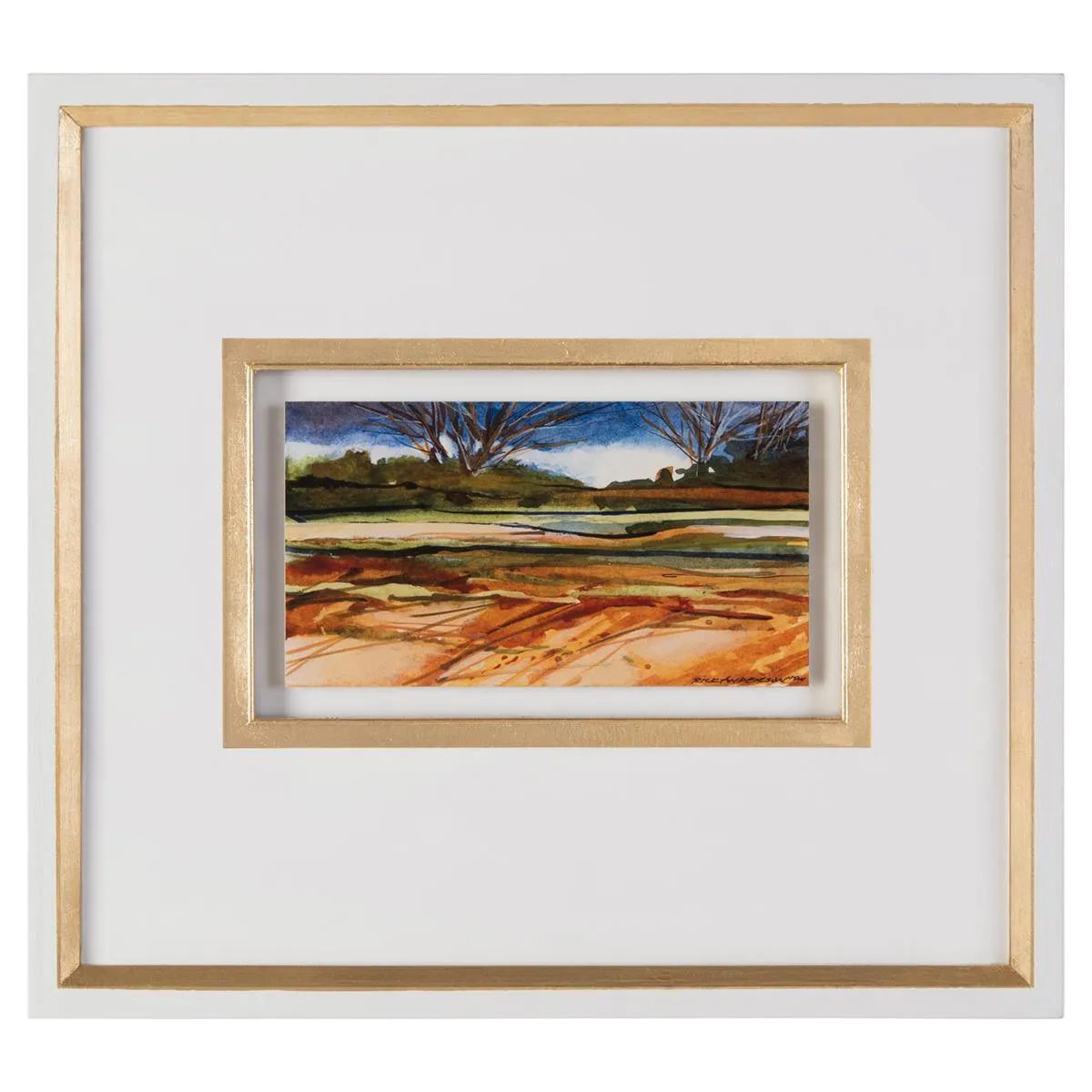 Something In The Orange by artist Rick Anderson showcases a gorgeous landscape realized in watercolor on canvas. Bordering the artwork is a gold fillet amongst a white background, imbuing the rural motif with a splash of opulent flair. The piece is gently nestled within a matching white frame with gold accents and steel hangers, completing the look.
