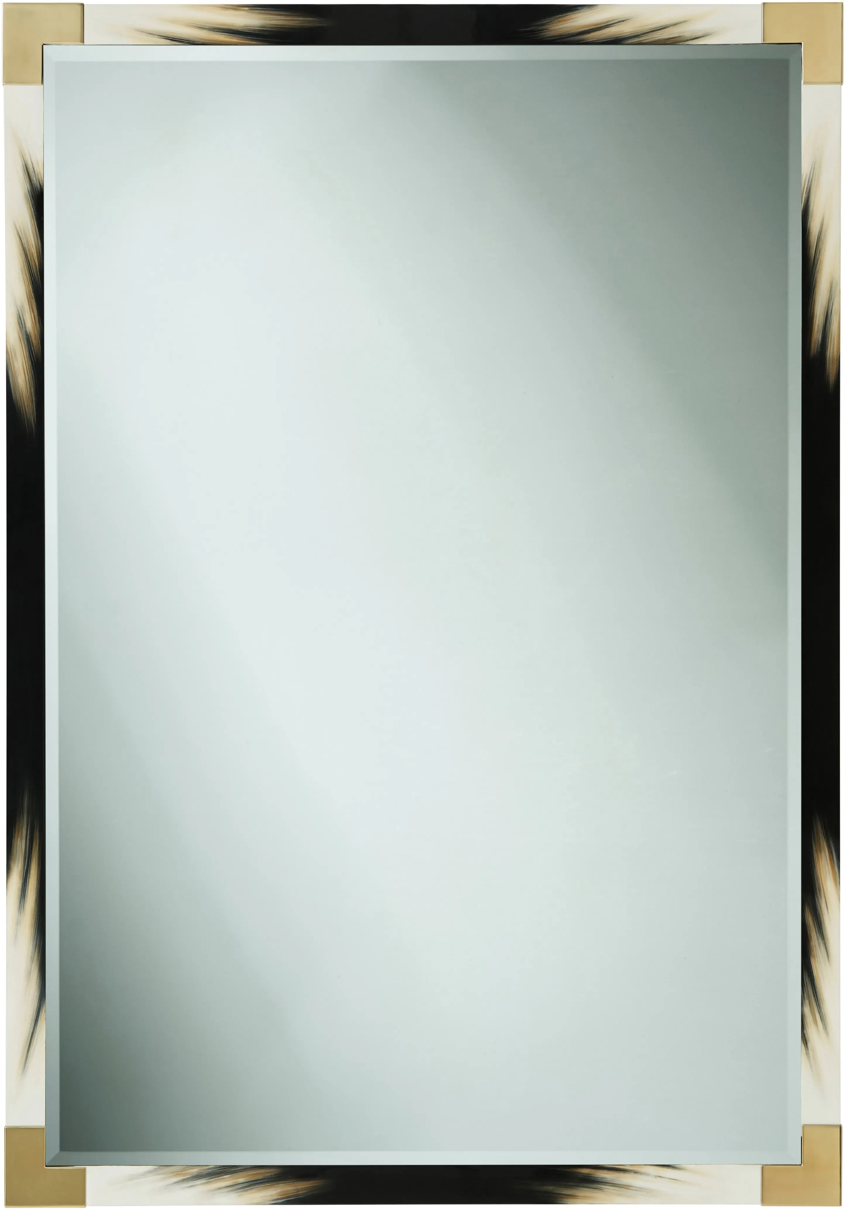 Rectangular black lacquered faux-horn mirror with brass edged corners and a bevelled edge plate.