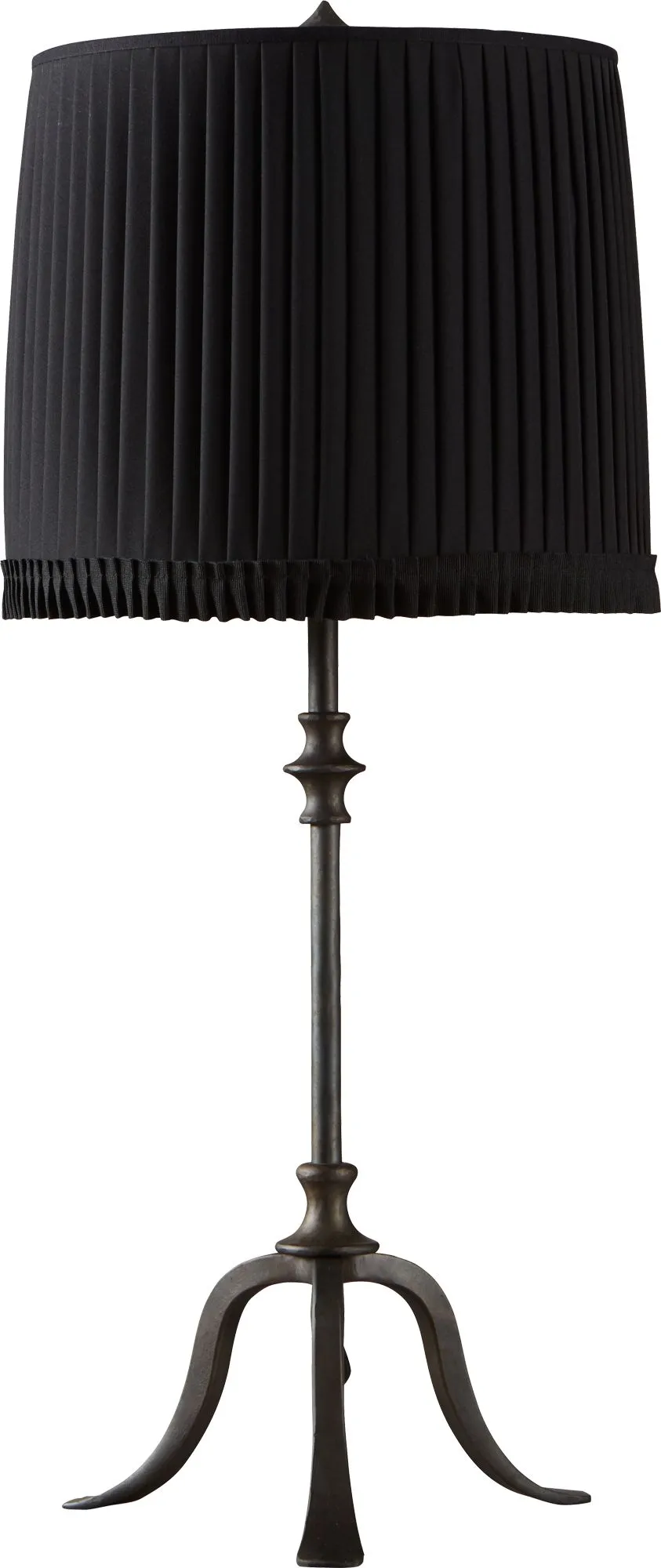 Forged iron base and cotton pleated shade with ribbon frill detail.