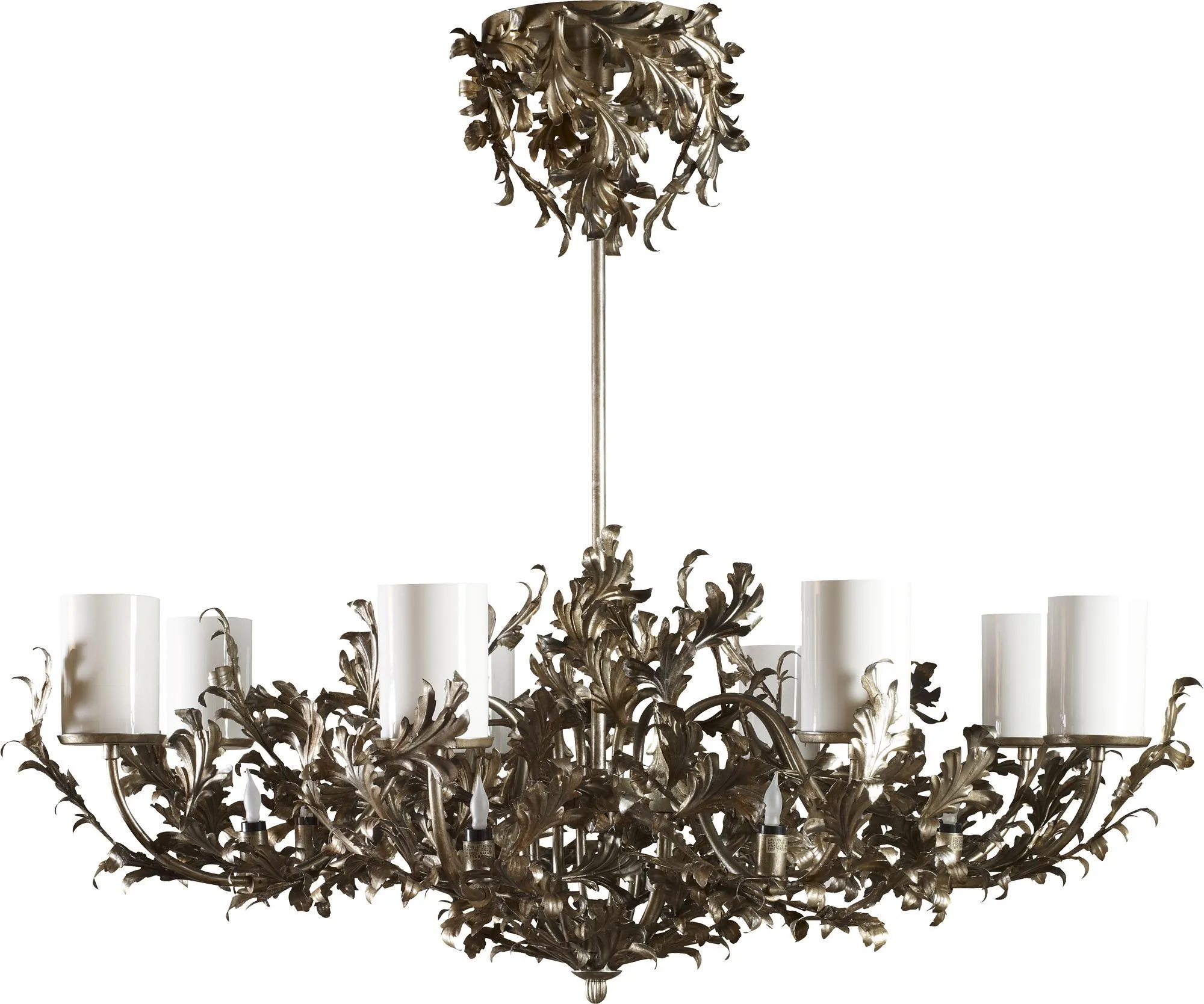 This Art Nouveau-inspired chandelier is an original design from Bill Sofield. Rather than the heaviness seen in period examples, the Valerian has a lighter and more festive look. With dramatic scale and delicate ornament, the result is more stunning than formal. Equally at home in a dining room, great room, or statement entry. A wreath of individual shaped and welded steel leaves comes in a heavily antiqued White Gold Leaf. A lower ring of flame-like bulbs illuminate the entwined foliage while a group of eight distinctive bone china shades soften the glow of the featured lighting. The canopy has its own leaf-like ornament, and the column appears with the same White Gold Leaf finish.