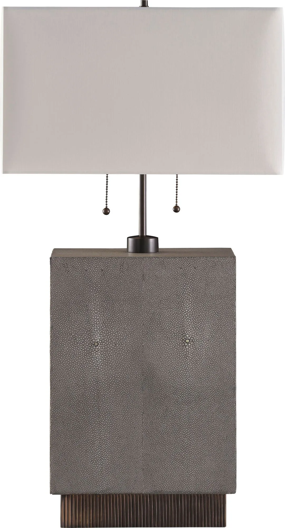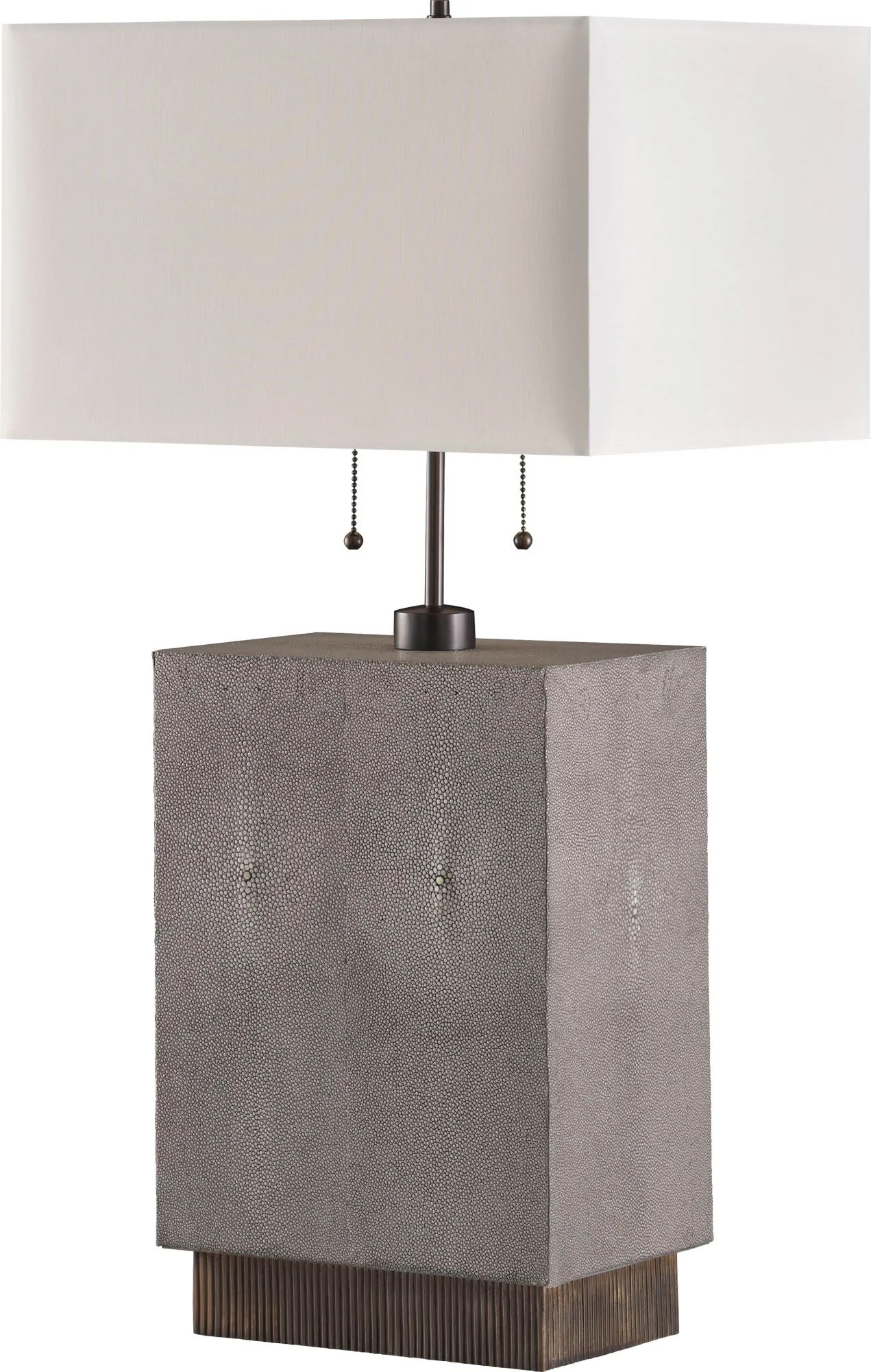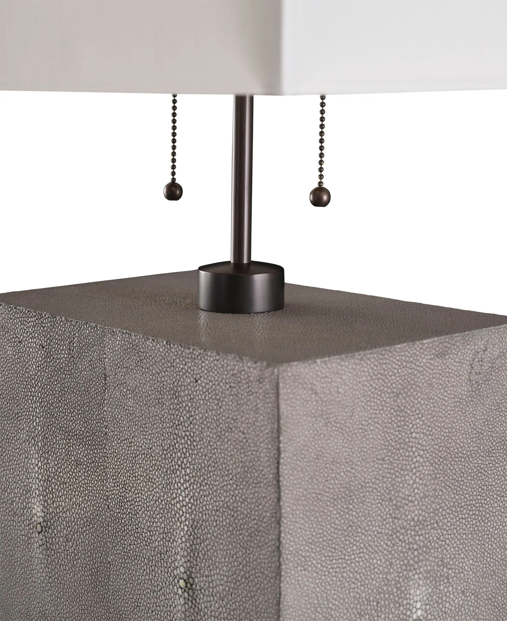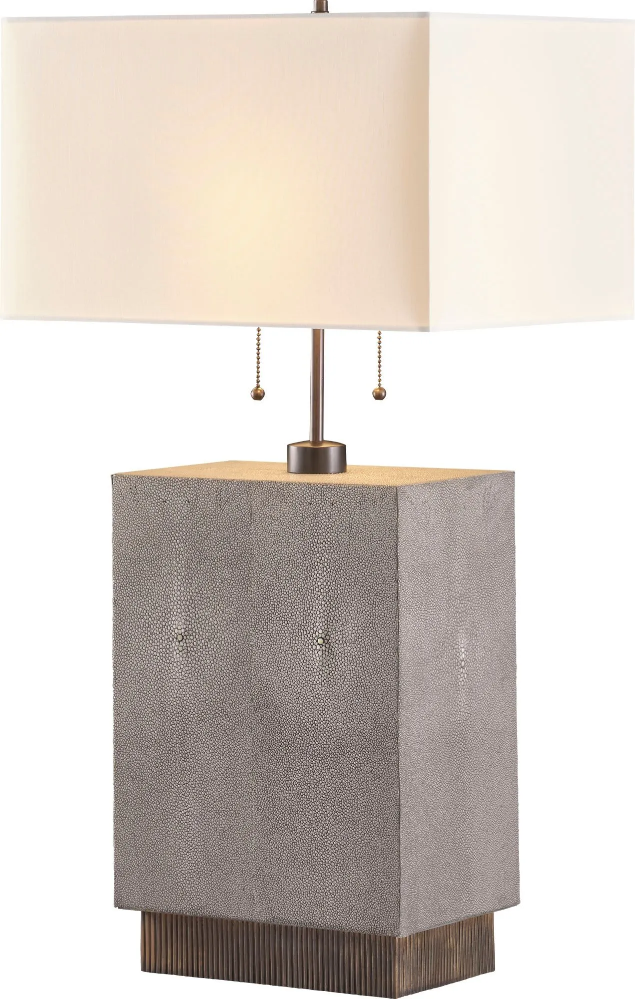 Carefully wrapped in genuine shagreen with textured brass accents, the Scoria Table Lamp is evocative of the dark volcanic rock that displays a uniquely bubbled texture. Its pull-chain design is inspired by the chimera, a firebreathing creature from Greek mythology that represents untamed power.