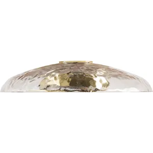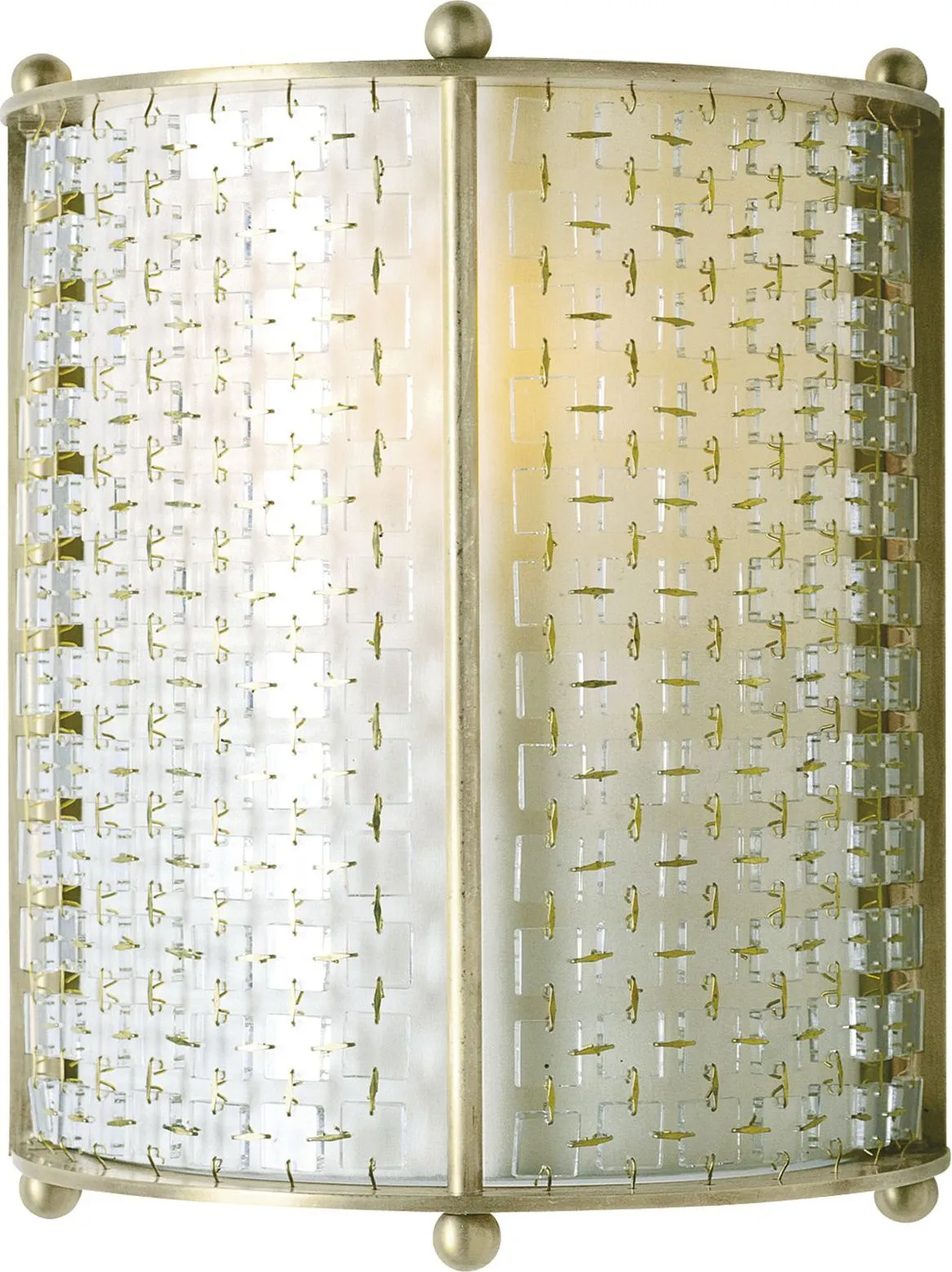 A unique, one-light sconce provides a glittering, yet softly diffused light from its Ivory chinette shade, elegantly sheathed in brilliant glass tiles. A patinaed brass frame finishes the piece.