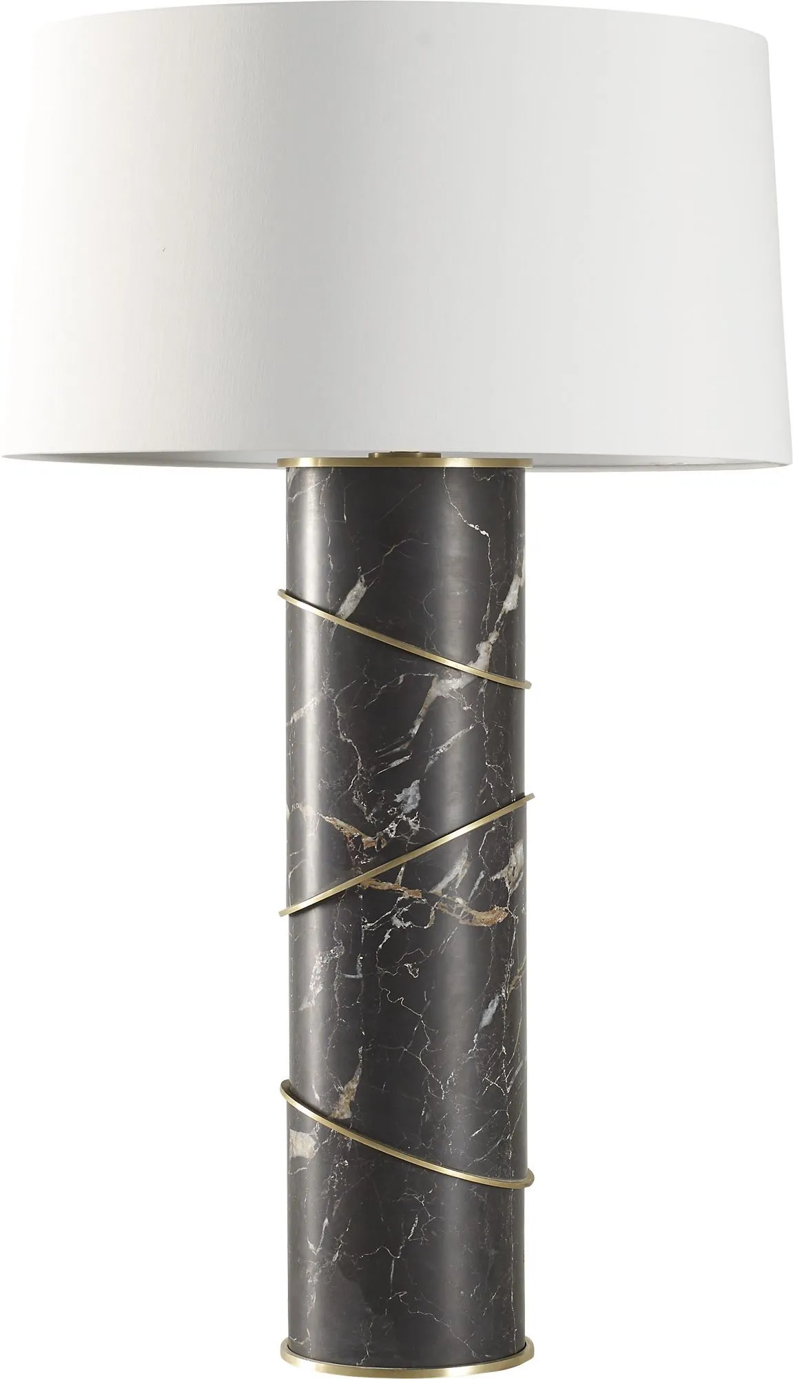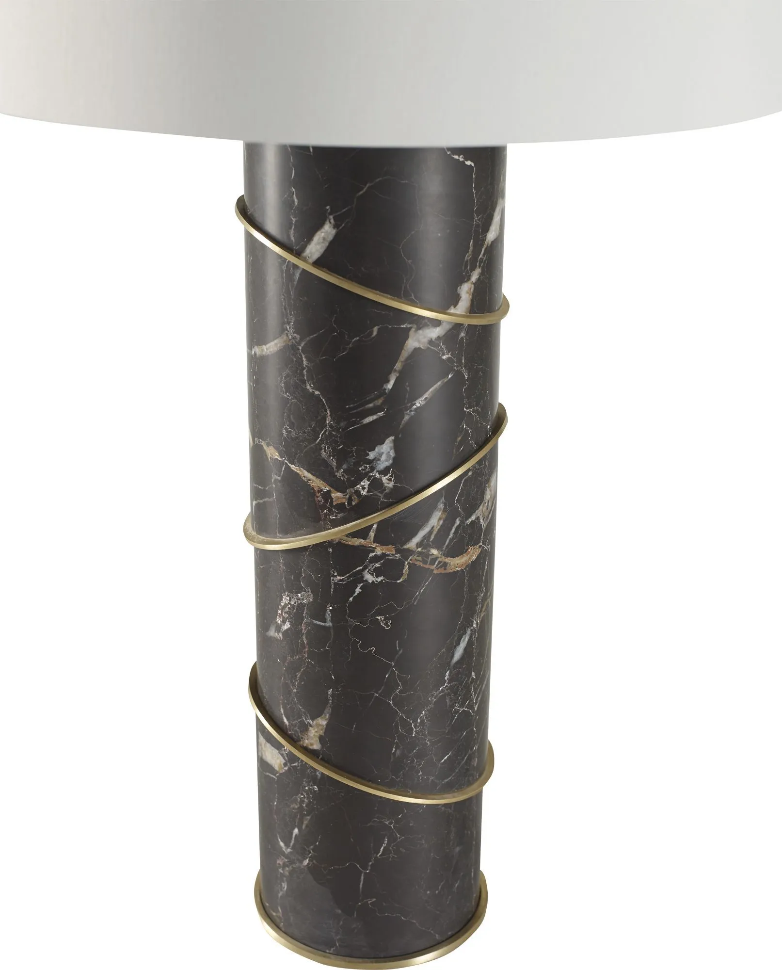 The minimalist form of this sophisticated lamp celebrates form and material. A smooth marble base is accented with thoughtfully placed angled brass rings. It will be sure to add a touch of luxury to any home.