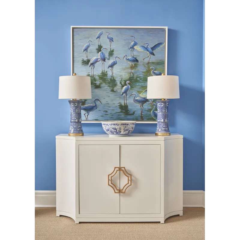 Floral patterned panels hand painted in blue and white on ceramic with an antique gold leaf mounting an accents. Hand painted.