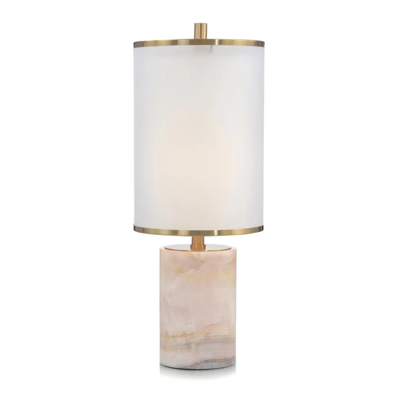 This rosé stone column table lamp has accents of brass banding on its shade.