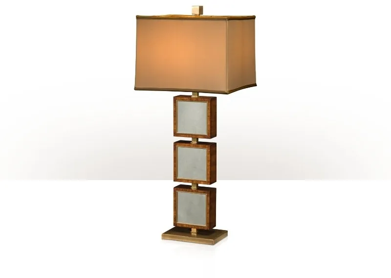 A Hyedua and antiqued mirror table lamp, the body of three square sections with antique mirror panels above a brass plinth base and surmounted by a hand sewn box shade.