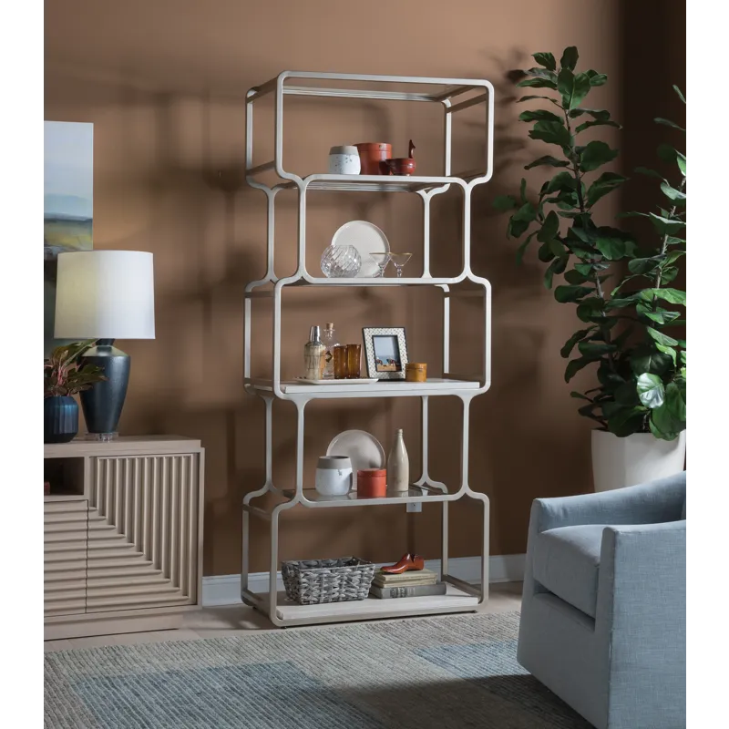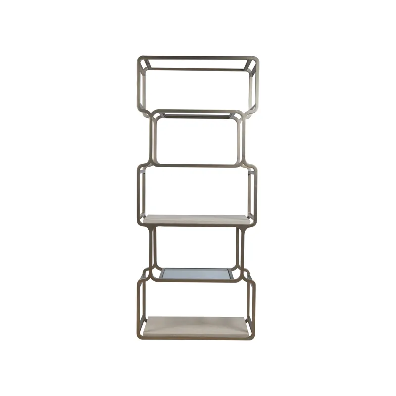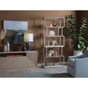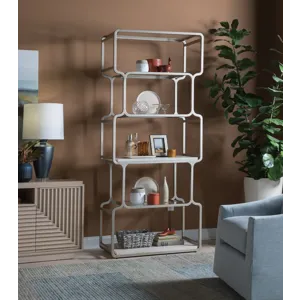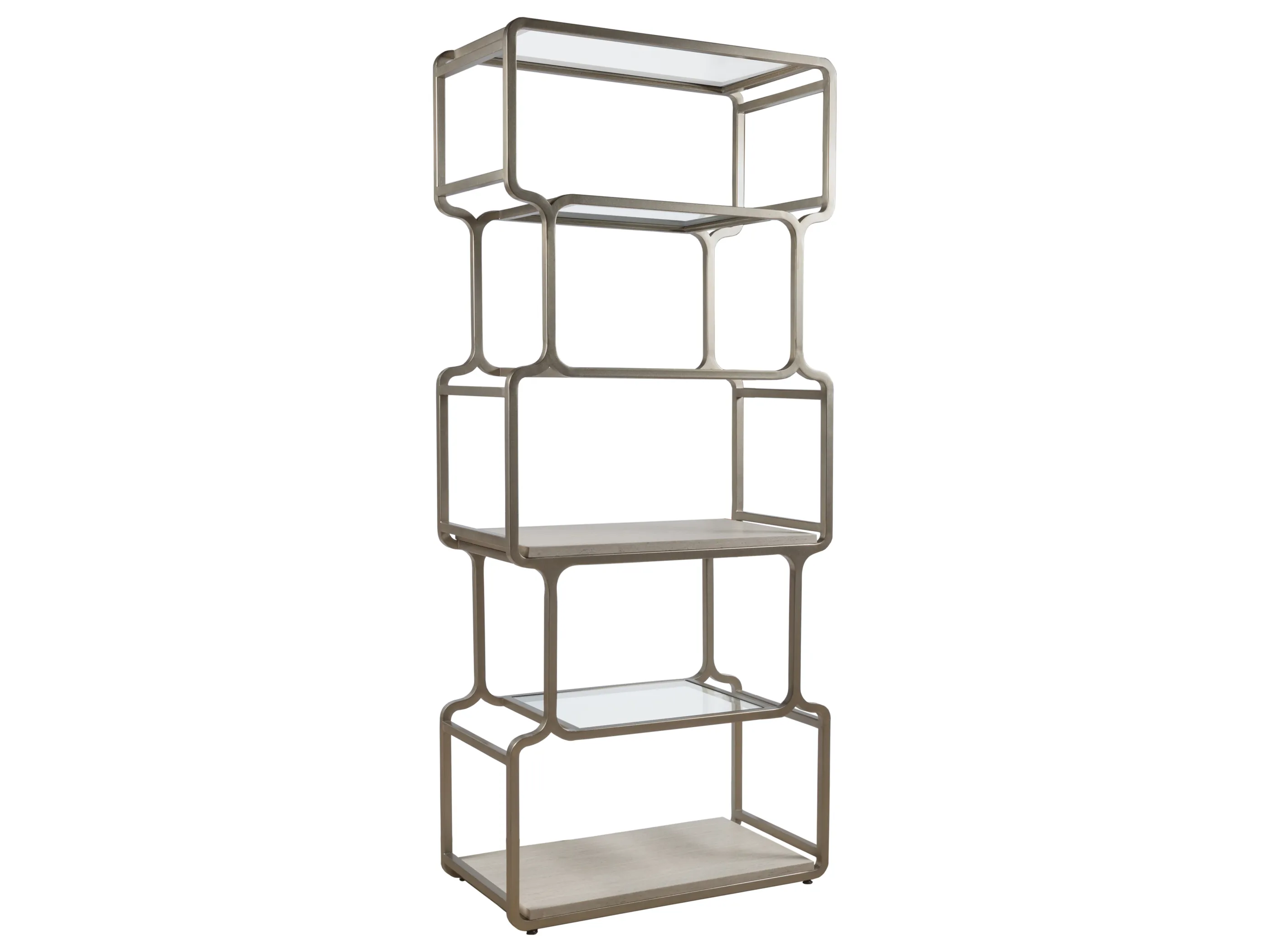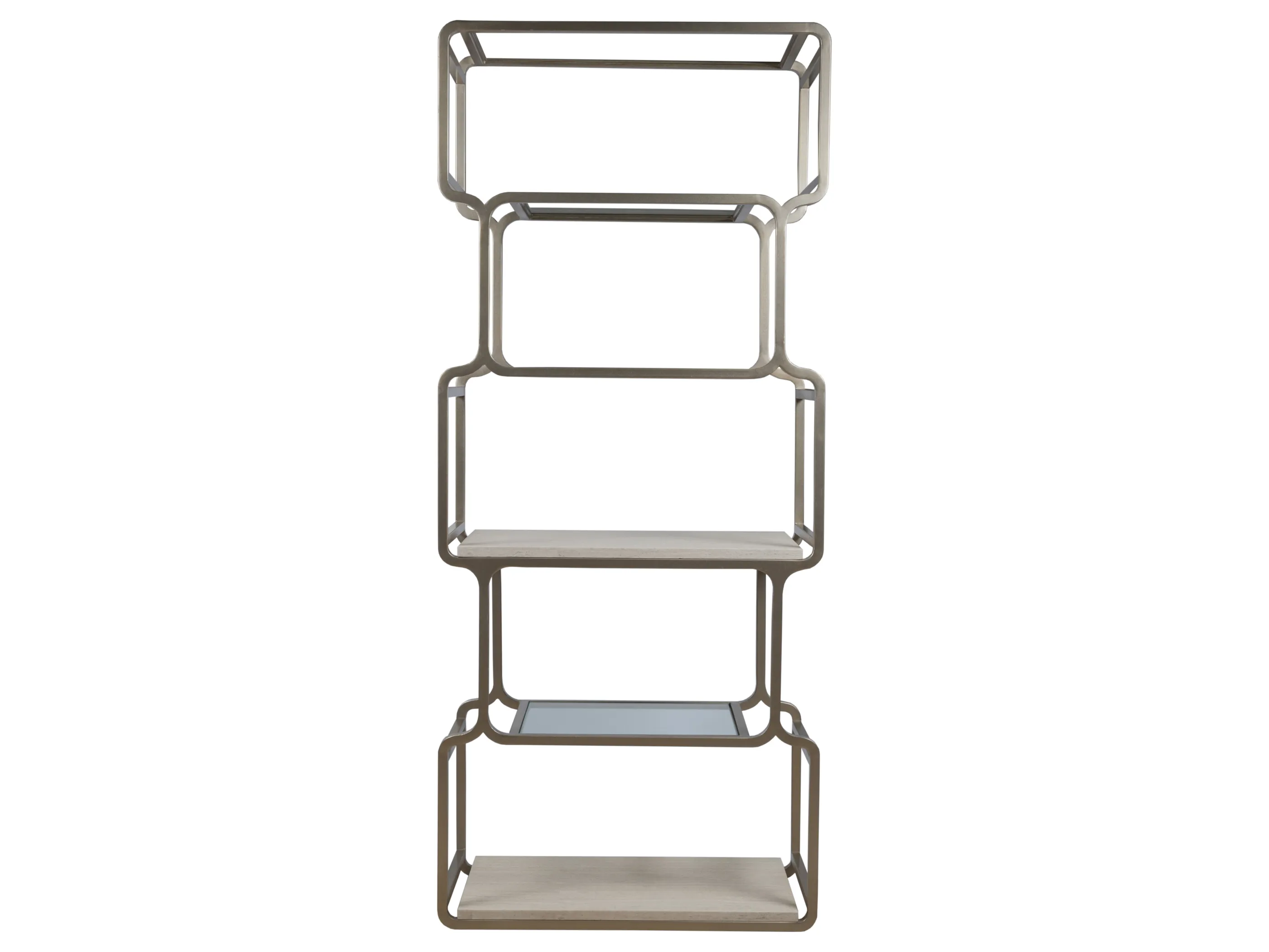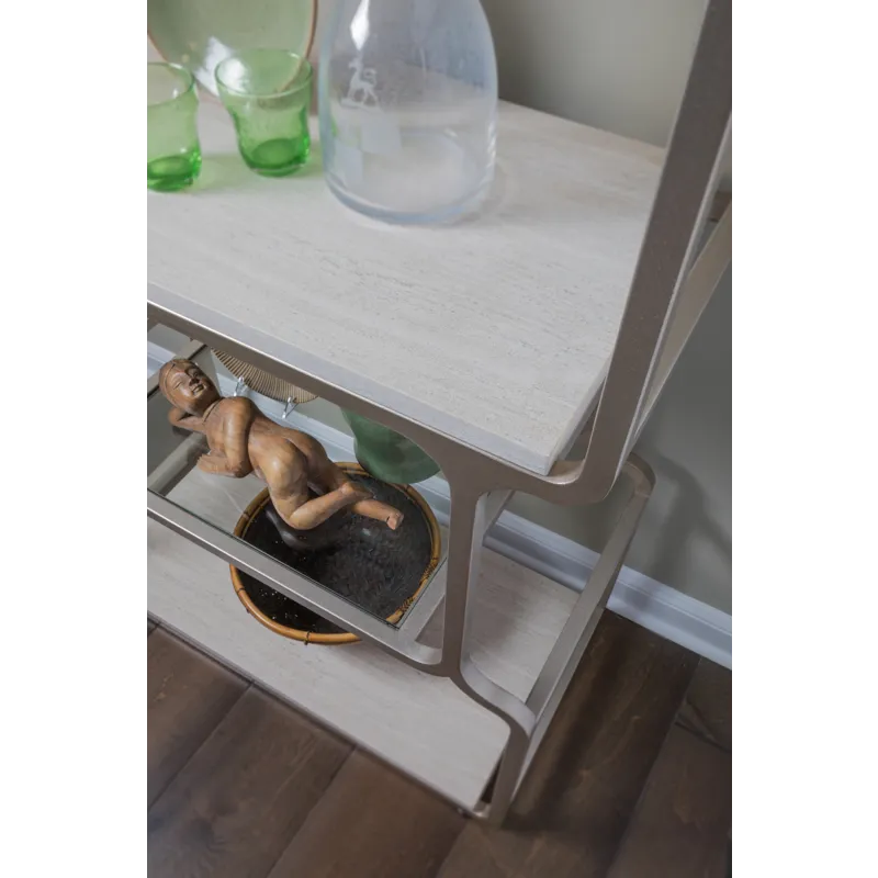 Geometric open bookcase with softened corners in a style harkening to 60s Modernism. Features two white vein travertine shelves and four tempered glass shelves in an iron frame dressed in a champagne silver leaf finish.