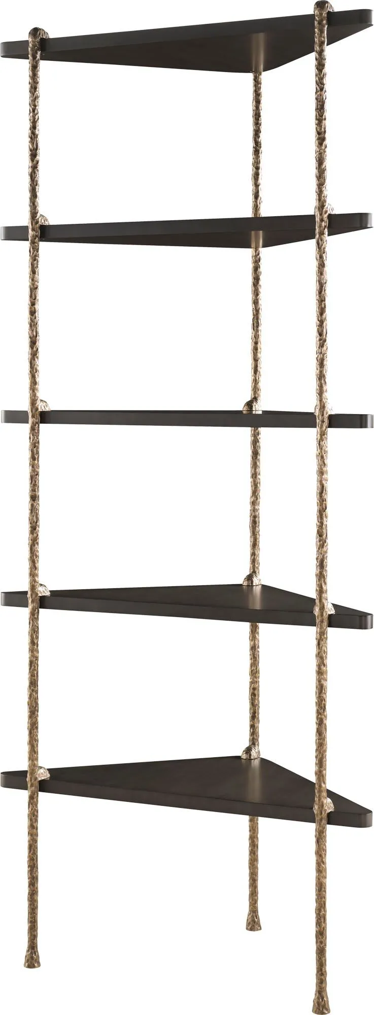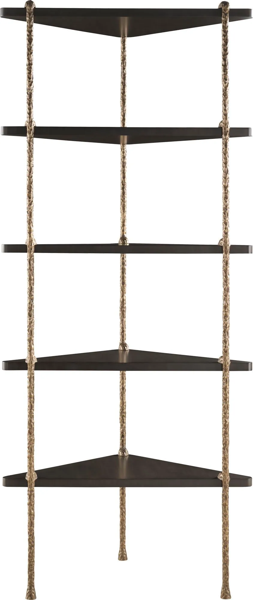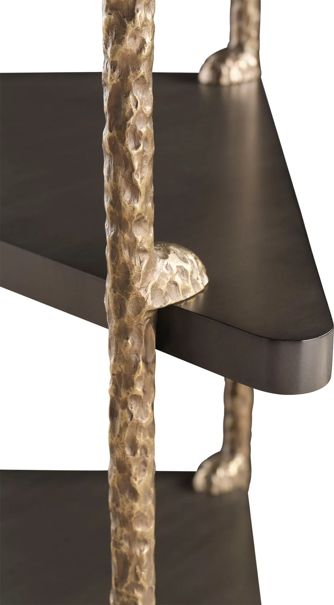 Nature’s hand is evident throughout the Knossos Etagere, named for the ancient Minoan civilization that predates modern Santorini. Five tiers of veneered oak are suspended within a metal frame crafted from sculpted, cast bronze.
