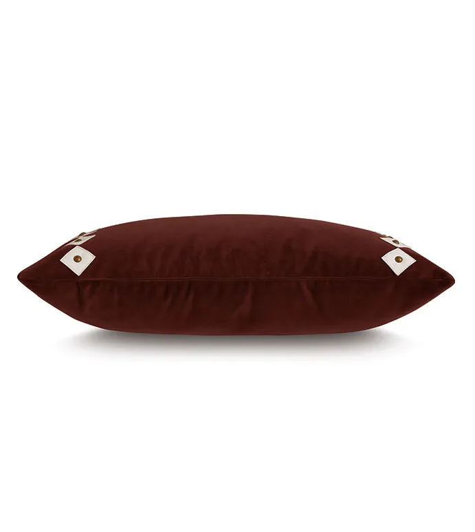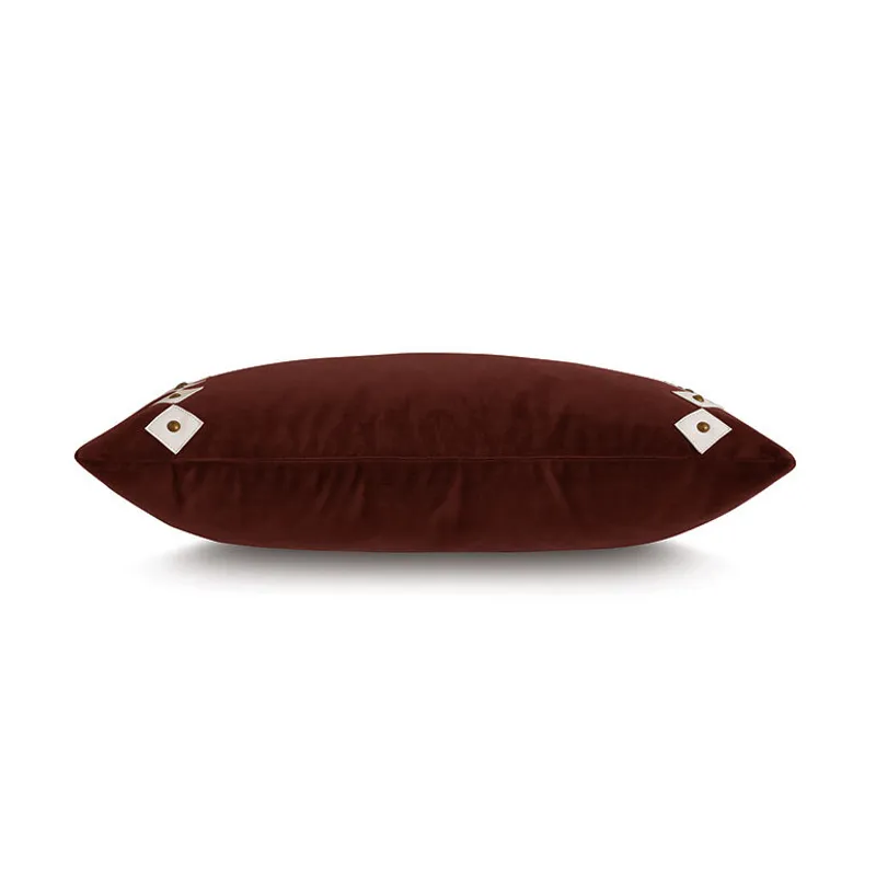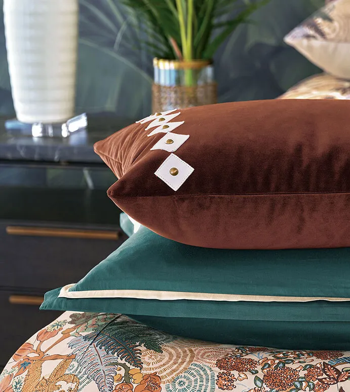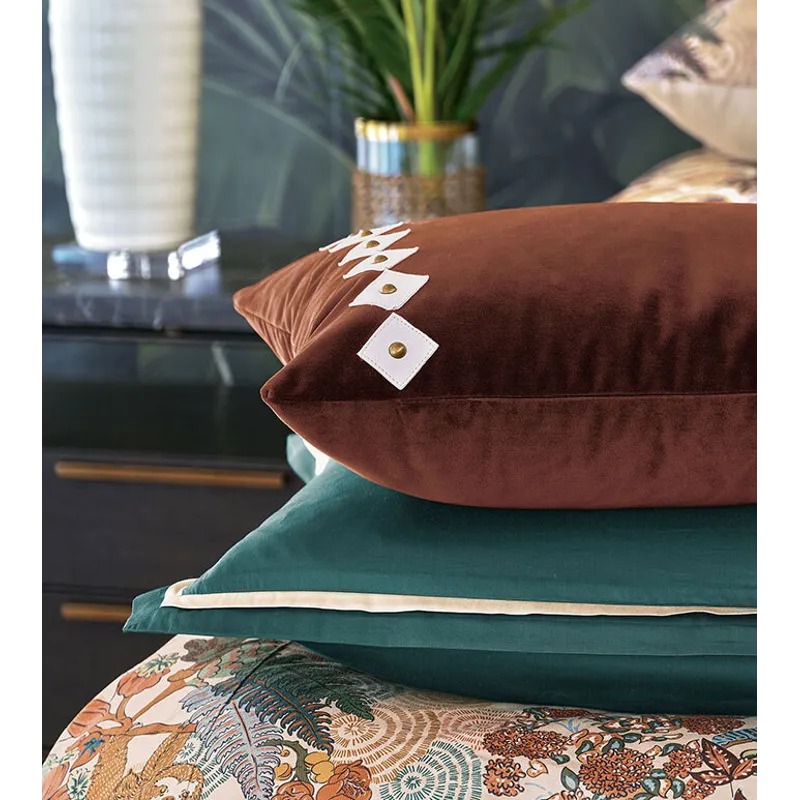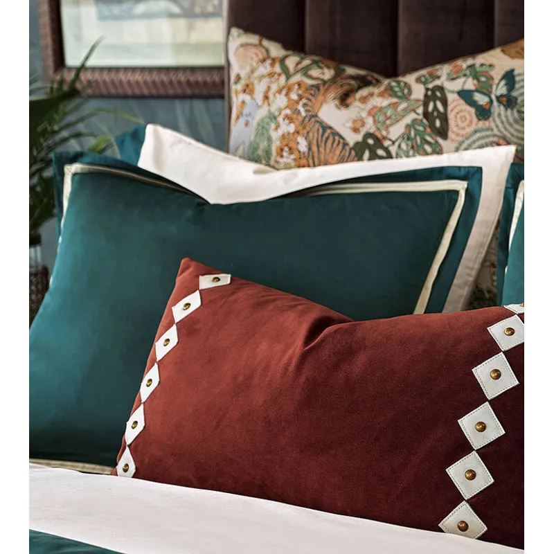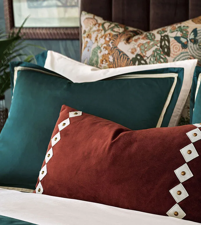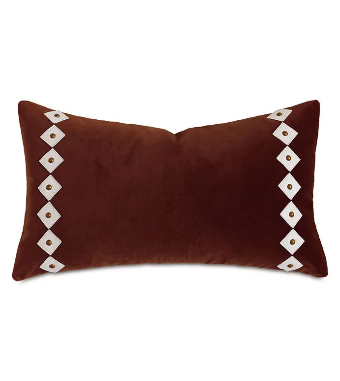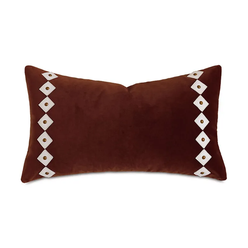 - Velvet decorative pillow with hand-cut leather diamond shapes and nailheads