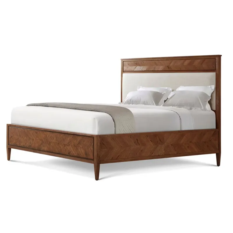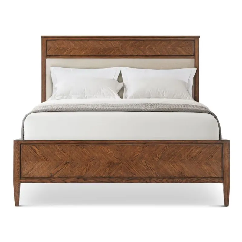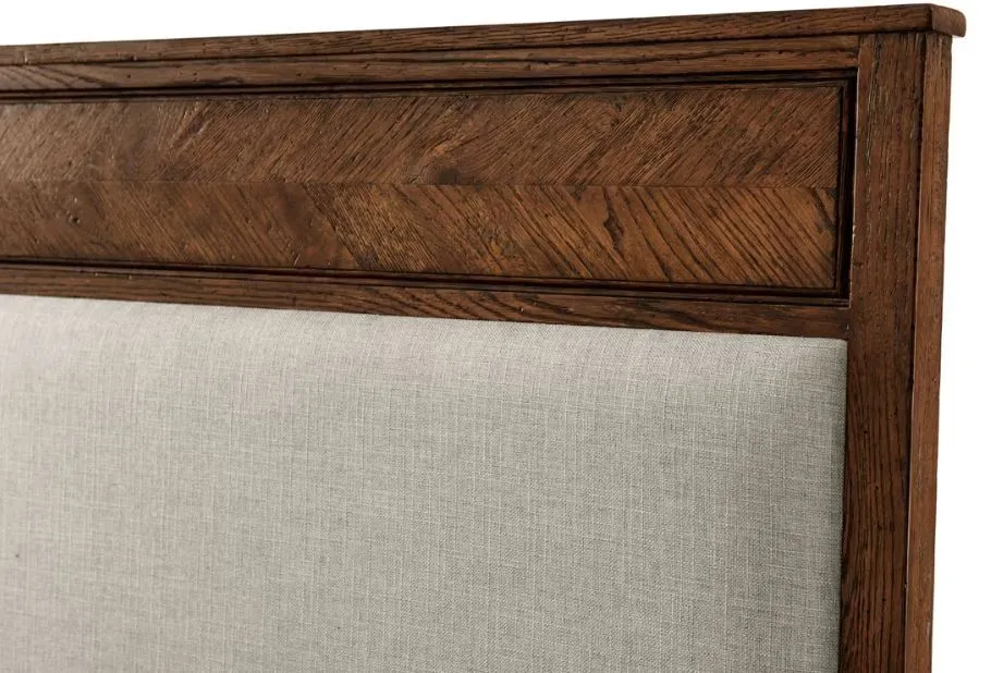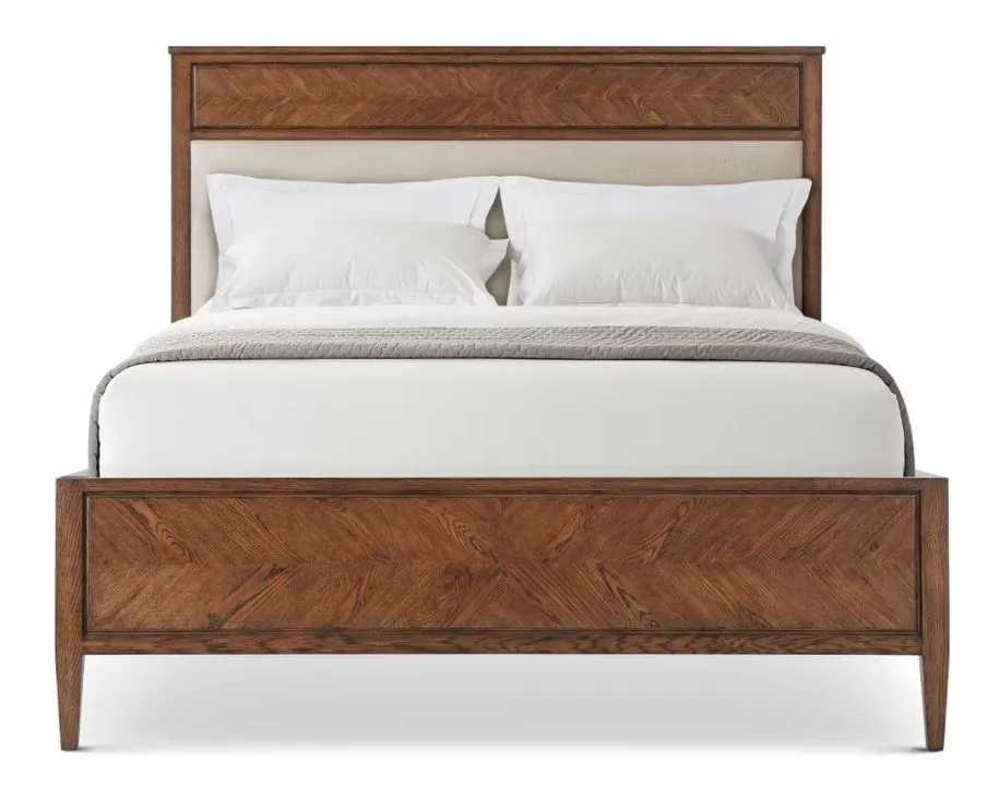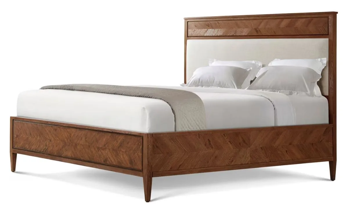 An undeniable super NOVA, this rustic oak design of the NOVA US King Bed, seen in our Dusk finish, captures the essence of a classic silhouette, with a hand-carved starburst design. Featuring an upholstered panel headboard with a framed oak side rail and tapered finished leg.