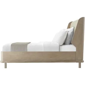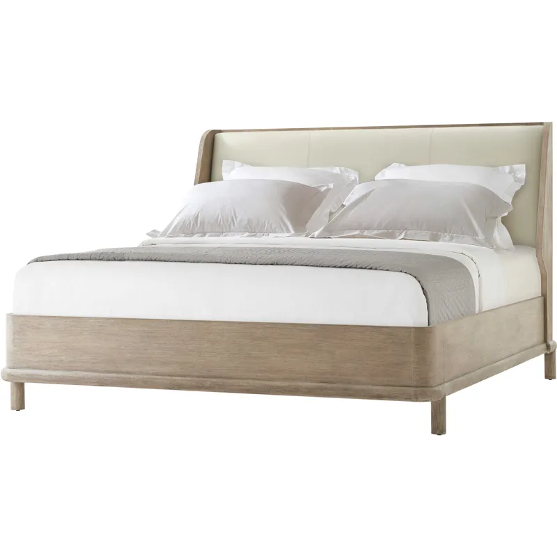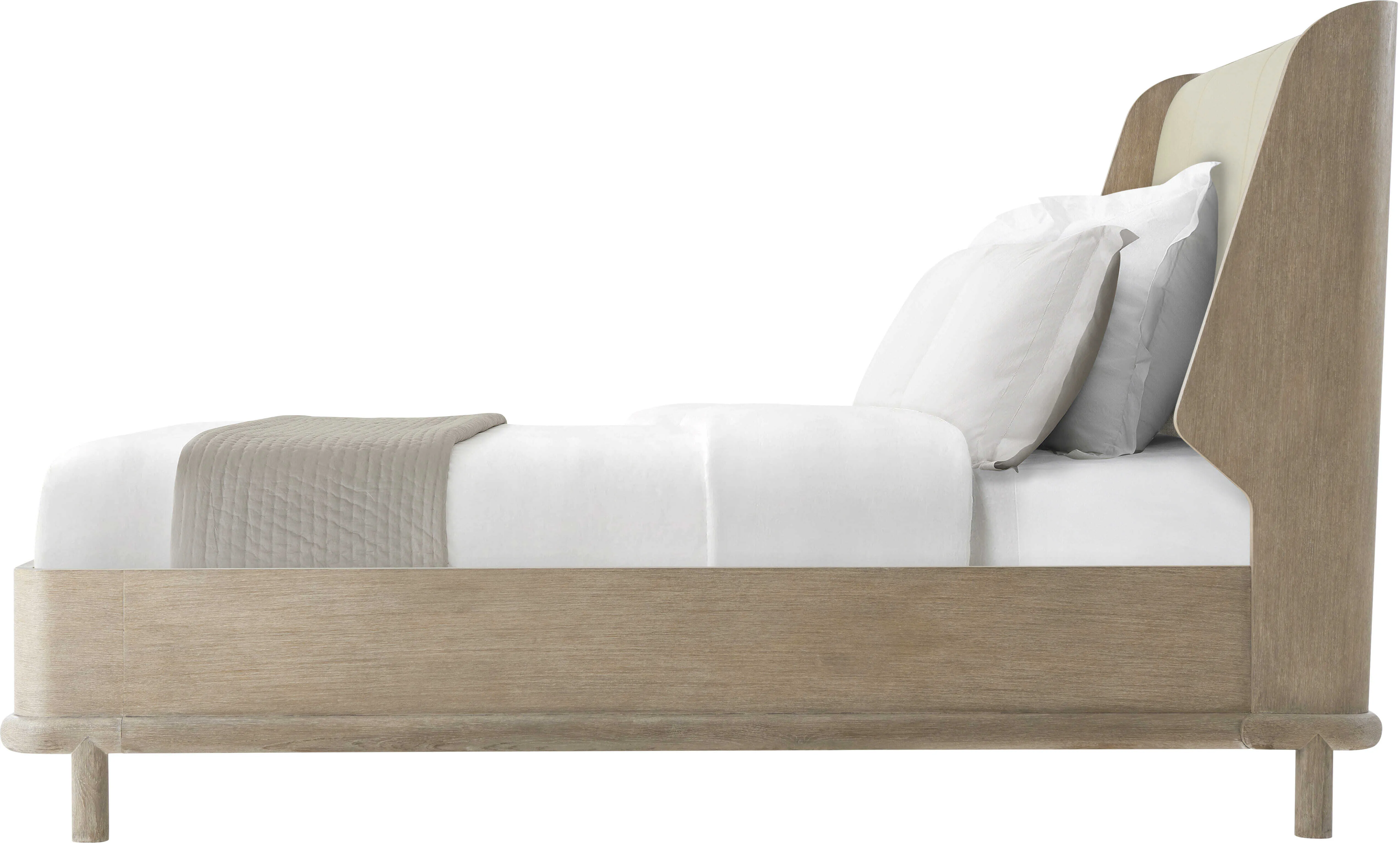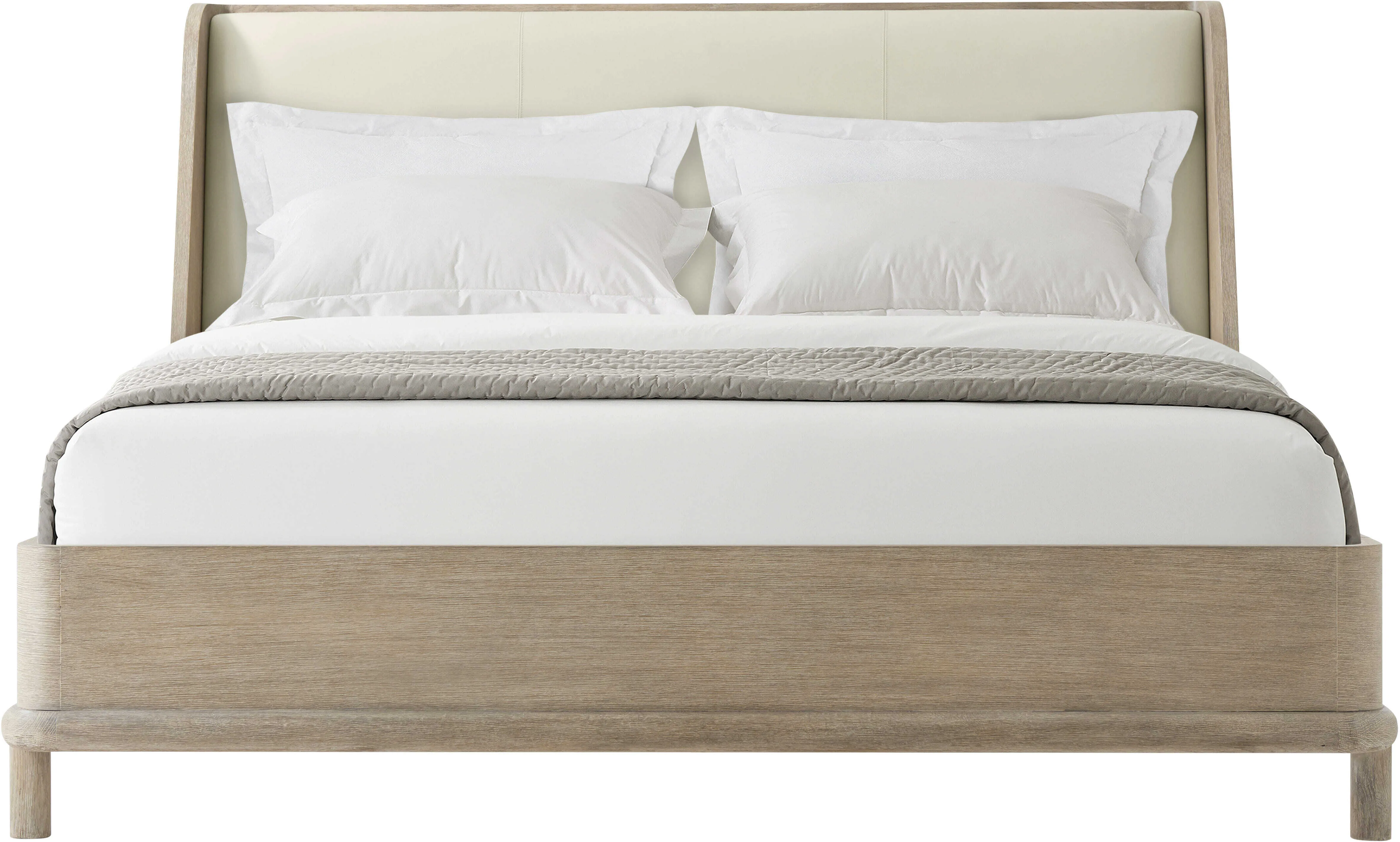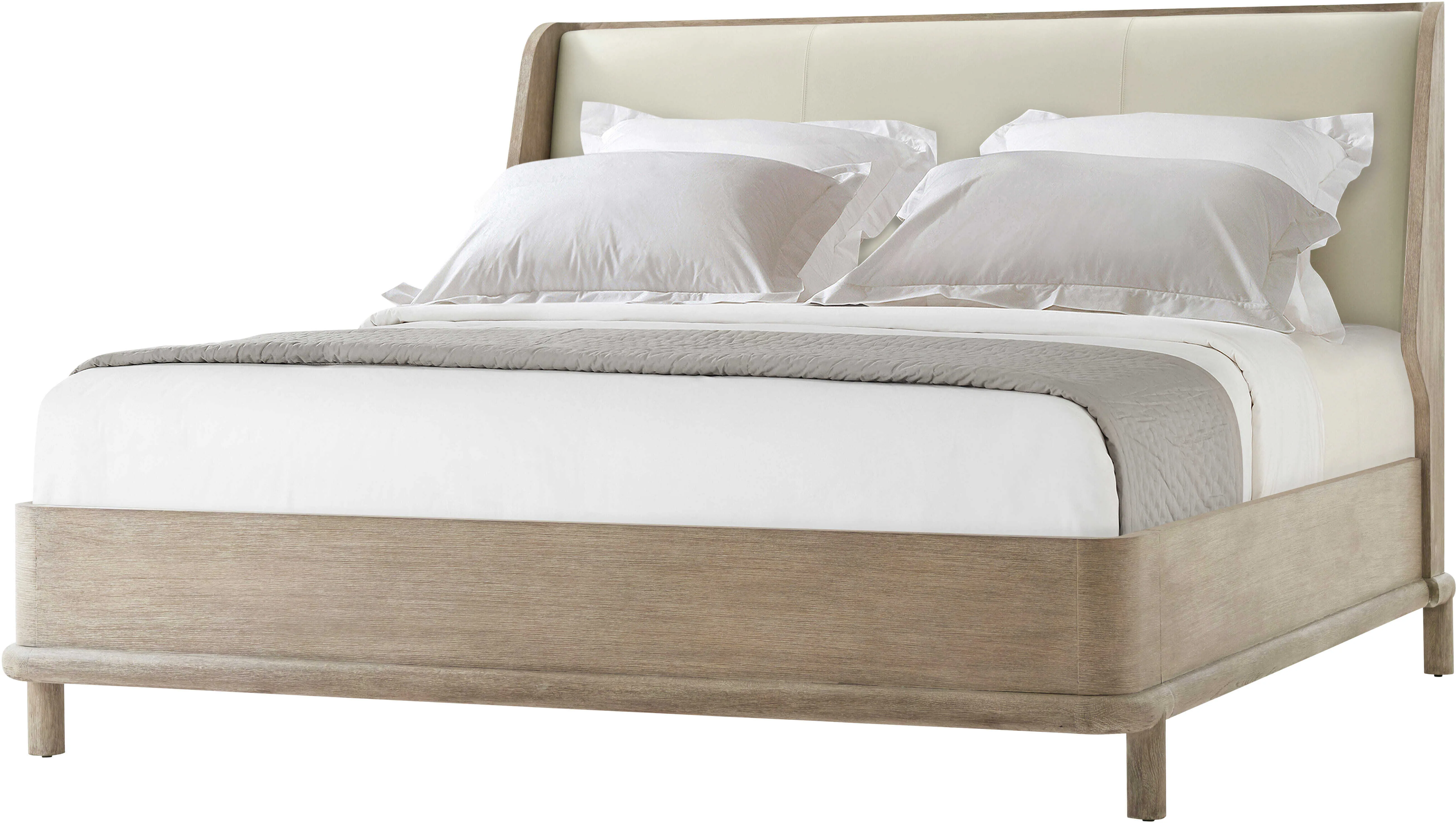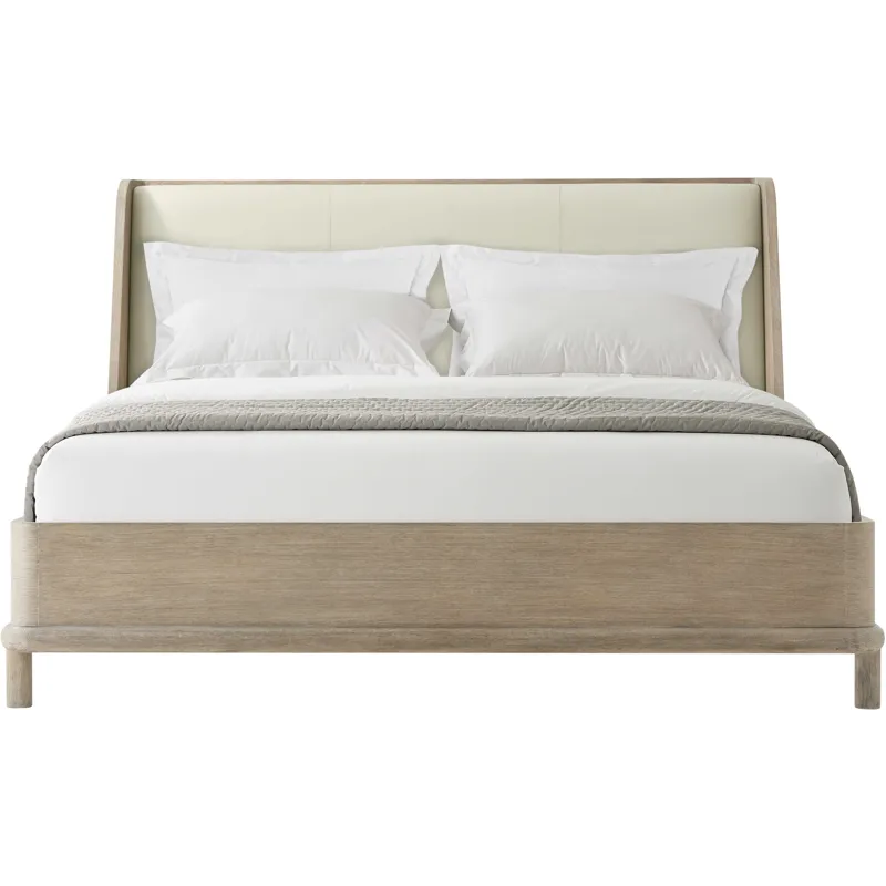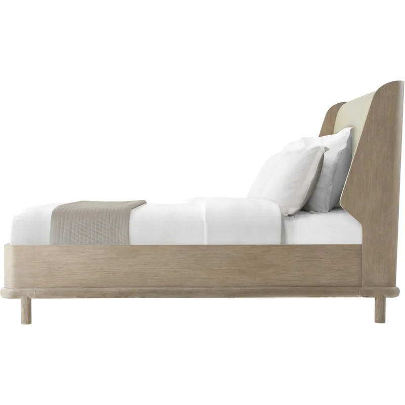 The Repose US King bed features an upholstered headboard and wire brushed oak in choice of Gray or Charcoal Oak. The round mission style legs elevates the bed off the floor creating an elegant stance.