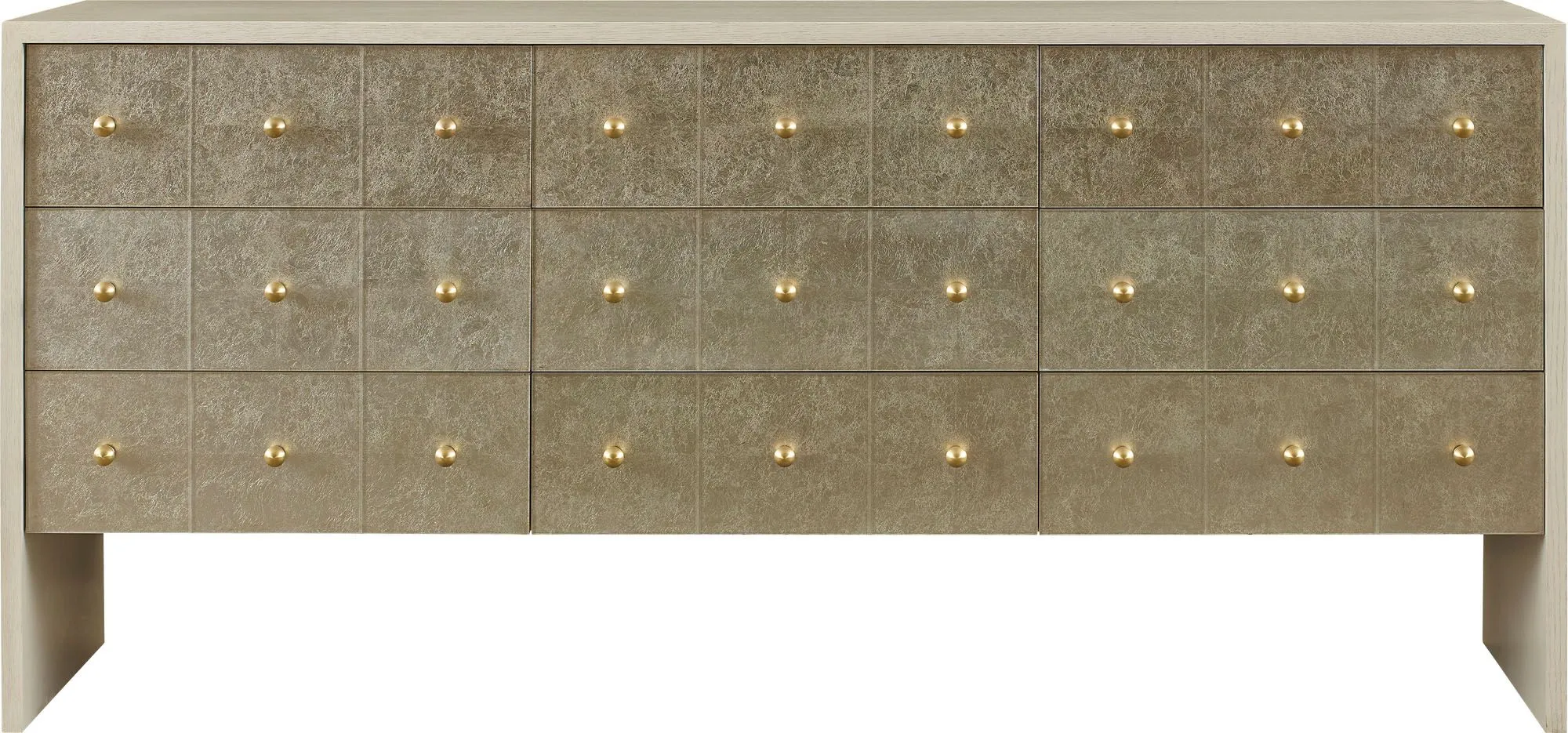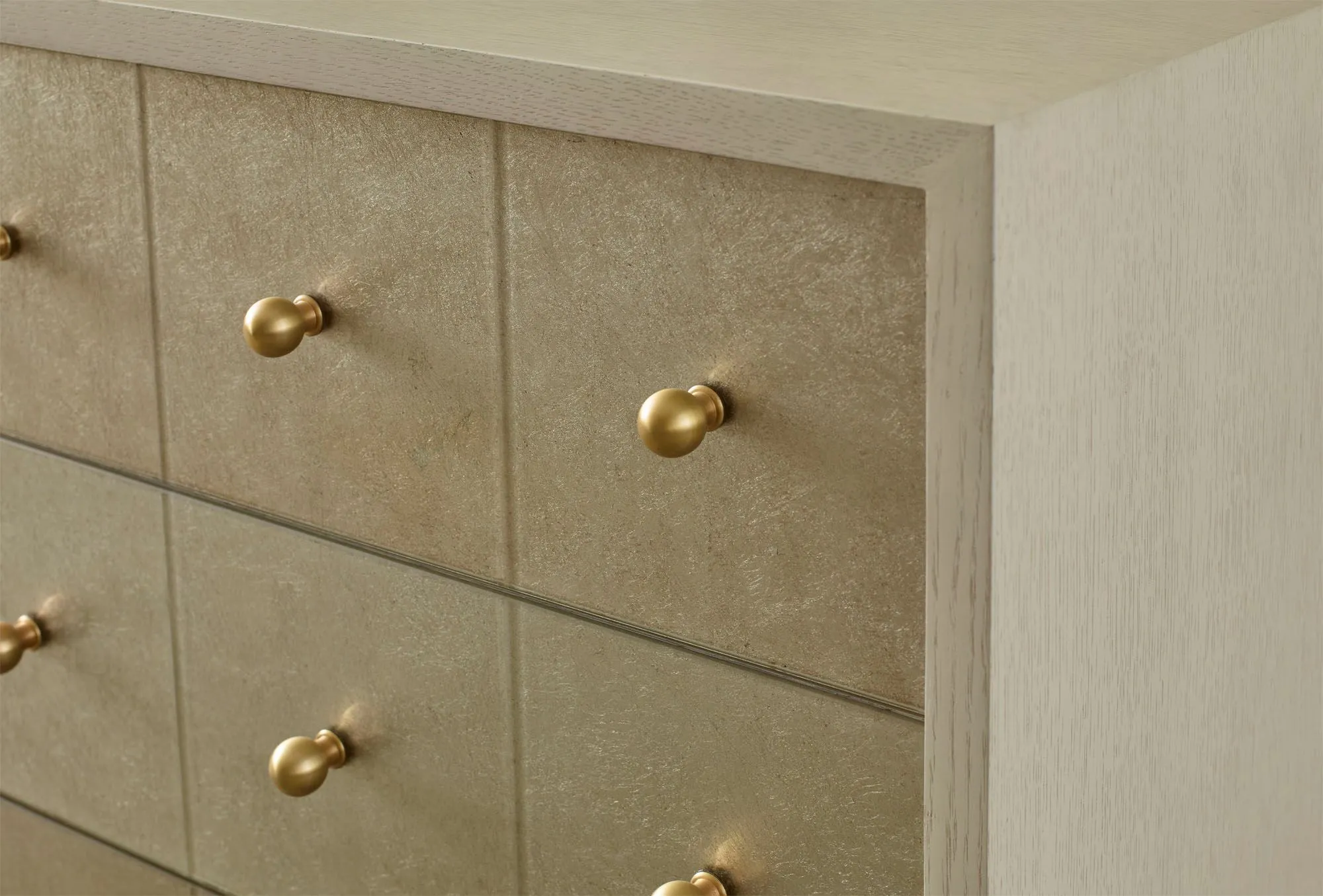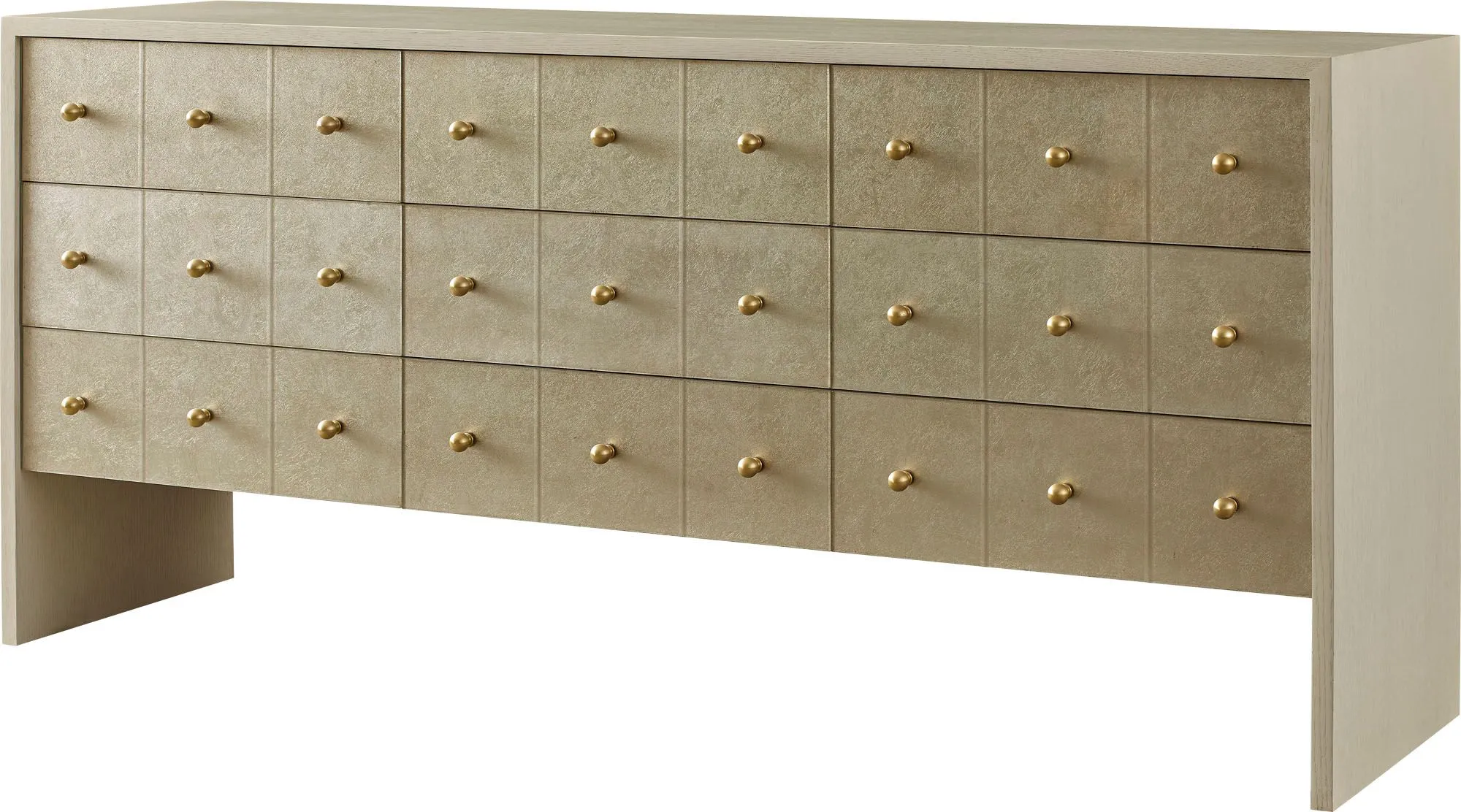 Designed to evoke the styling of vintage apothecary cabinets, the Couture Dresser is an exemplary piece from the Baker Luxe Collection. This modern and utilitarian console includes nine drawers that read as twenty-seven eglomise drawers, framed in quartered oak.