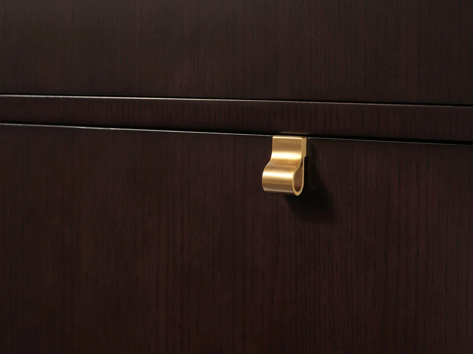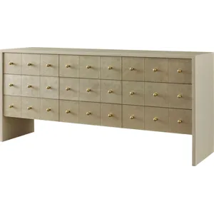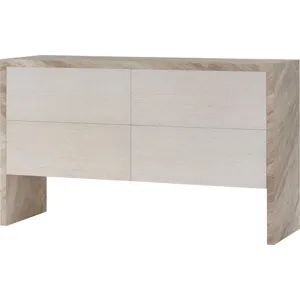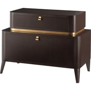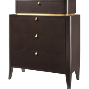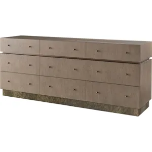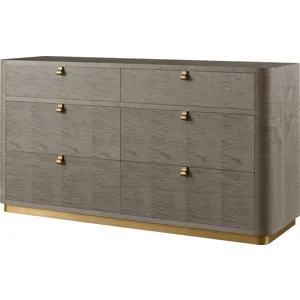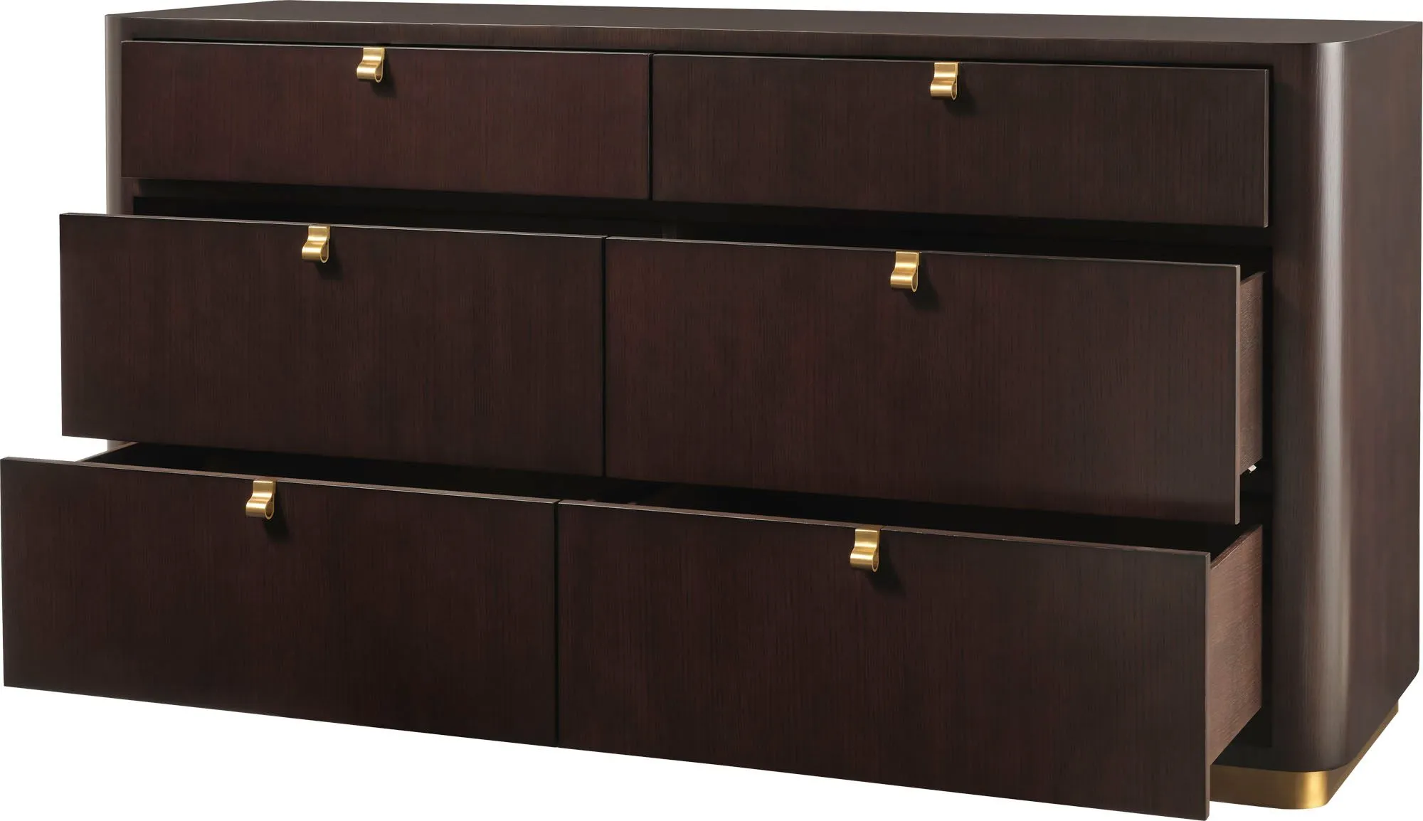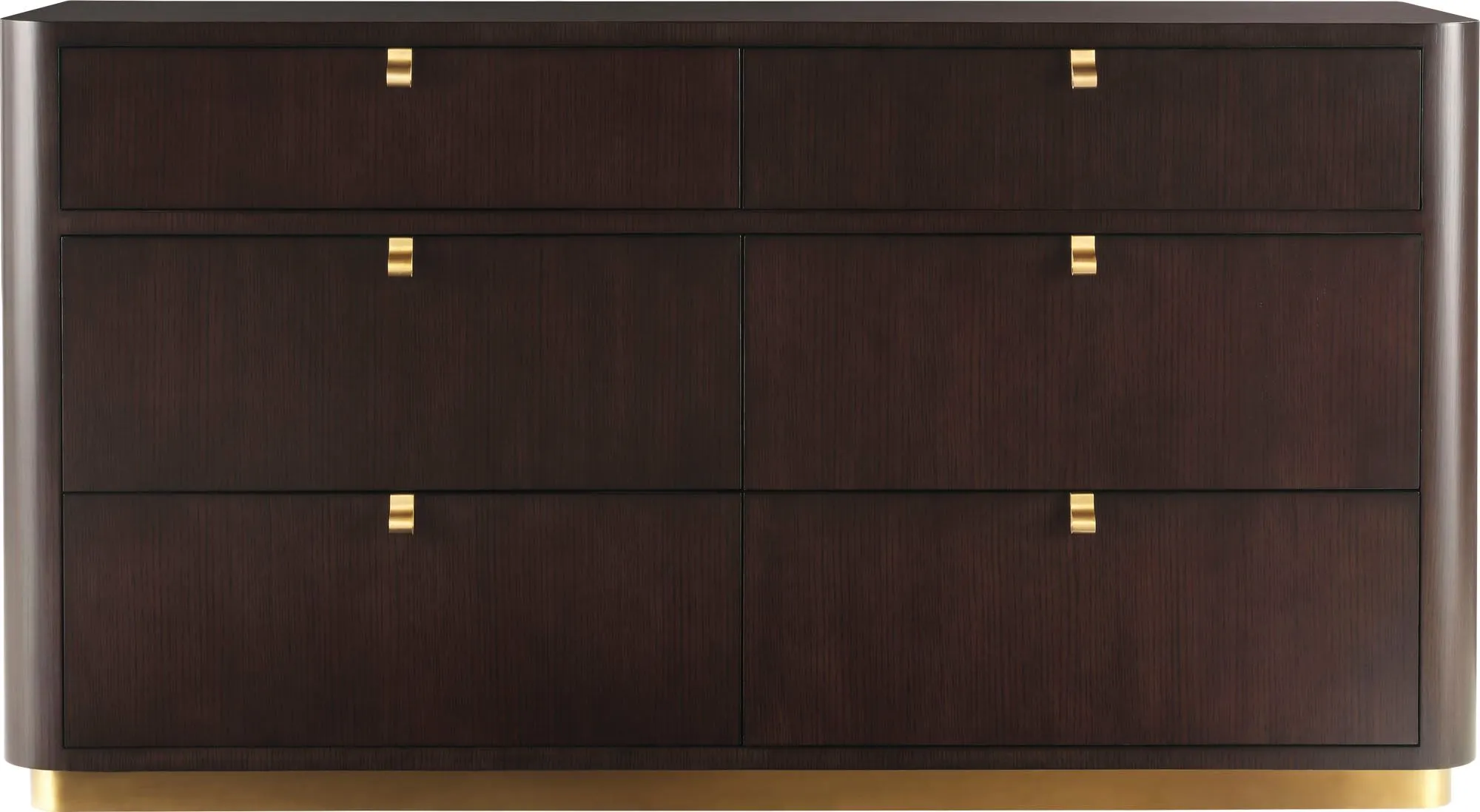 The Ellery Dresser seamlessly pairs quartered oak veneer with polished brass and smooth rounded corners, creating a vision of modern style. The dresser features six drawers for ample storage, with liners included on the top two drawers.