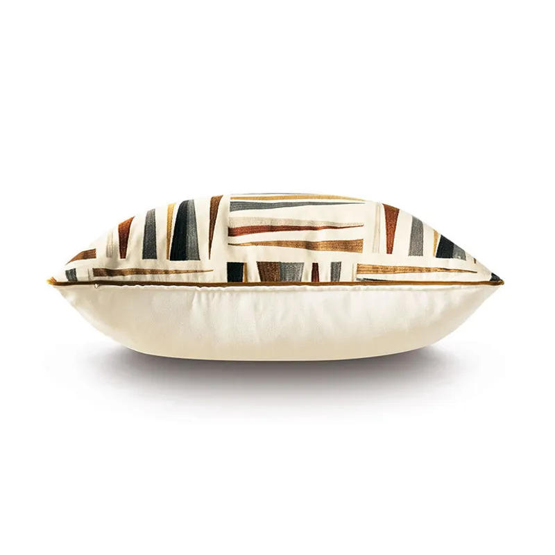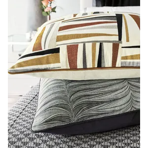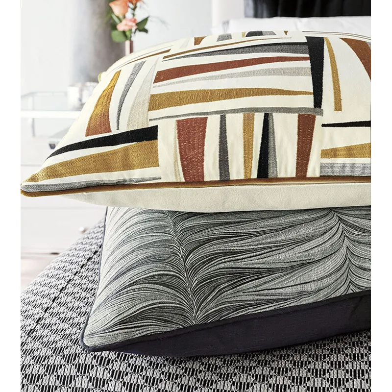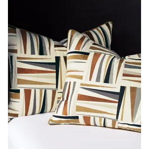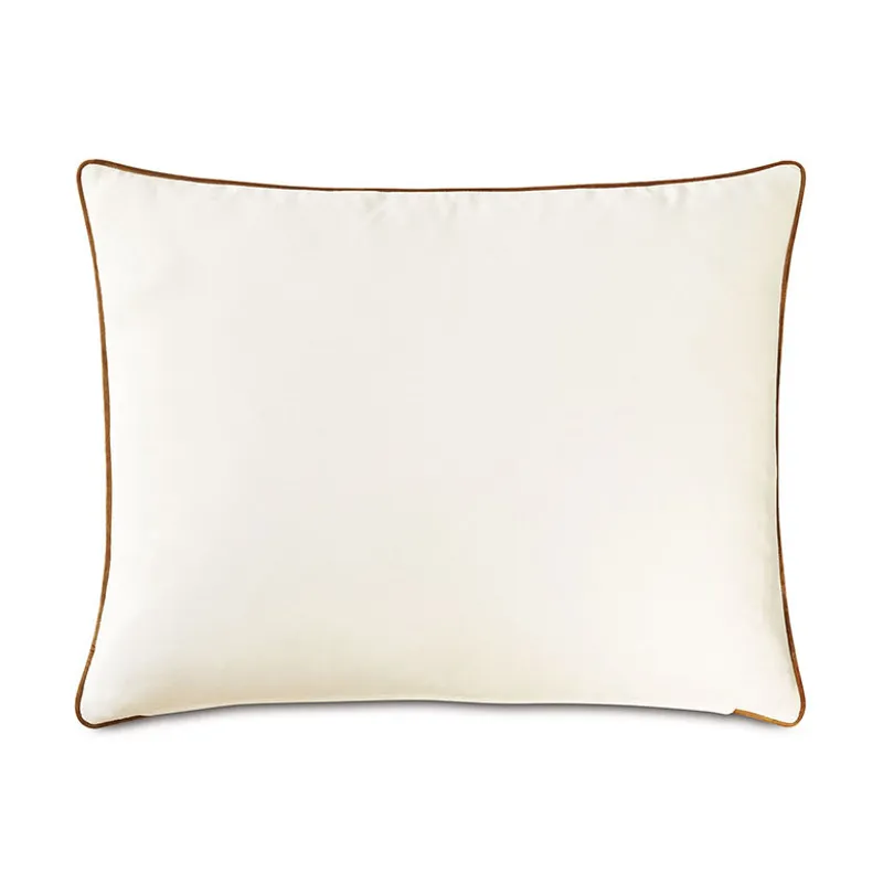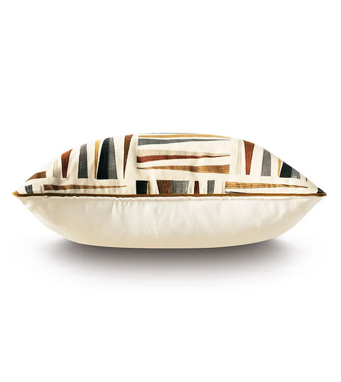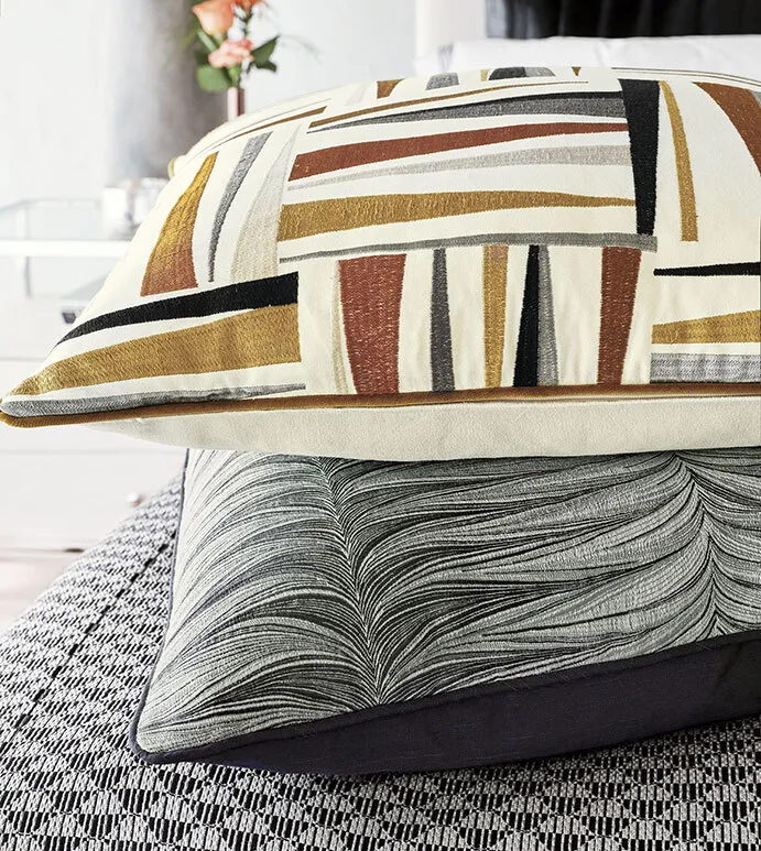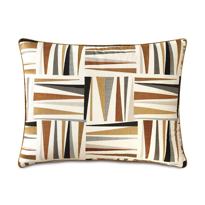 - Standard sham with a geometric embroidered fabric face in earth tones