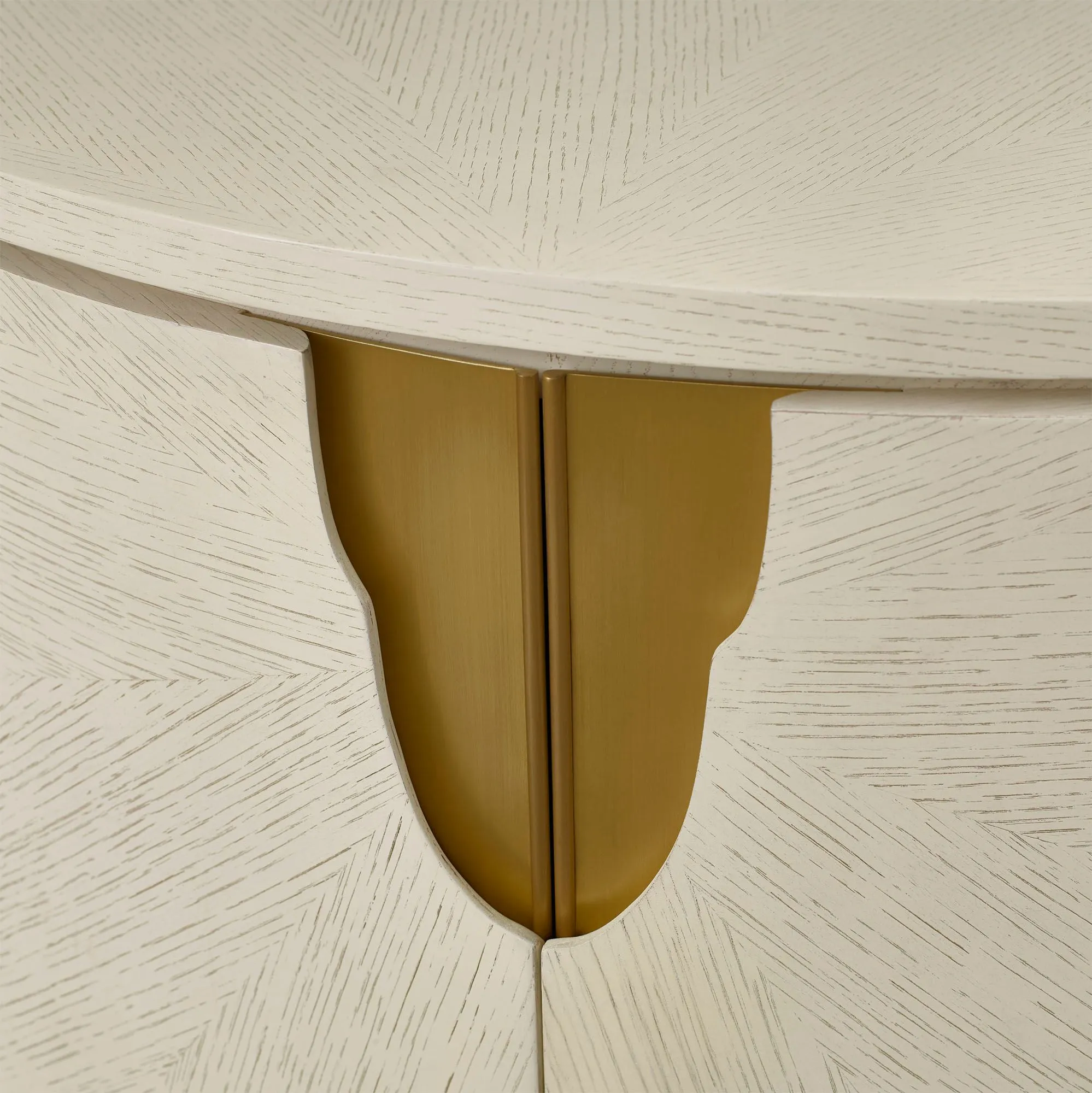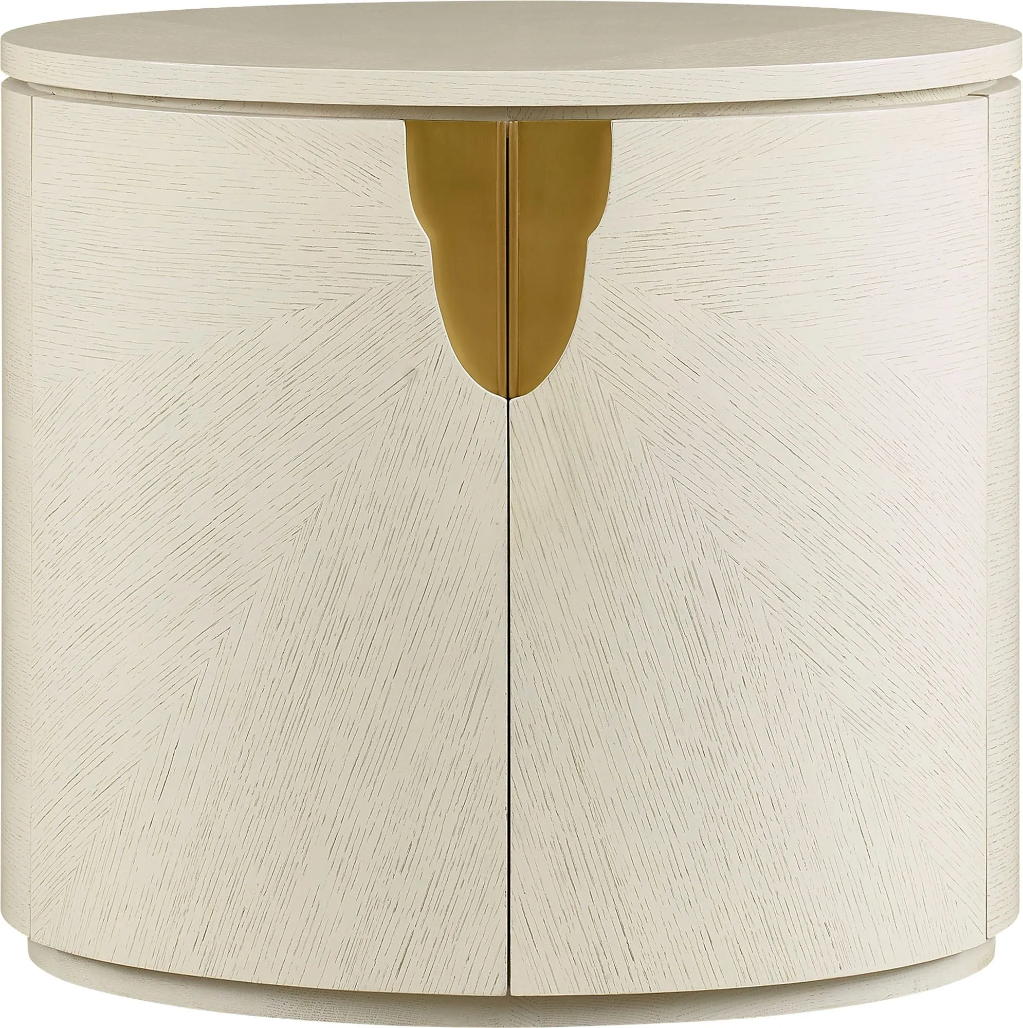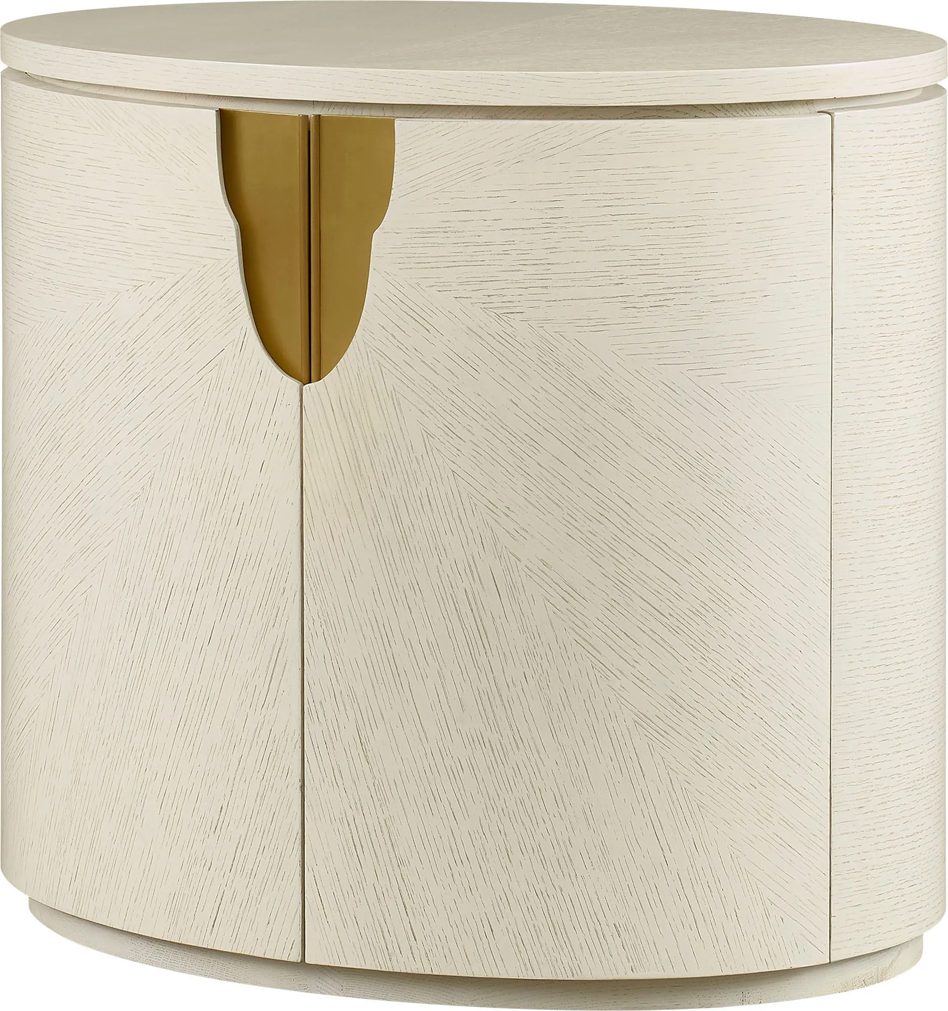The Dover Bedside Table is radiant and energetic. Inspired by the sparkle of a sequined cocktail dress, this focal table is completely curvilinear with solid integrated bronze pulls.
