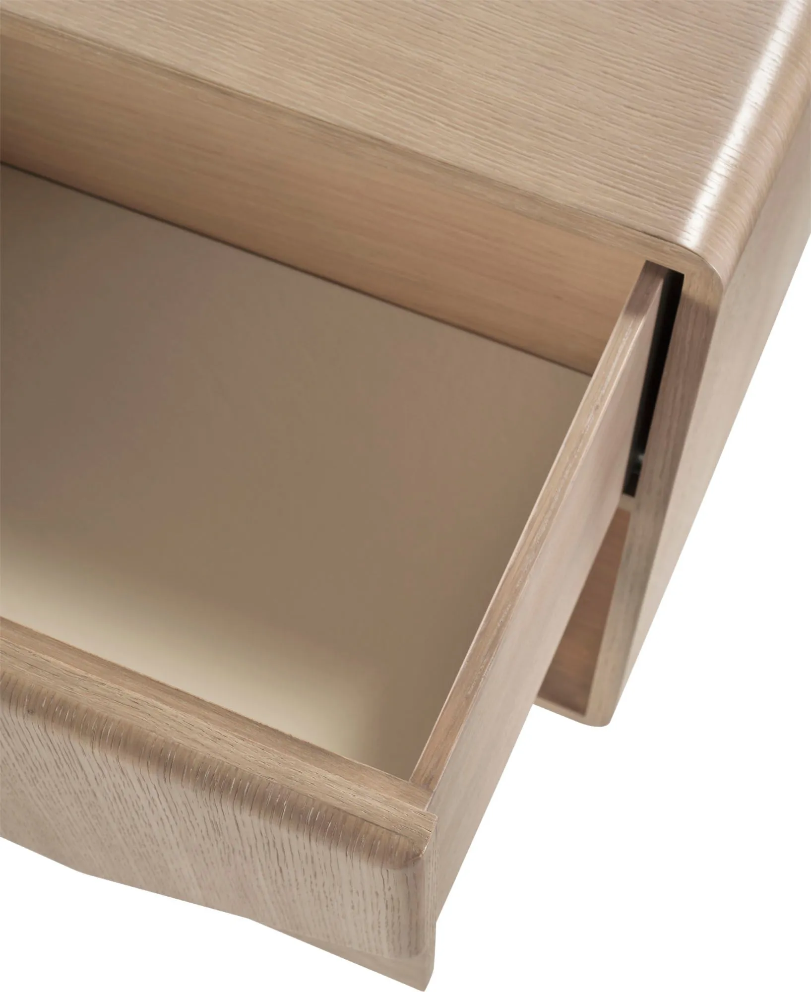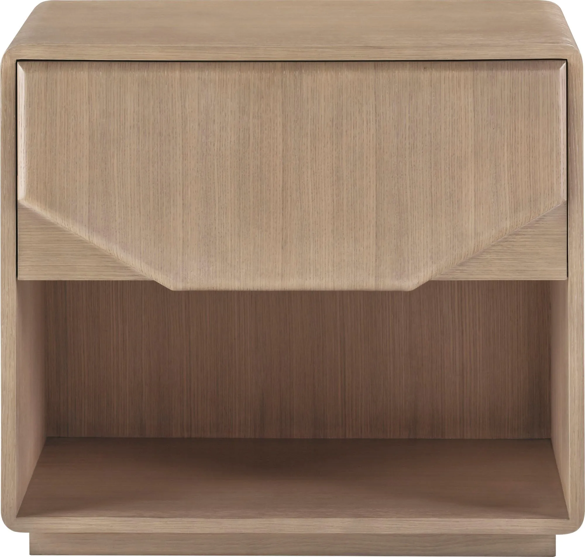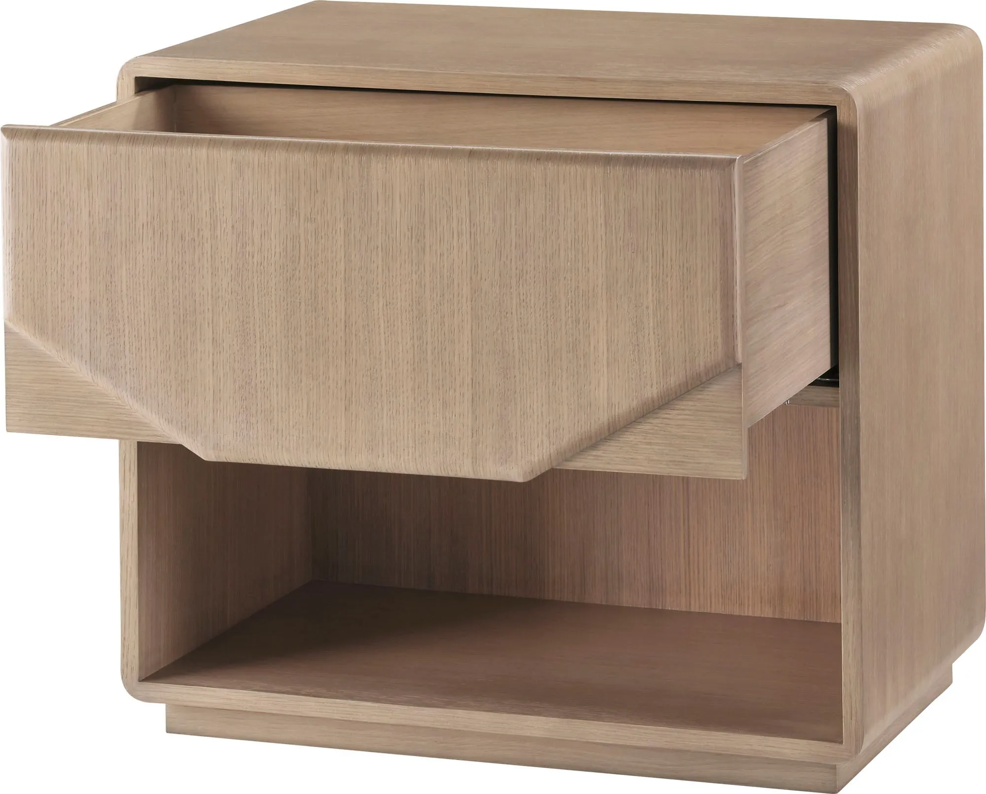 The Jayne Bedside Table is reminiscent of an envelope with its top fold tucked in, offering a layered and geometric look. The effect is heightened by the contrasting veneer direction on the drawer front, creating a dramatic statement for any space.