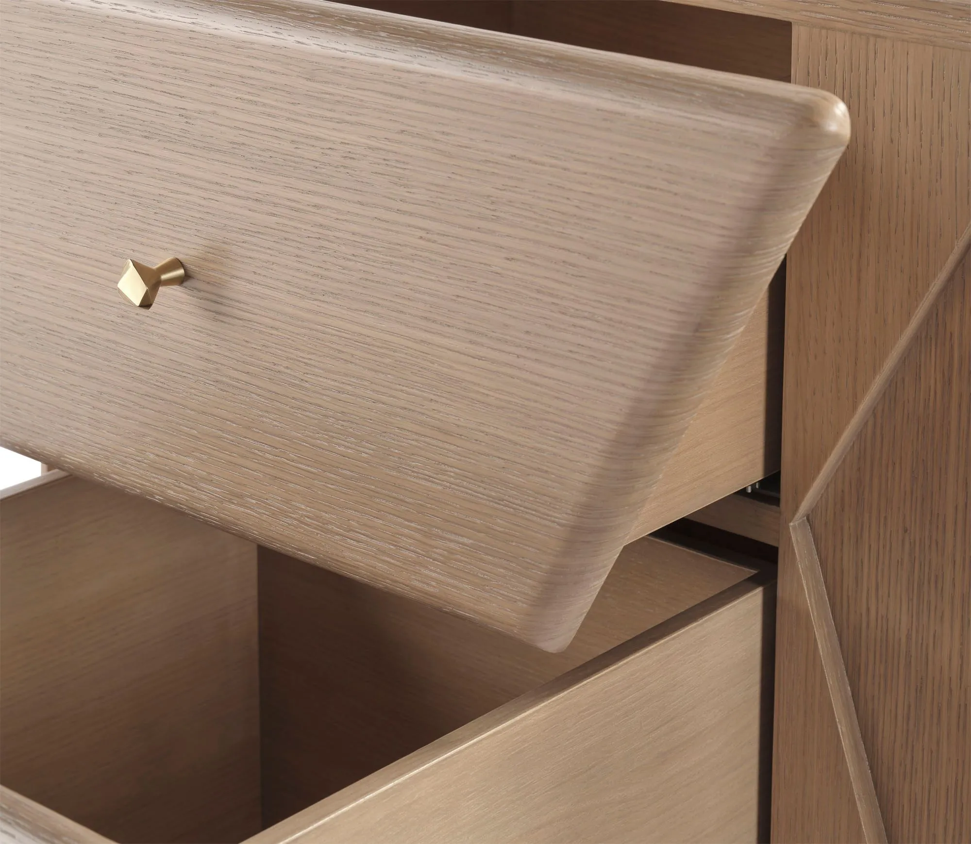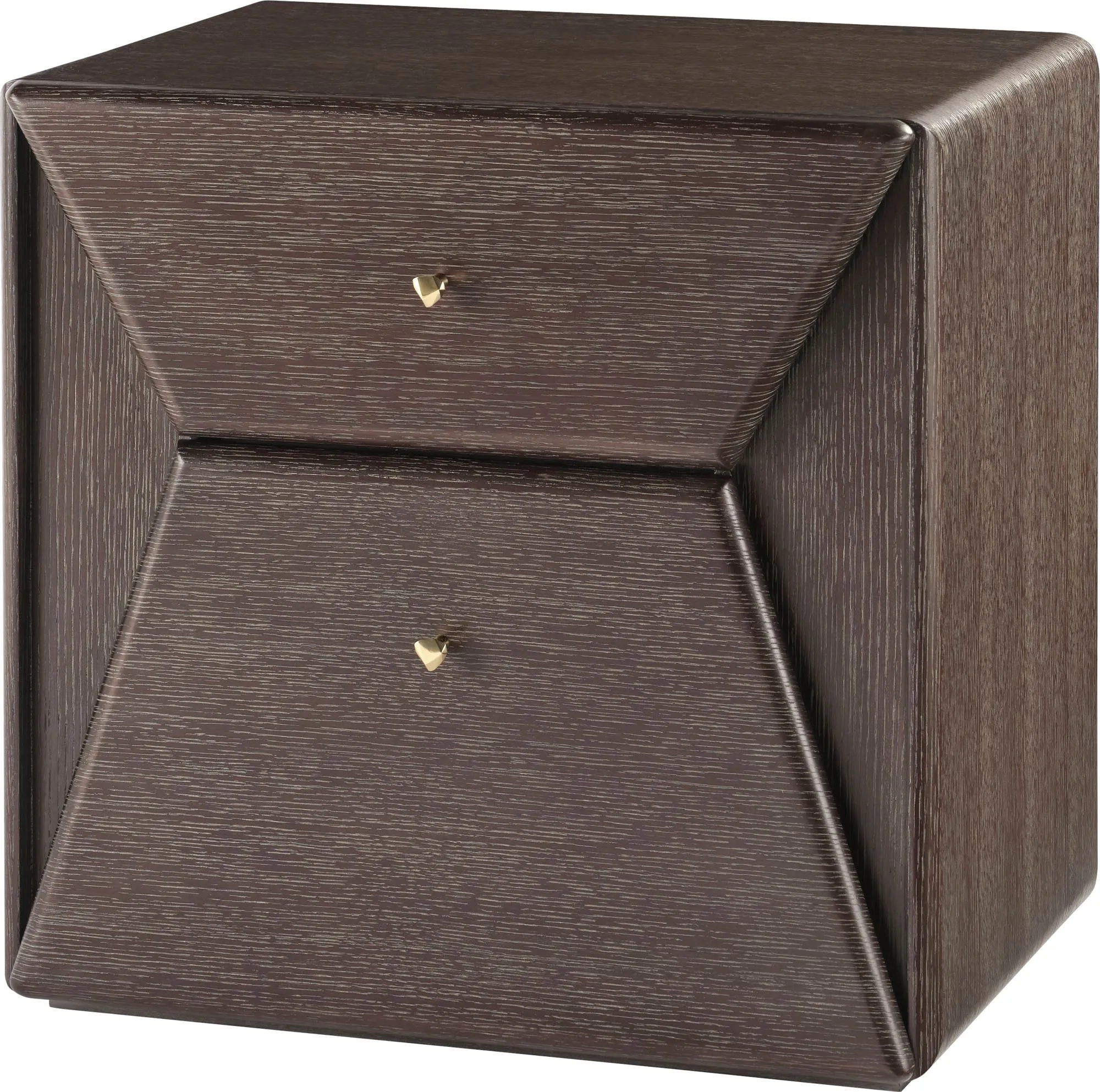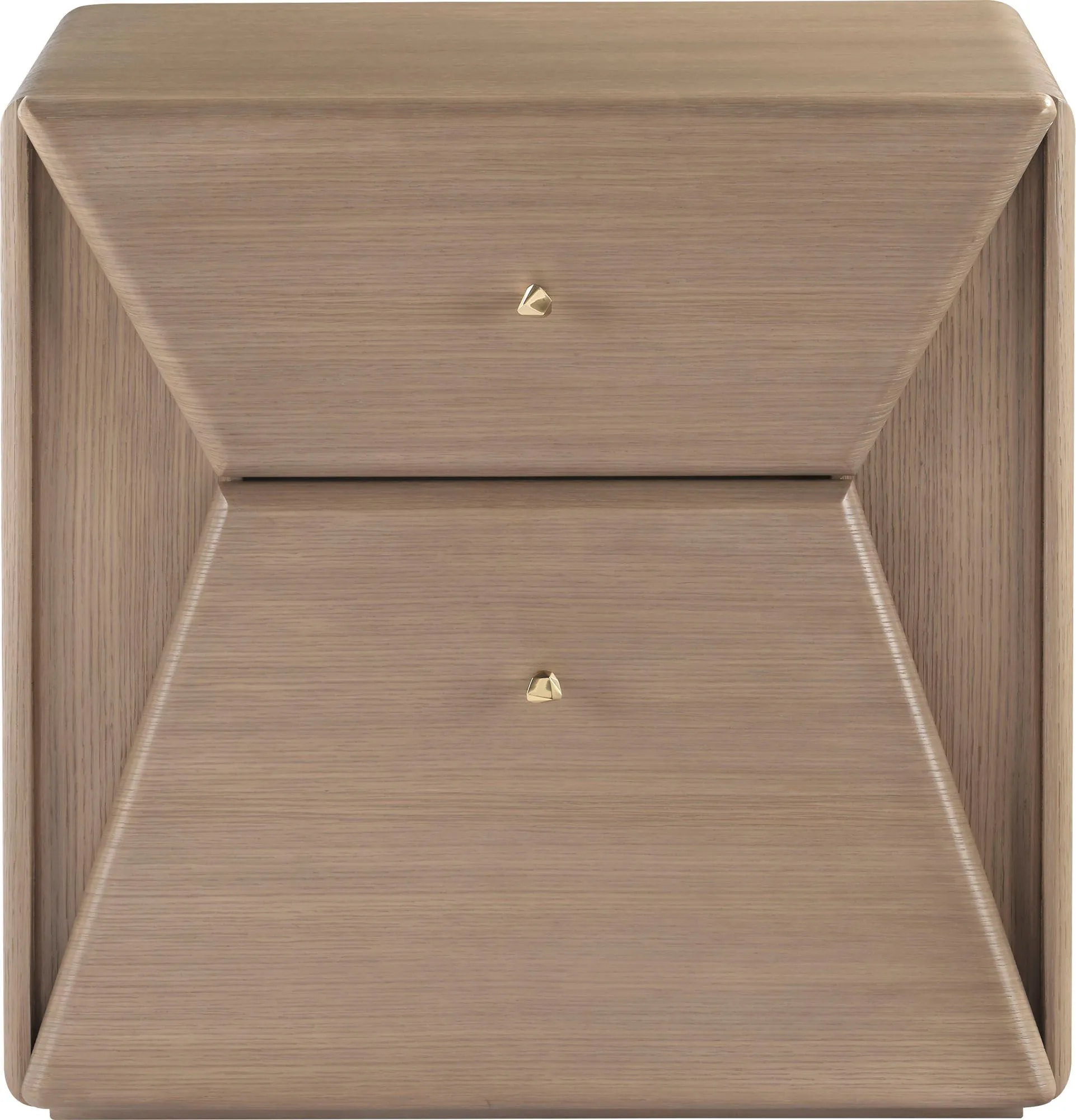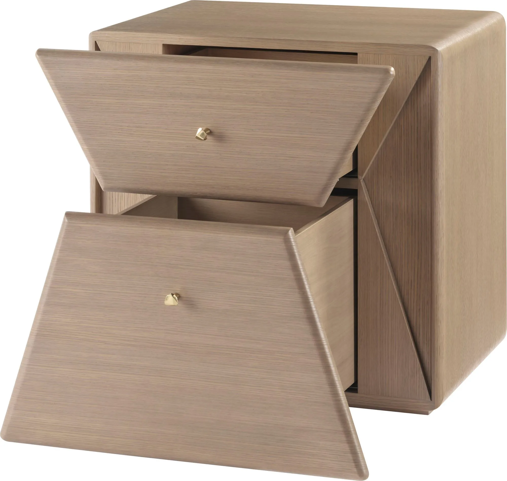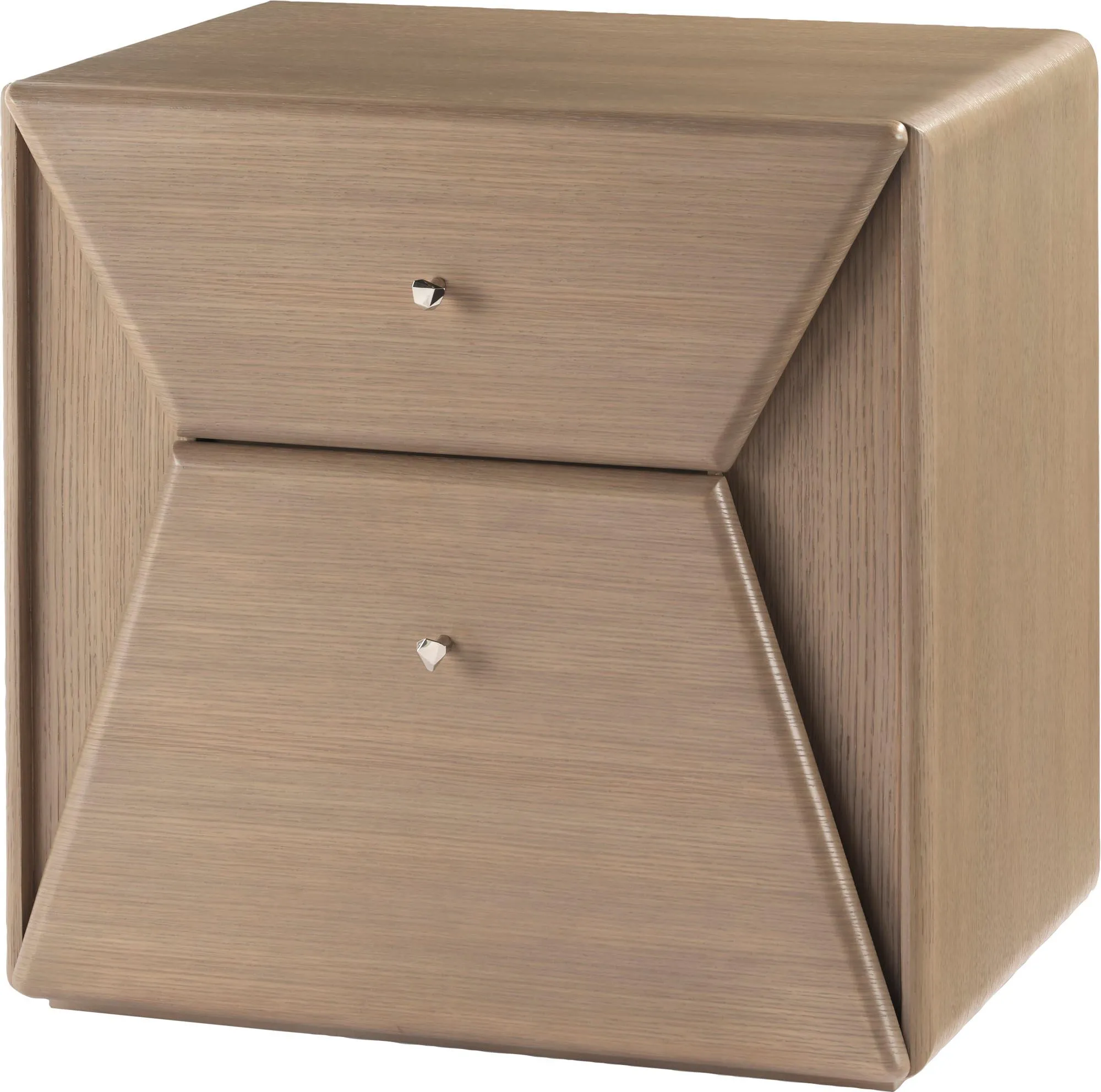 Inspired by the overlapping folds of an envelope, the Juniper Bedside Table is a uniquely geometric and layered piece. Made from quartered oak veneer, the table is punctuated by two faceted drawer pulls crafted in Nickel Plated Brass or Pure Brass.