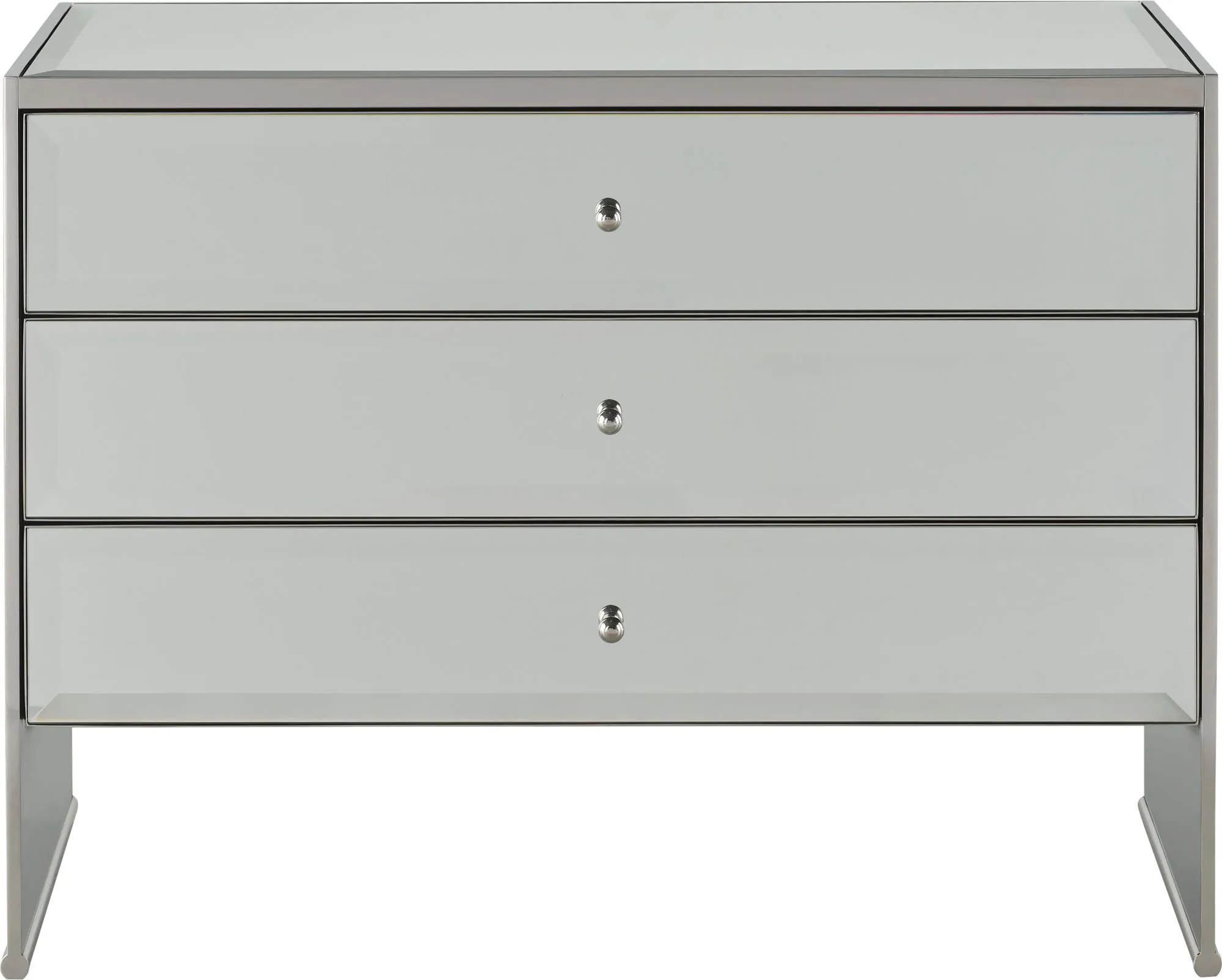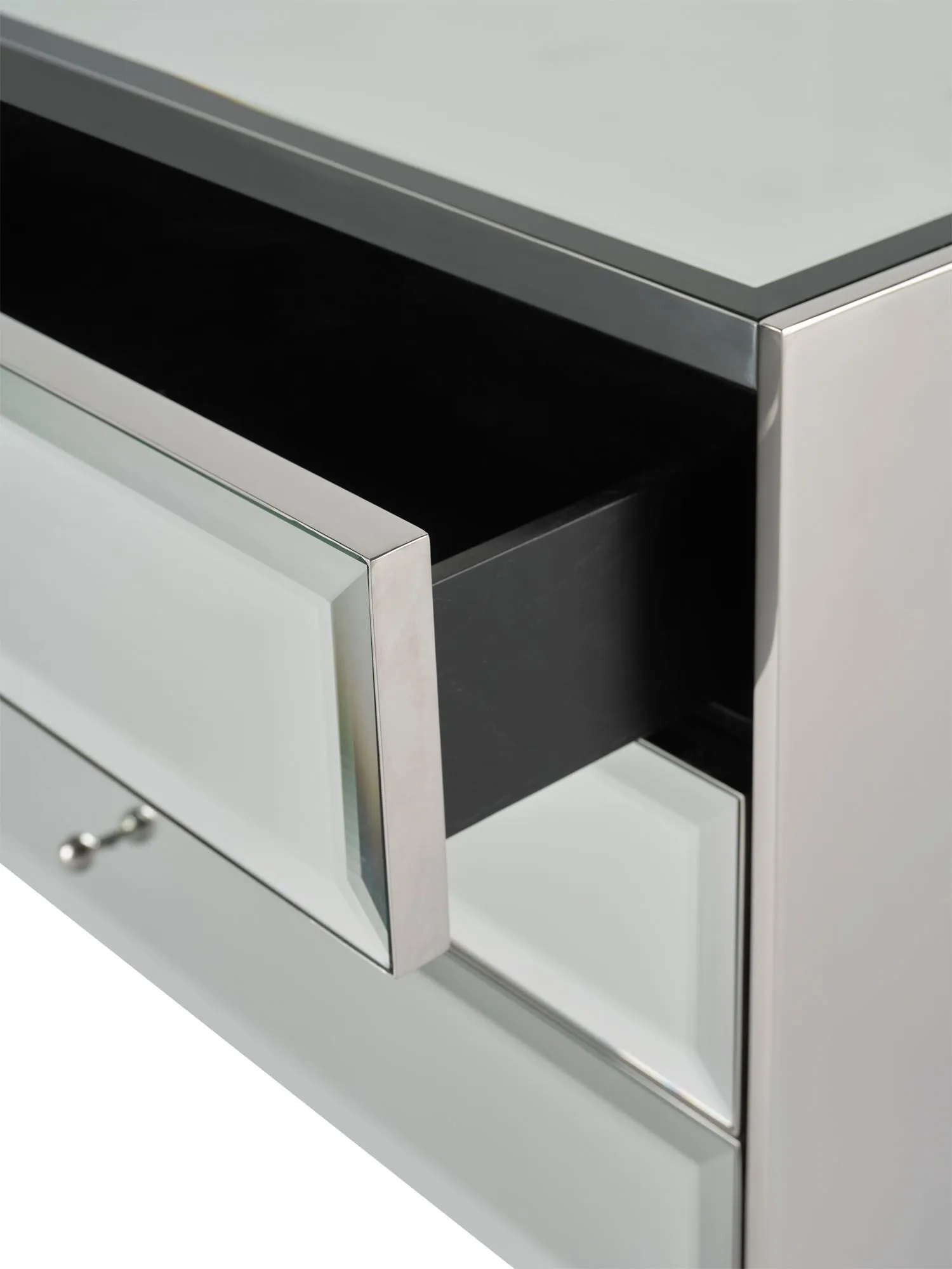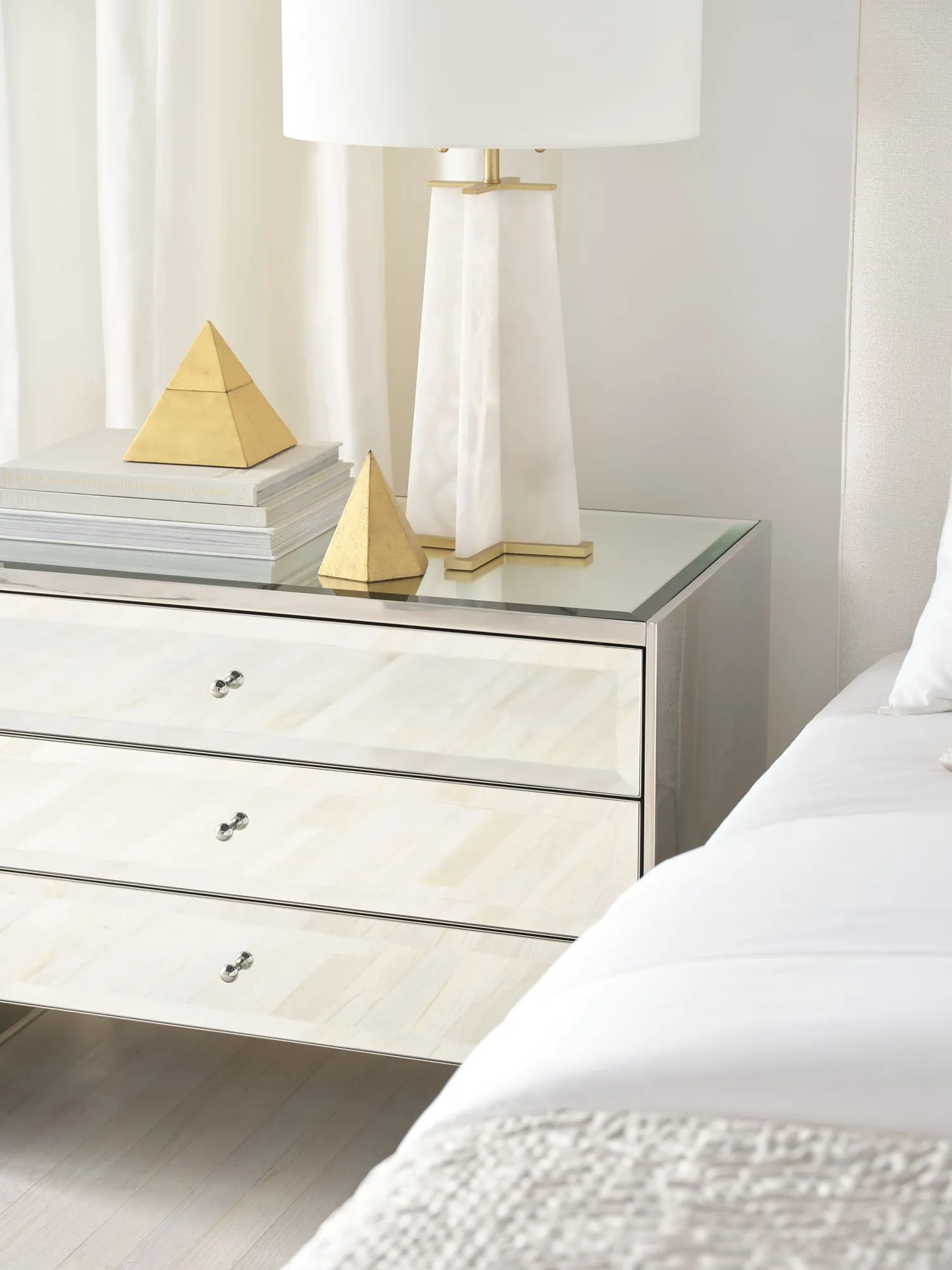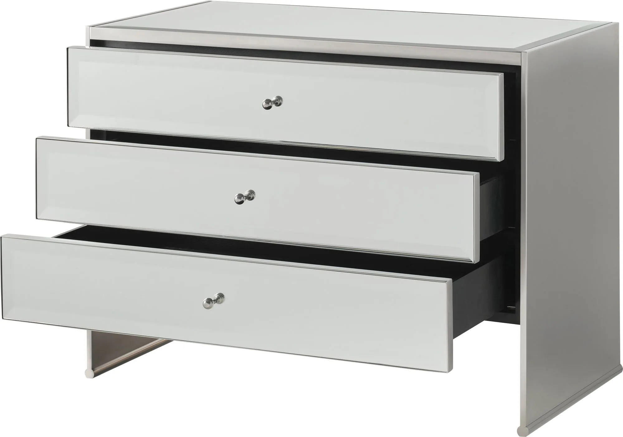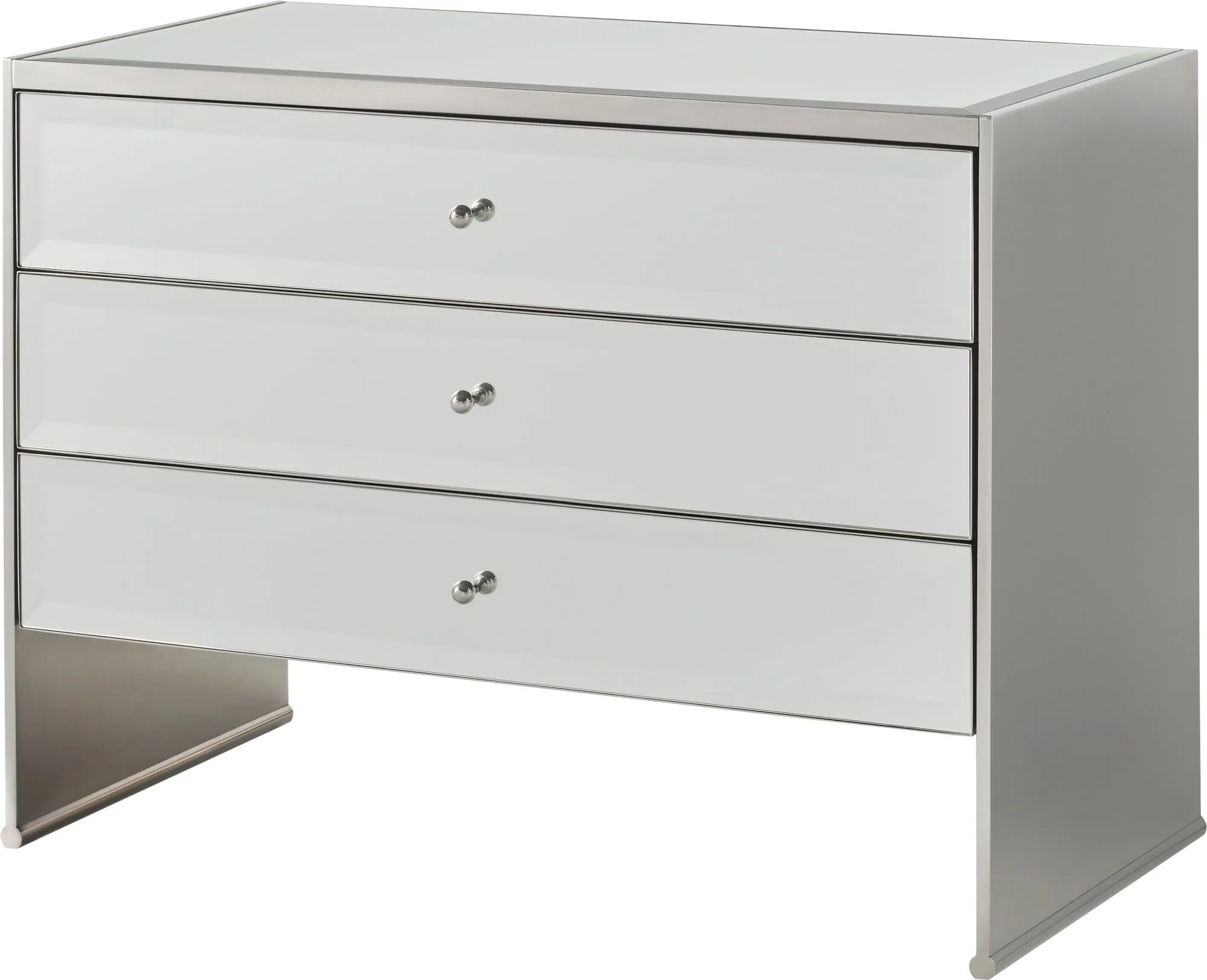 The Mode Nightstand is instantly at home at the bedside, with a mirrored top and mirrored drawer fronts inspired by the styling of jewelry boxes.