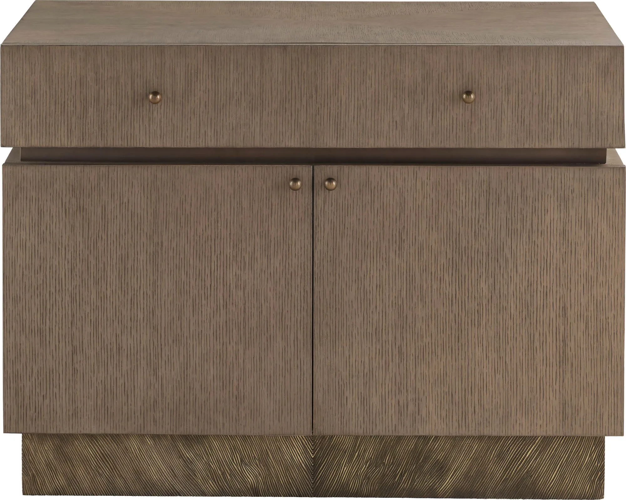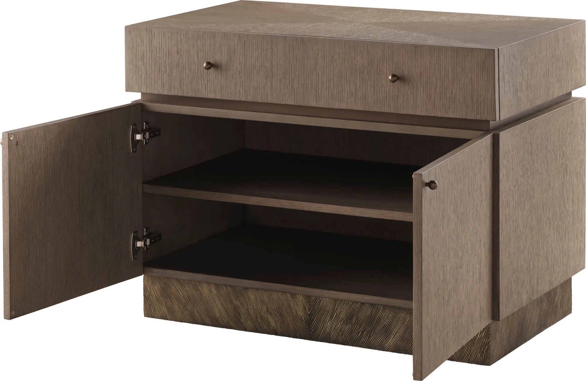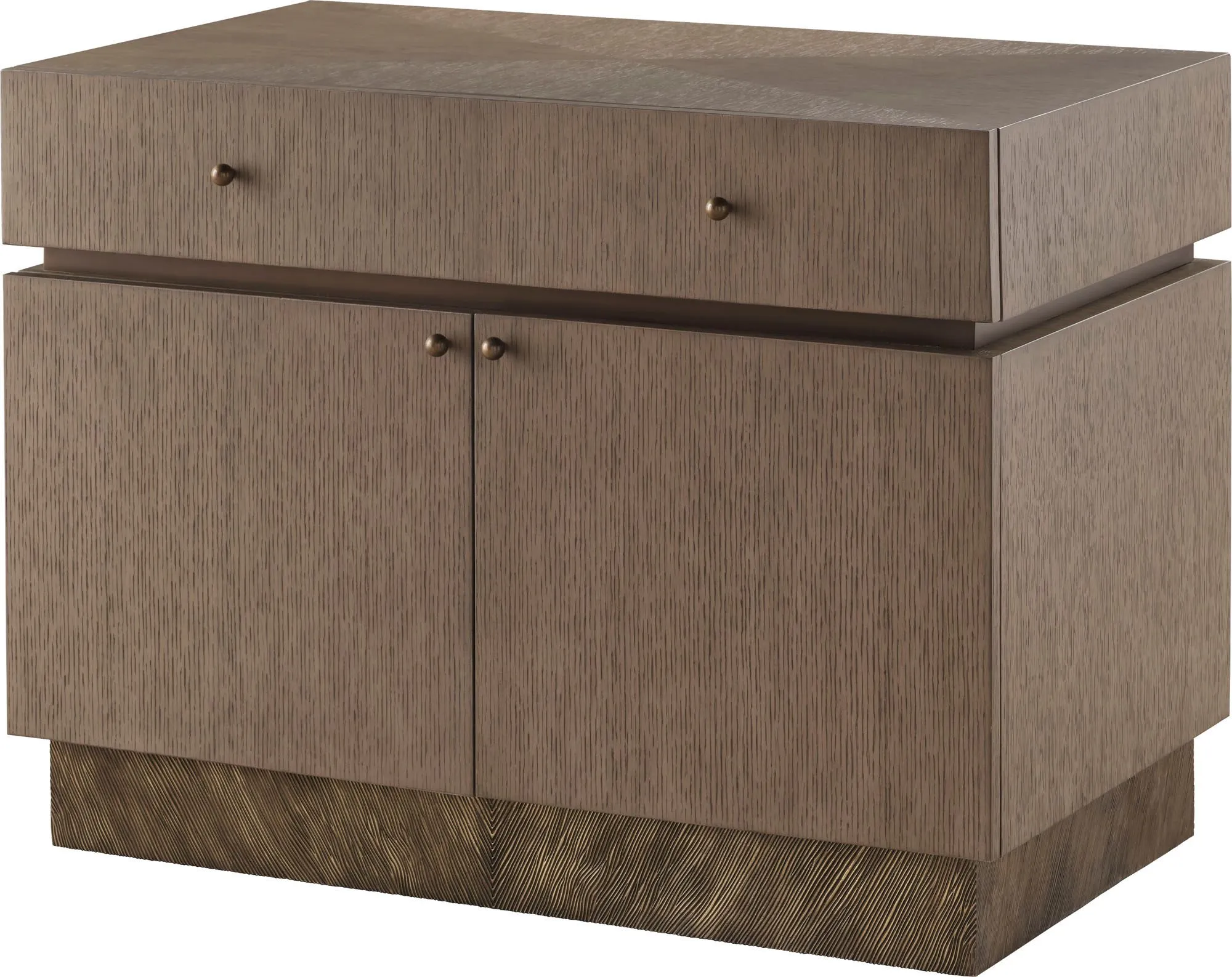 The Malia Bedside Table displays one of this collection’s trademark design cues: the pairing of richly grained oak veneer with a molten metallic base in cast bronze that evokes the fluid energy of lava. Named after the lava dome on the island of Crete, it is a strong, yet elegant expression of natural materials and their innate beauty.