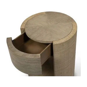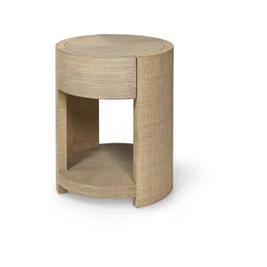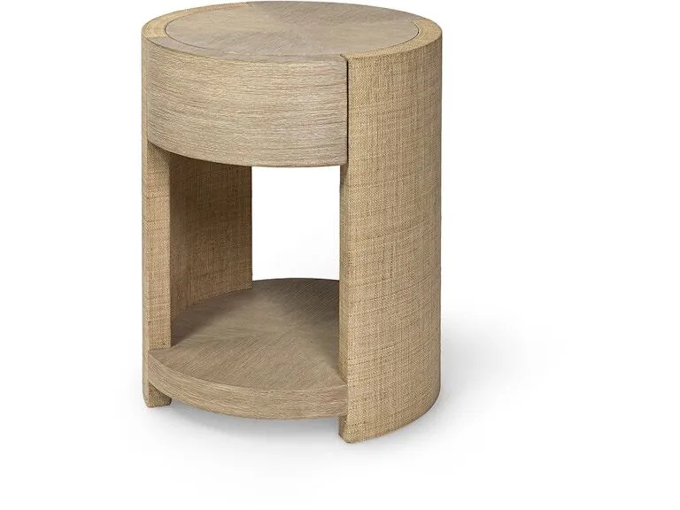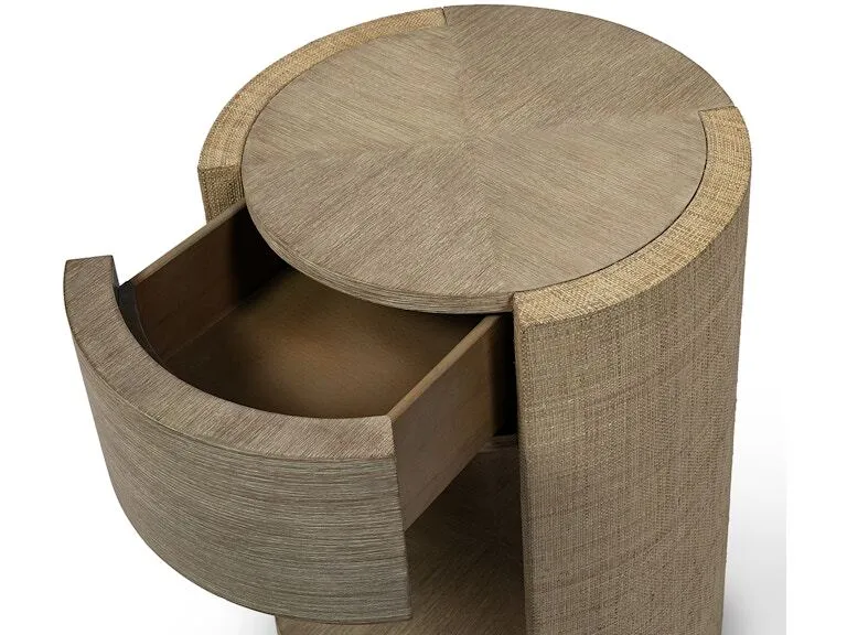 Natural raffia hand-applied over a hardwood frame featuring a natural oak wood veneer top, shelf and drawer front in natural finish. Drawer with a small hidden cutout handle. Raffia is stain resistant and will vary in color and texture.