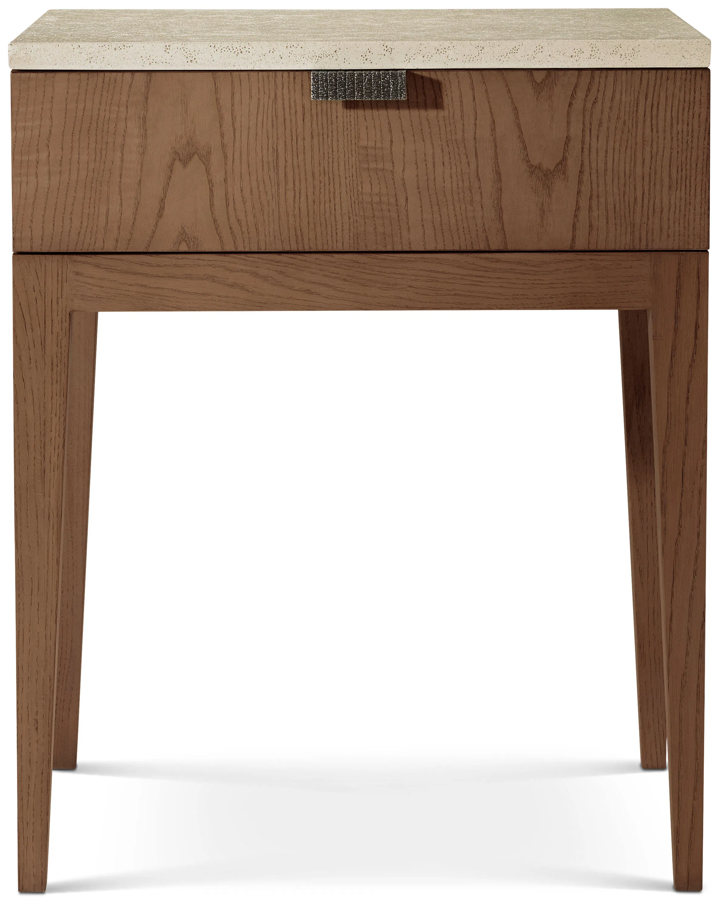 A modern single drawer nightstand perfect for any bedroom. Seen here in clean cut figured ash available in Dune or Earth with a textured metal pull in Ember finish. Completed with a stone-like porous top in our exclusive Mineral finish.
