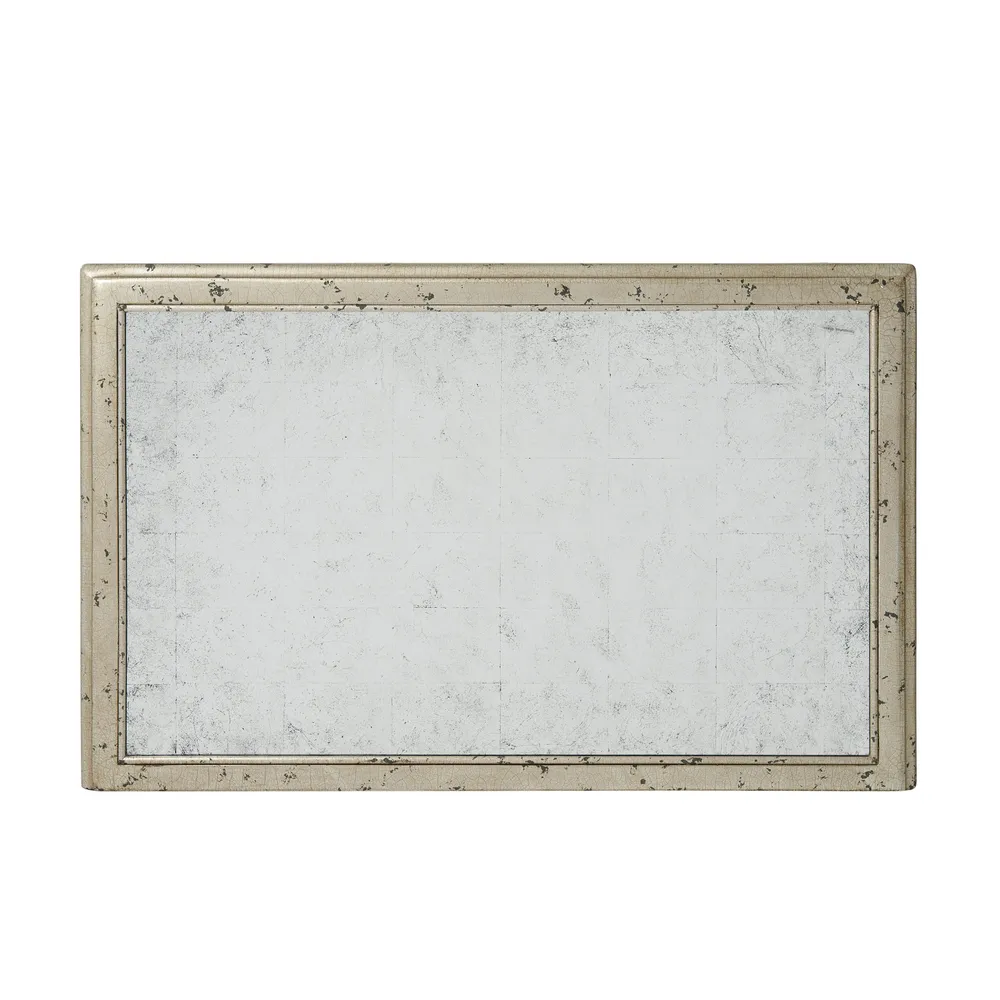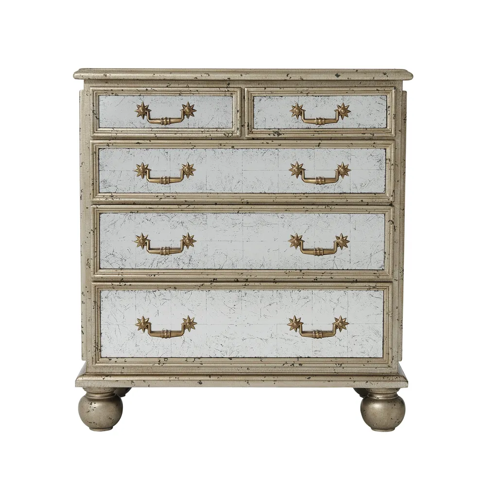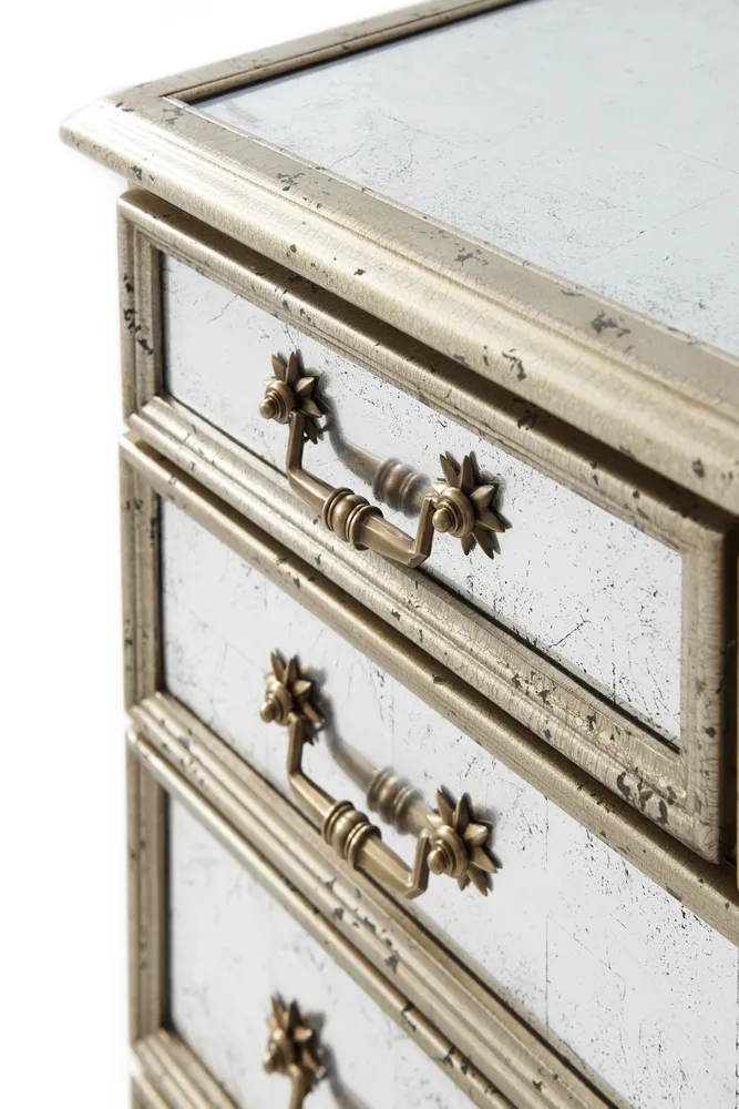 A silver leaf and antiqued trellis hand mirrored chest of drawers, the rectangular mirror panelled top above two short and three long drawers fitted with brass handles, on bun feet. Inspired by a 1930s Italian original.