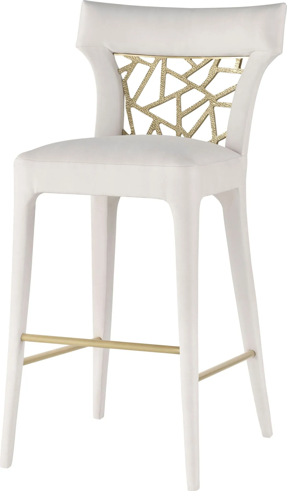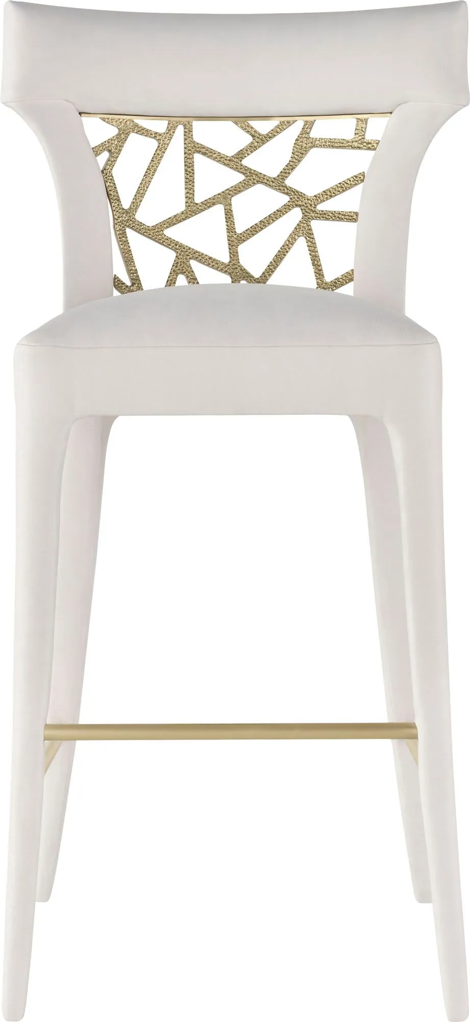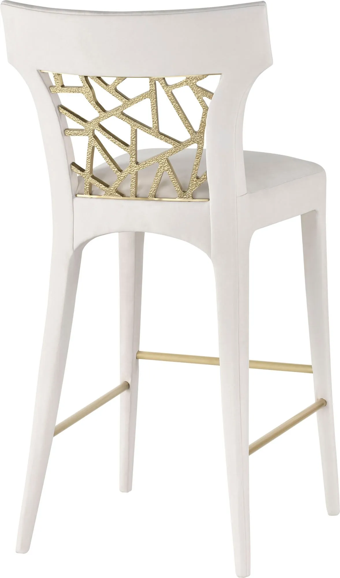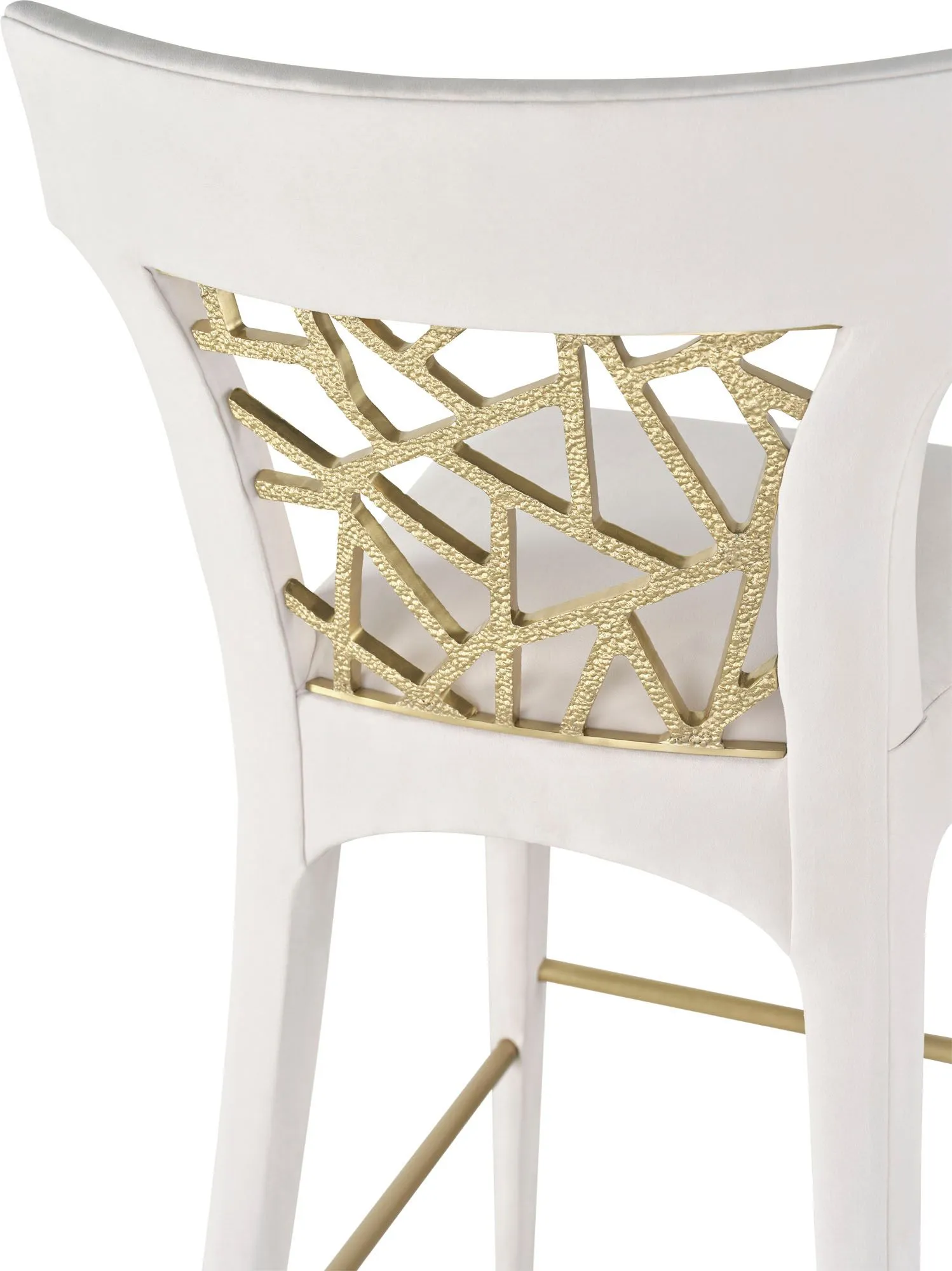The Filigree Barstool shows off an ornately patterned back plate made in Liquid Bronze. Its form was inspired a bronze threaded lace-back cocktail dress.