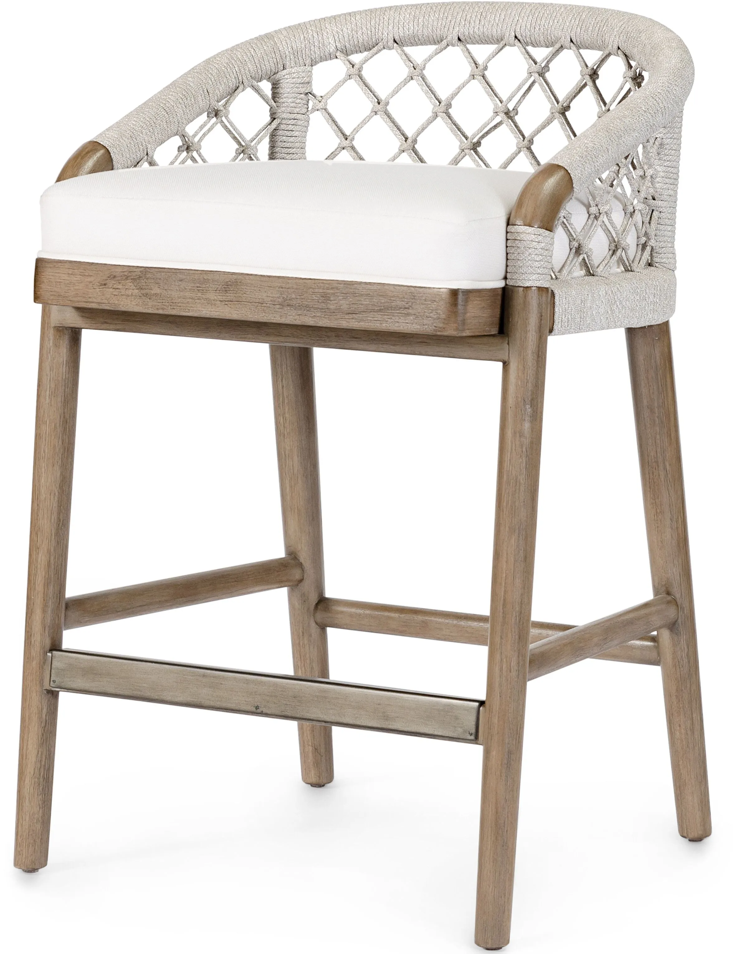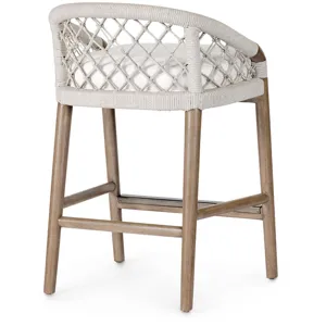 Hand-distressed hardwood frame and legs in a brown wash finish with hand-woven synthetic rope. Barstool comes with a pewter finish metal footrest on the front stretcher and a fixed upholstered seat. Coordinates with the Otis collection. Stool is also available with a 26" (701179) or 30" (702479) seat height.