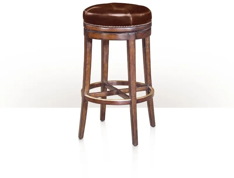 A swivel bar stool, the circular button upholstered turning seat above splayed legs joined by a brass mounted ring stretcher. The original Victorian.