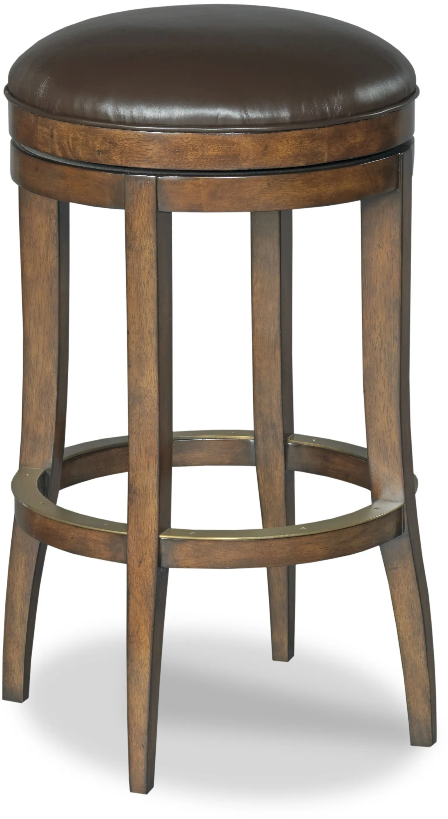 A circular upholstered swivel seat is upholstered with leather, elevated by four flared posts that are joined by a circular stretcher rails.