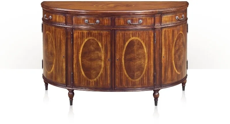 A movingue bowfront side cabinet or buffet, the frieze with four drawers and four cerejeira oval panelled doors below enclosing adjustable shelves on turned legs. The original Regency.