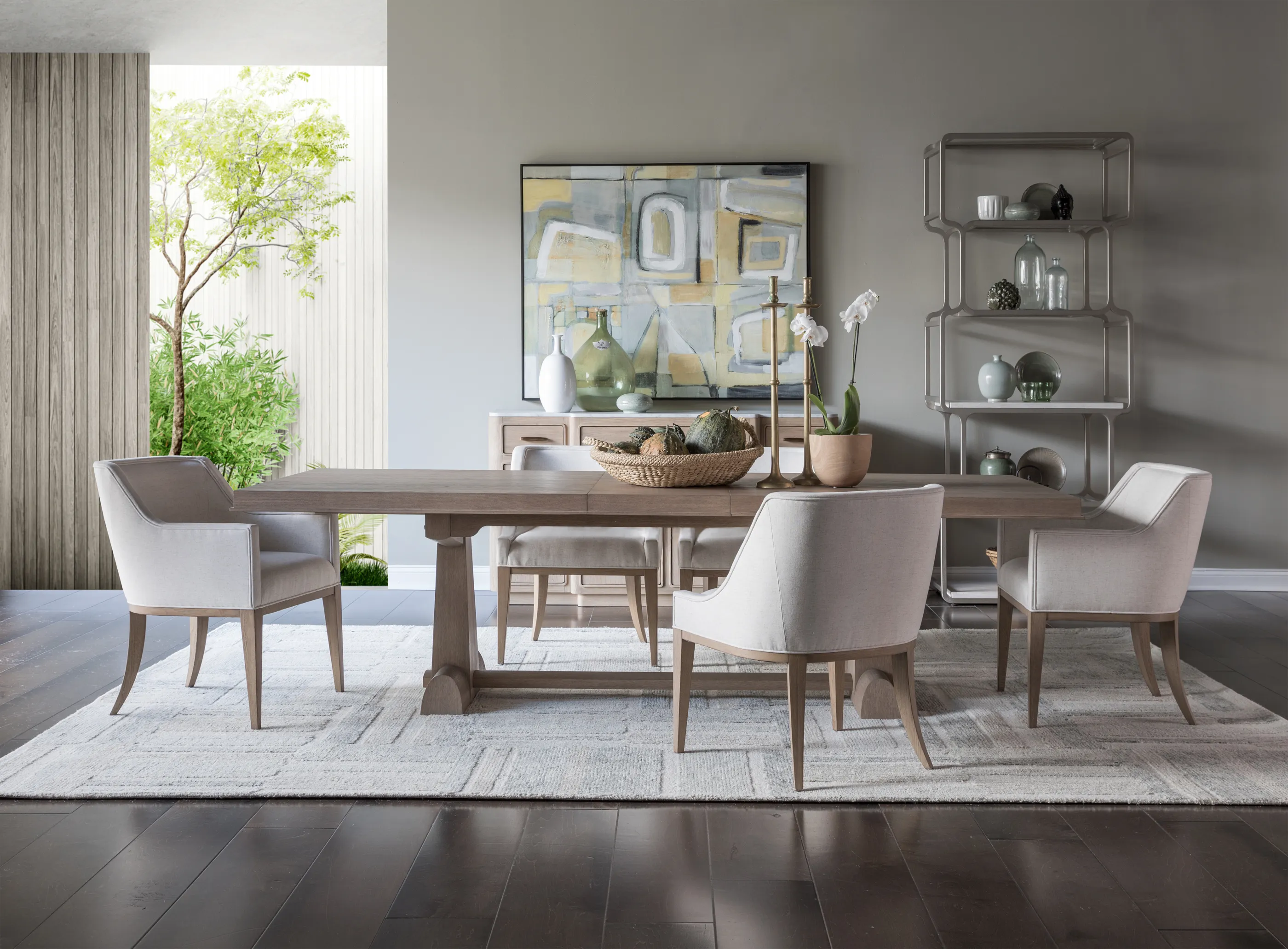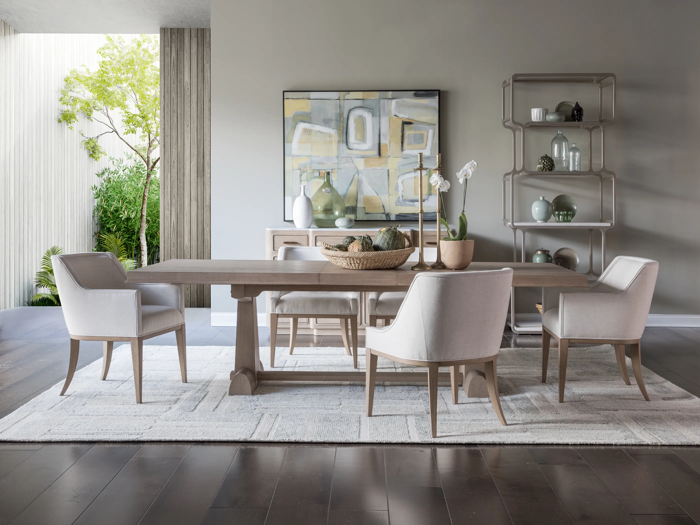 Great Room collection featuring New Traditional to Transitional original designs dressed in a natural white oak finish with light wire brushing and a silky, dry hand and appearance. Accent materials include Italian Carrara marble, natural seagrass, iron, and nature-form castings of Brazilian slate finished in champagne bronze. The term New Traditional is overused and typically undefined. To us, it means taking forms that have existed for many generations and interpreting them into the present as fresh and versatile designs with textural, on-trend finishes and materials...Simpatico represents exactly that.