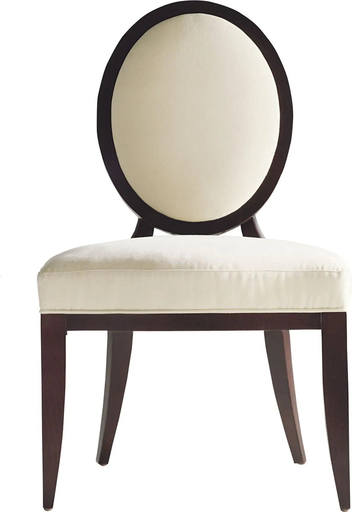 Bearing the signature Barbara Barry X-back, the oval dining chair features a refined wood frame and inset upholstered back.