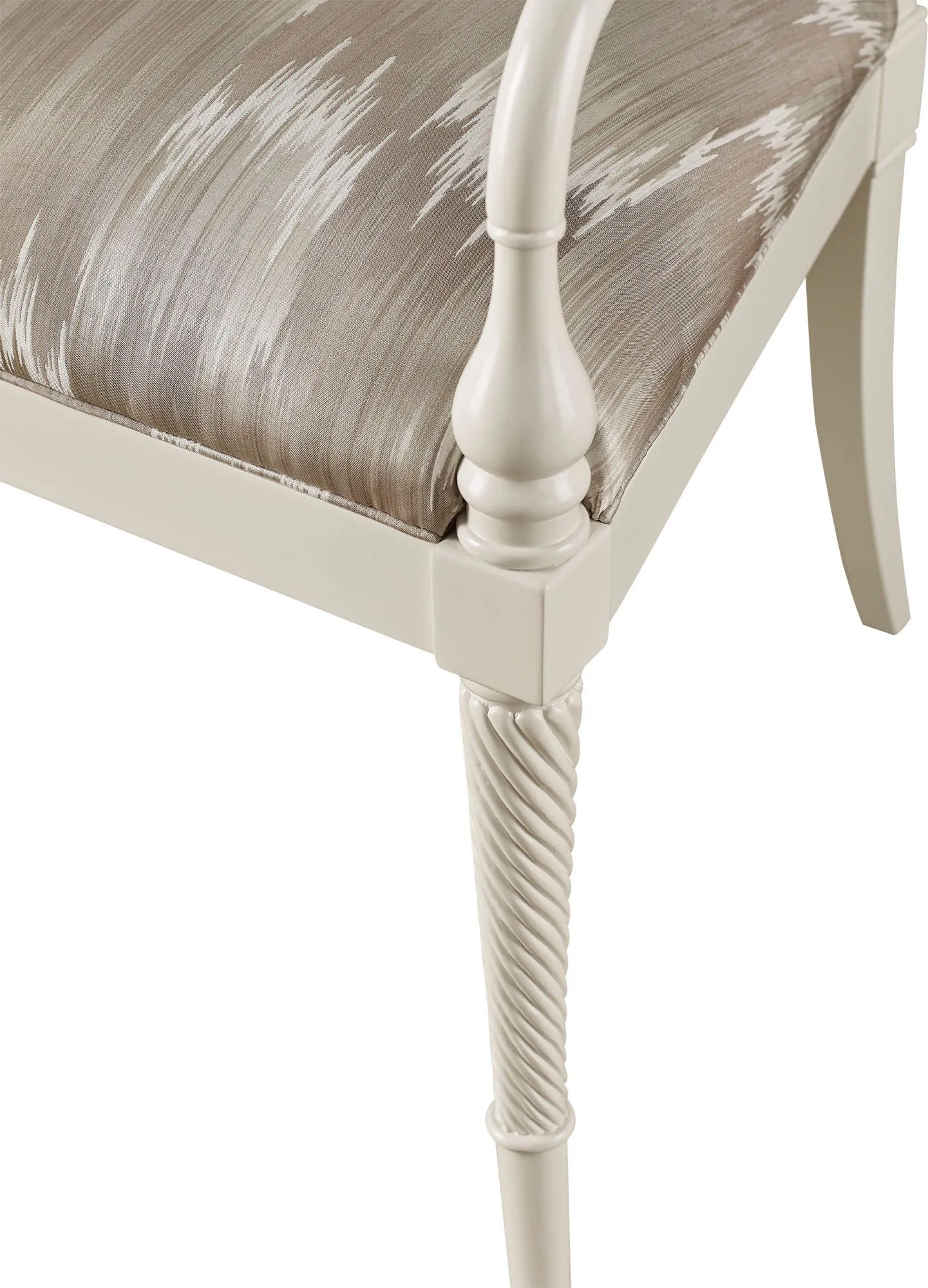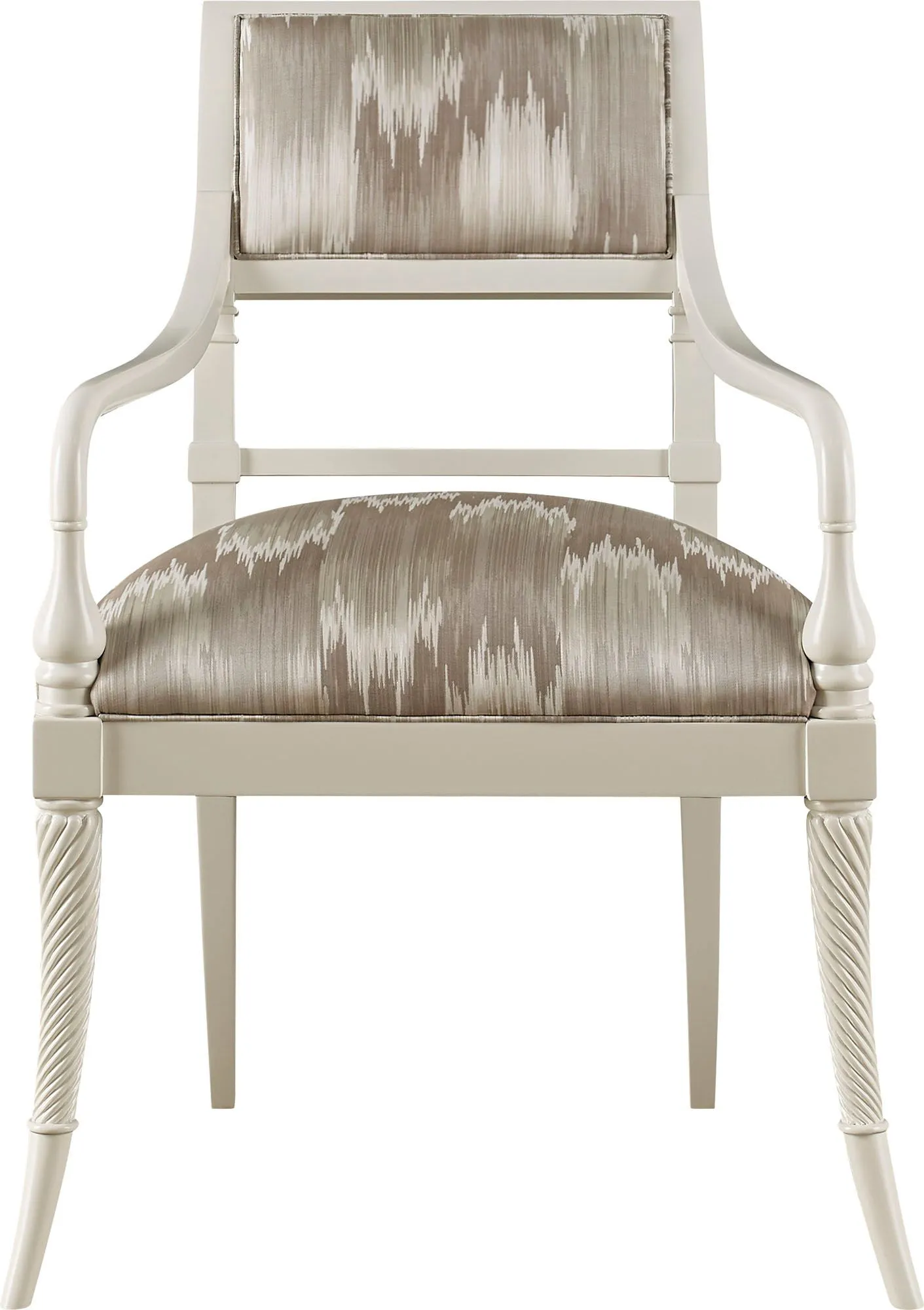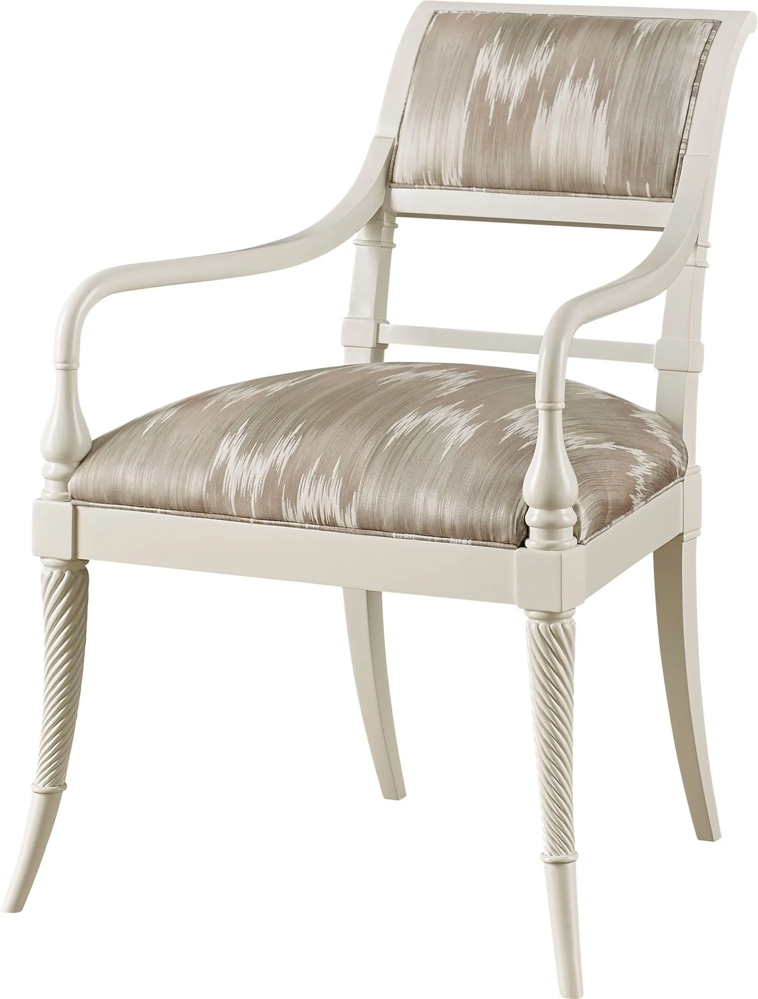Sharp, sleek and regal, the King George III Arm Chair rises from sabre-shaped and spirally reeded legs, culminating in a decorated seat frame with boldly scrolled arms. It embodies England, circa 1800.
