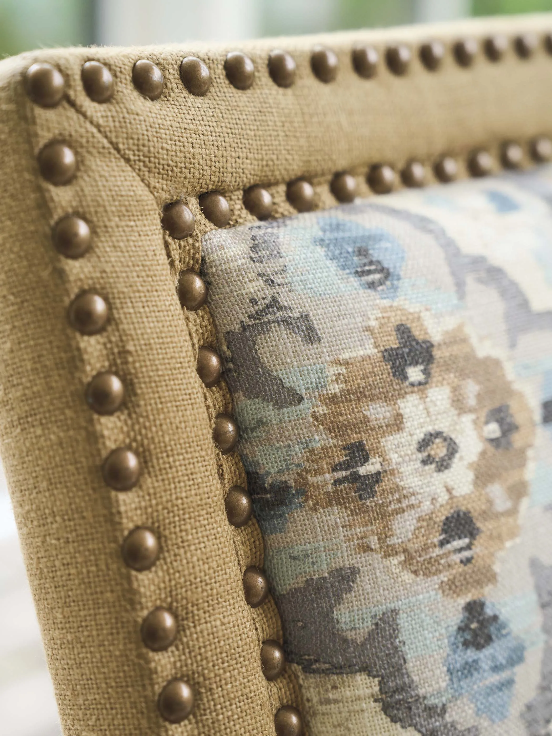 At 42-inches in height, the Anderson arm chair makes a strong design statement. They feature a double row of nailhead trim around the seats and backs. The standard fabric is 2200-11 Seabridge which is an indoor performance fabric in shades of ivory and camel. Nailhead trim, in your choice of finishes, is standard on both the fabric and leather versions of the chair. The design is available in custom fabrics, leathers, or a combination.