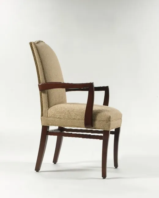 Pamlico 04-3051 Arm Chair Camelback Camelback side chair with saber shaped exposed wood legs. The camelback is accentuated with double row small nail head trim. The thin seat and seat border, thin exposed wood arms, along with the saber leg give this chair an updated look for today.