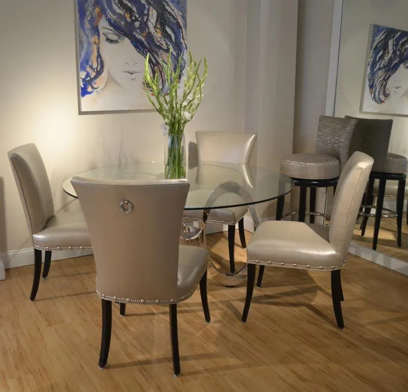 Set of 4 side chairs - The Danbury dining chair, inspired by our best selling dining stool, the Danbury, is a great transitionally styled chair that will fit into many different home décor styles. Notice how the clean lines of the flared back of the chair flow down from the curved top rail into a narrow waist at the chair seat. The seat rails of the chair curve around to meet the back's narrow waist. Delicate saber shaped exposed wood front leg posts and flared wood back leg posts complete this beautiful chair. The chair is shown in a grey texture with a hint of silver metallic, optional small polished nickel nail head trim and Walnut standard finish. The chair is simple in design and yet large in style.