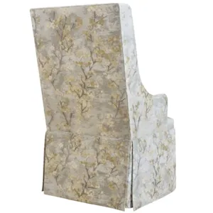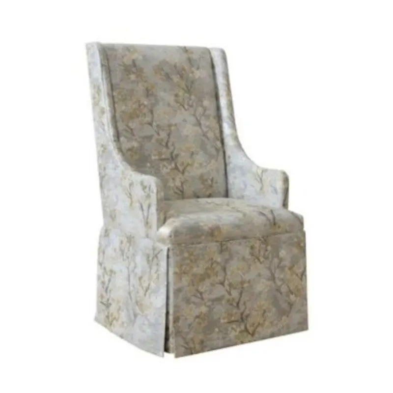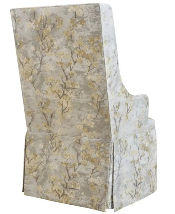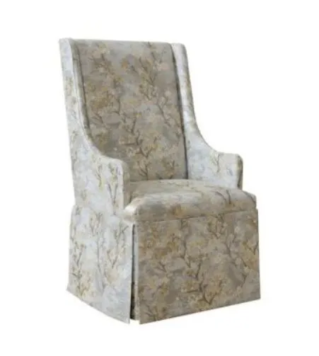 This chair features a tall back framed by thinly upholstered wing panels. The tightly upholstered seat is surrounded by the well-tailored dressmaker skirt. The arm chair is taller and wider than the side chair, giving this chair more presence at the ends of a dining table.