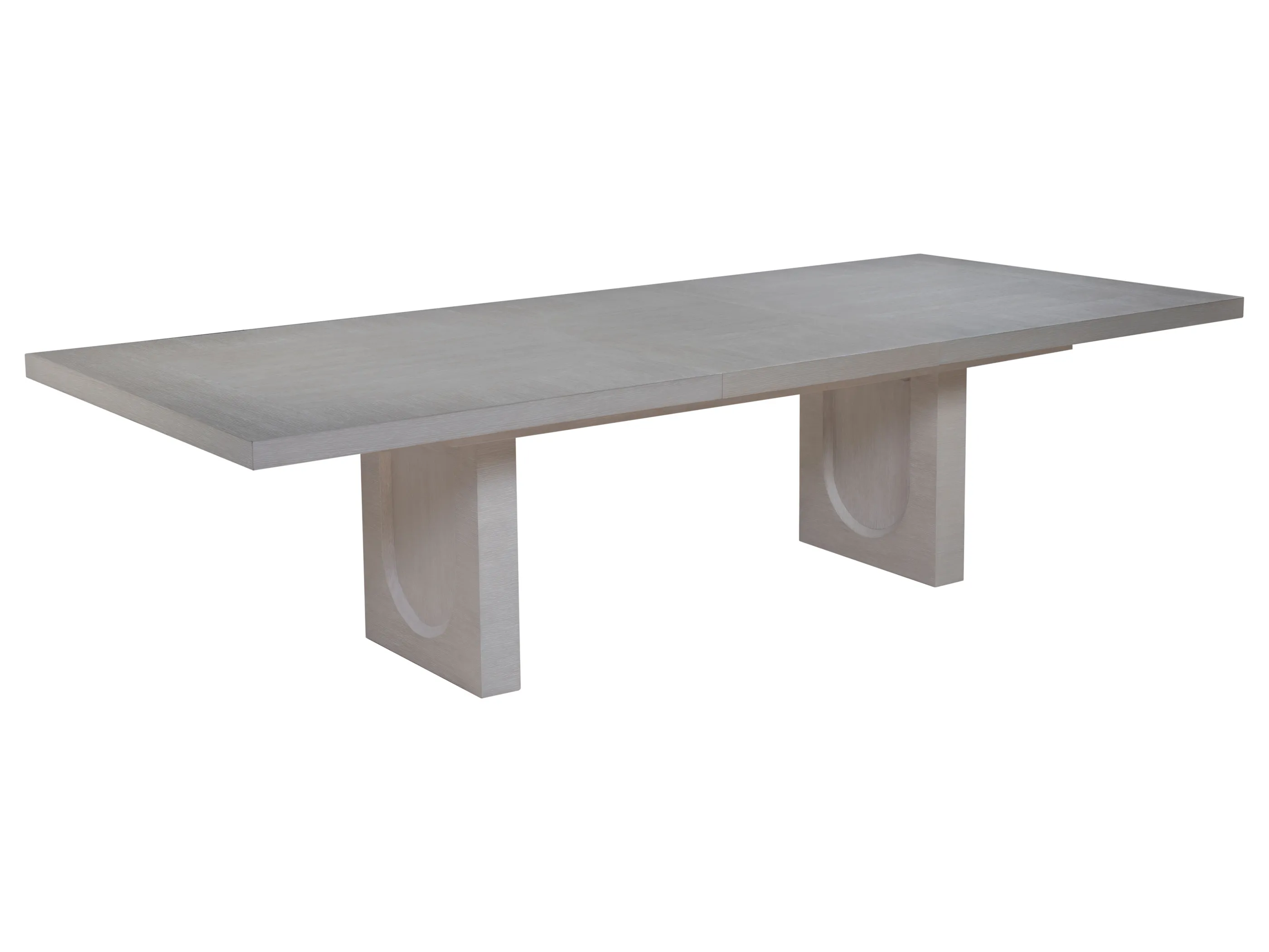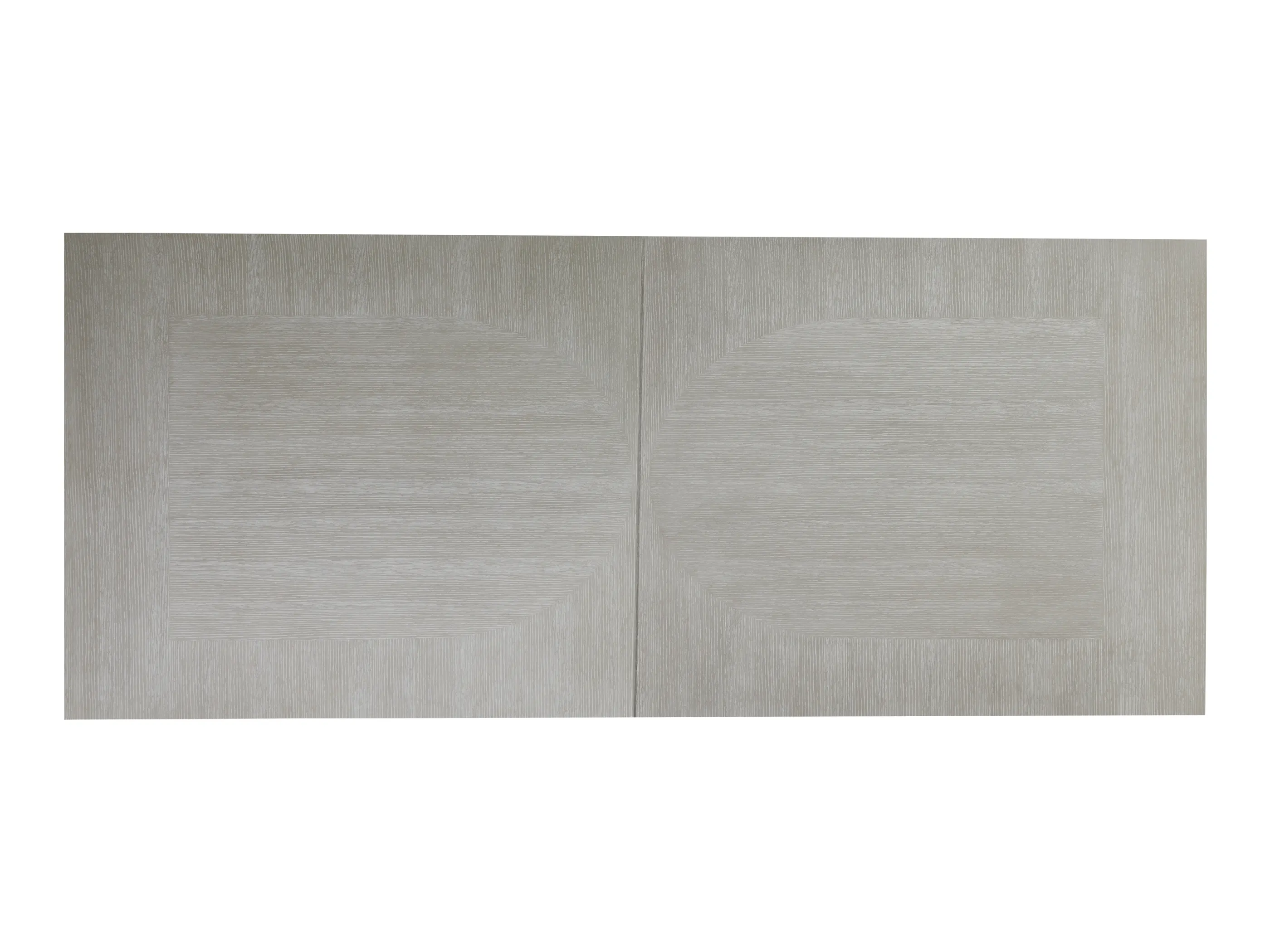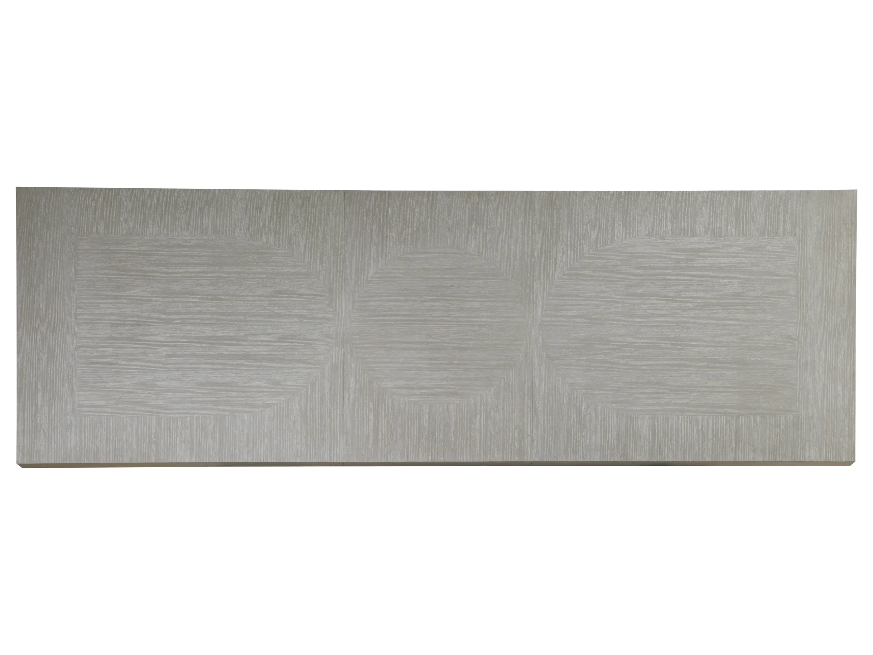 Architectural sled bases with Solimar’s early 1970’s half-oval motif recessed in the panels and subtly repeated in the white oak quarter grain pattern in the top. Extends from 88 to 114 inches with one 26 inch leaf and equalizing slide mechanism, accommodating ten.