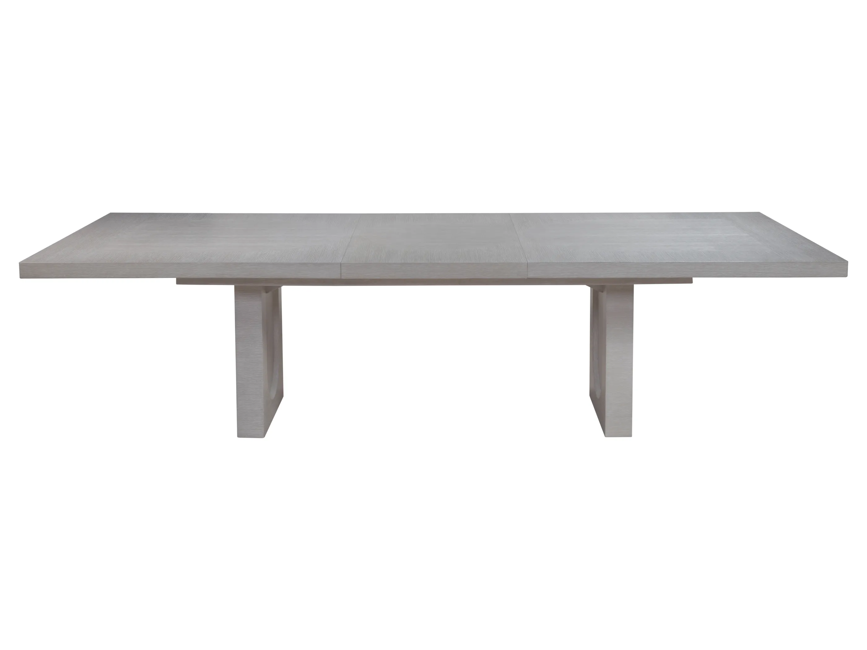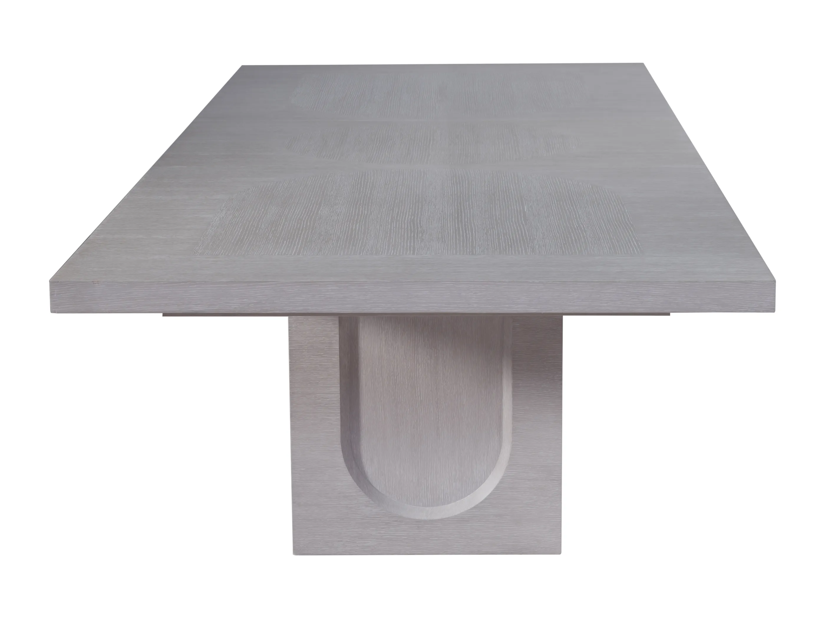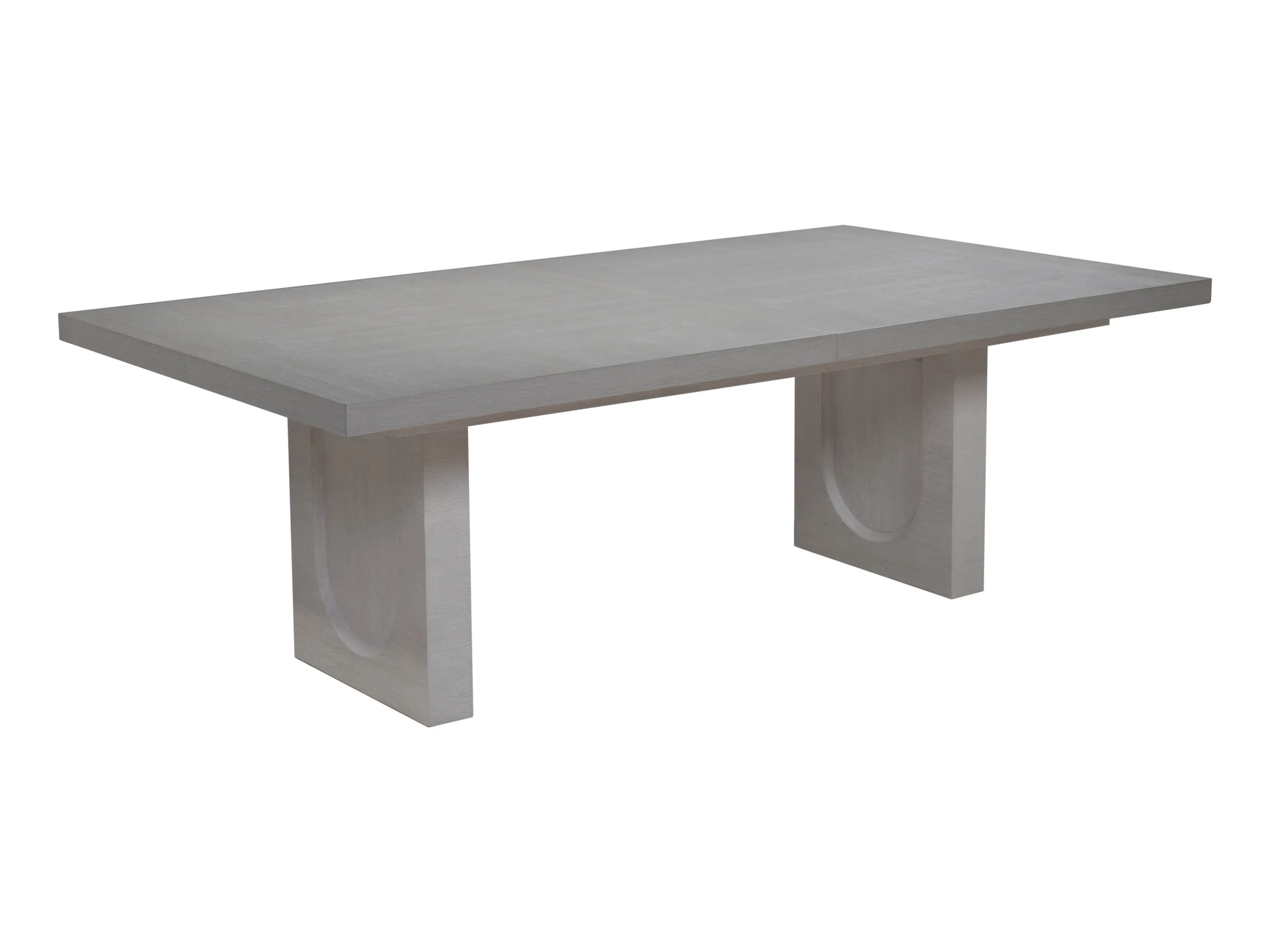 Architectural sled bases with Solimar’s early 1970’s half-oval motif recessed in the panels and subtly repeated in the white oak quarter grain pattern in the top. Extends from 88 to 114 inches with one 26 inch leaf and equalizing slide mechanism, accommodating ten.
