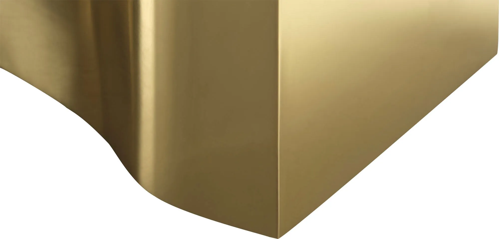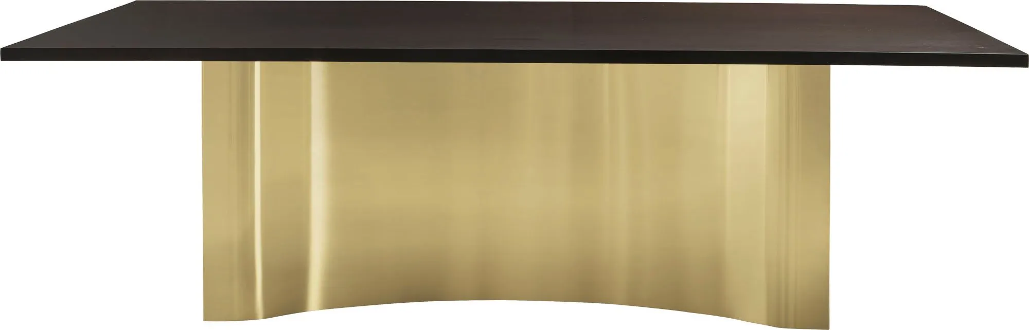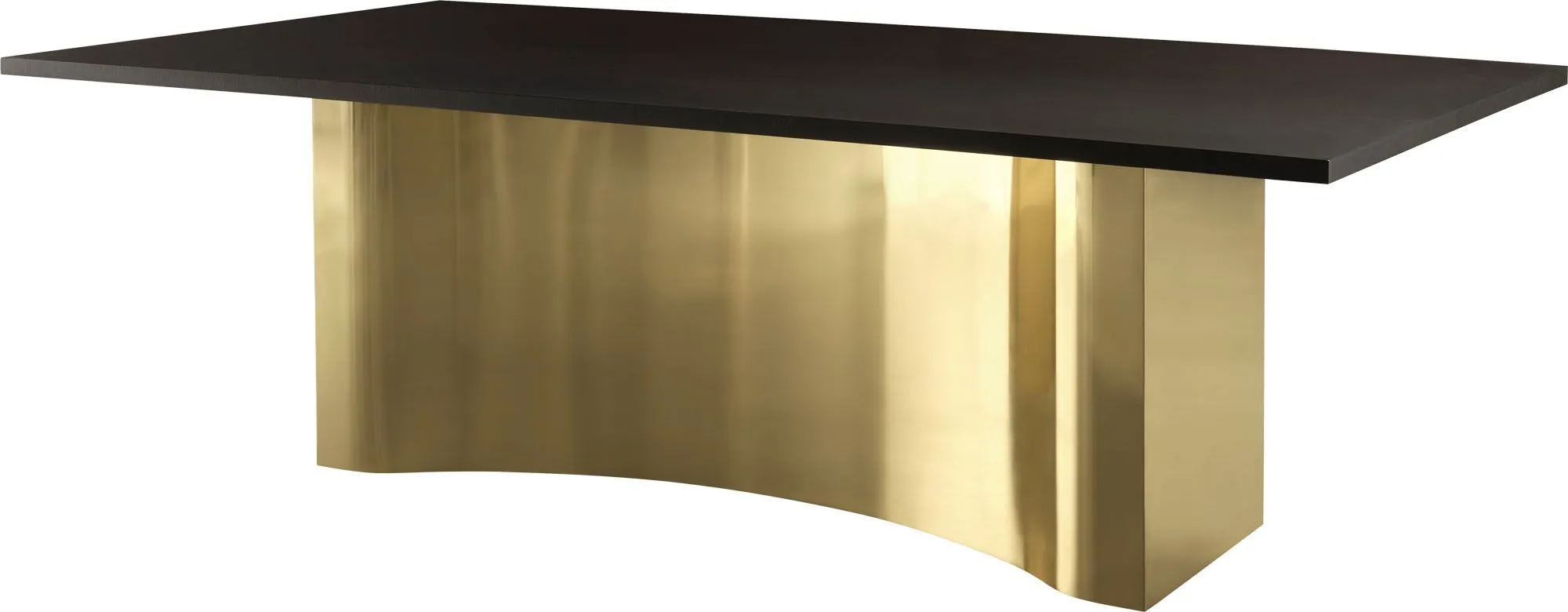 The Aurora Dining Table features a softly undulating Pure Brass base that creates a tranquil, calming effect. The table is inspired by the flowing fabric and graceful movements of a model walking down a runway. Its tabletop is carefully crafted in quartered oak veneer.