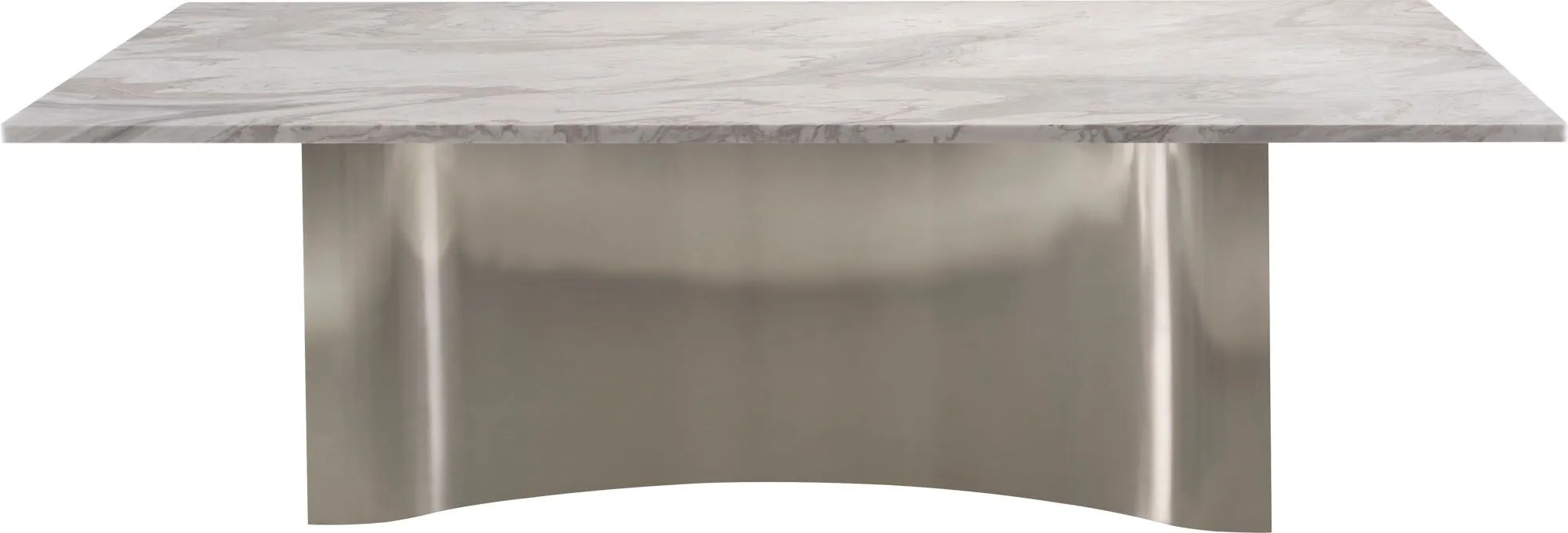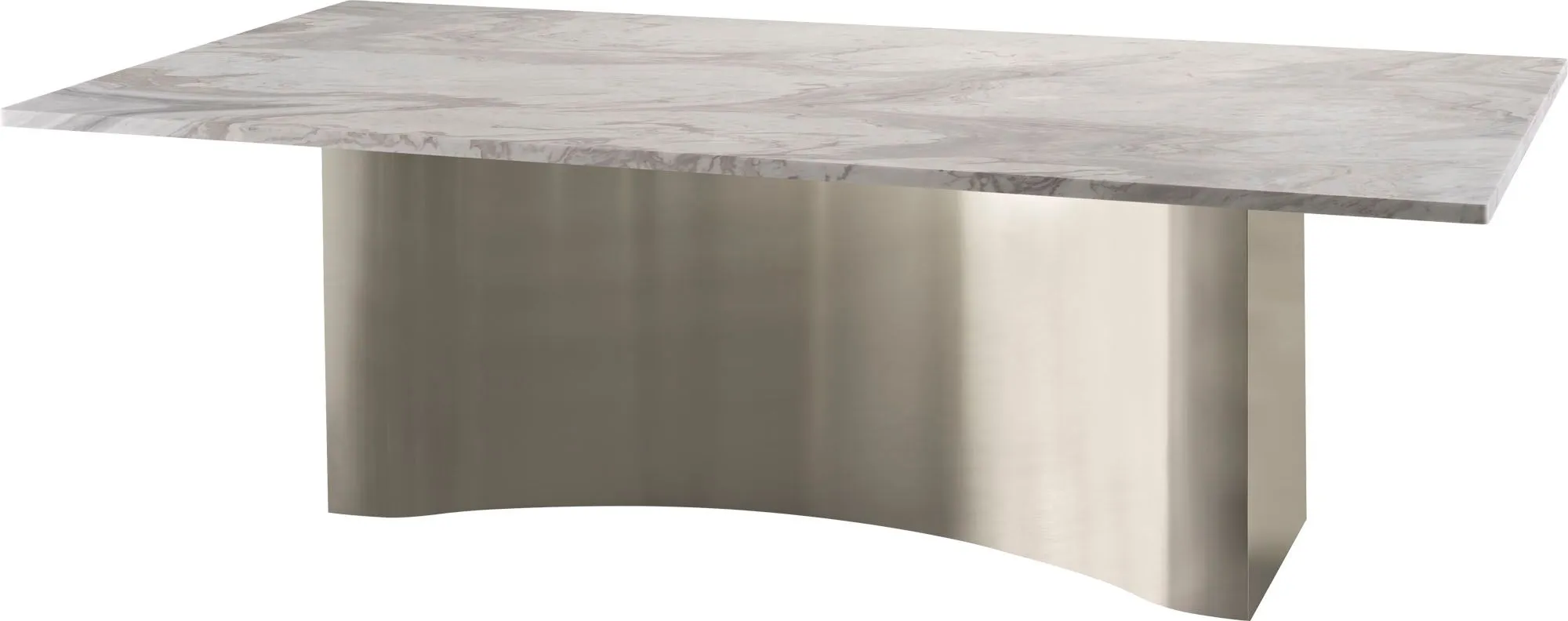 The signature feature of the Cassidy Dining Table is its softly undulating Nickel Plated Brass base, which calls to mind the gentle flowing of fabric in the wind. The table offers a stunning tabletop in polished Hena White marble, which pairs well with wooden elements in any space.